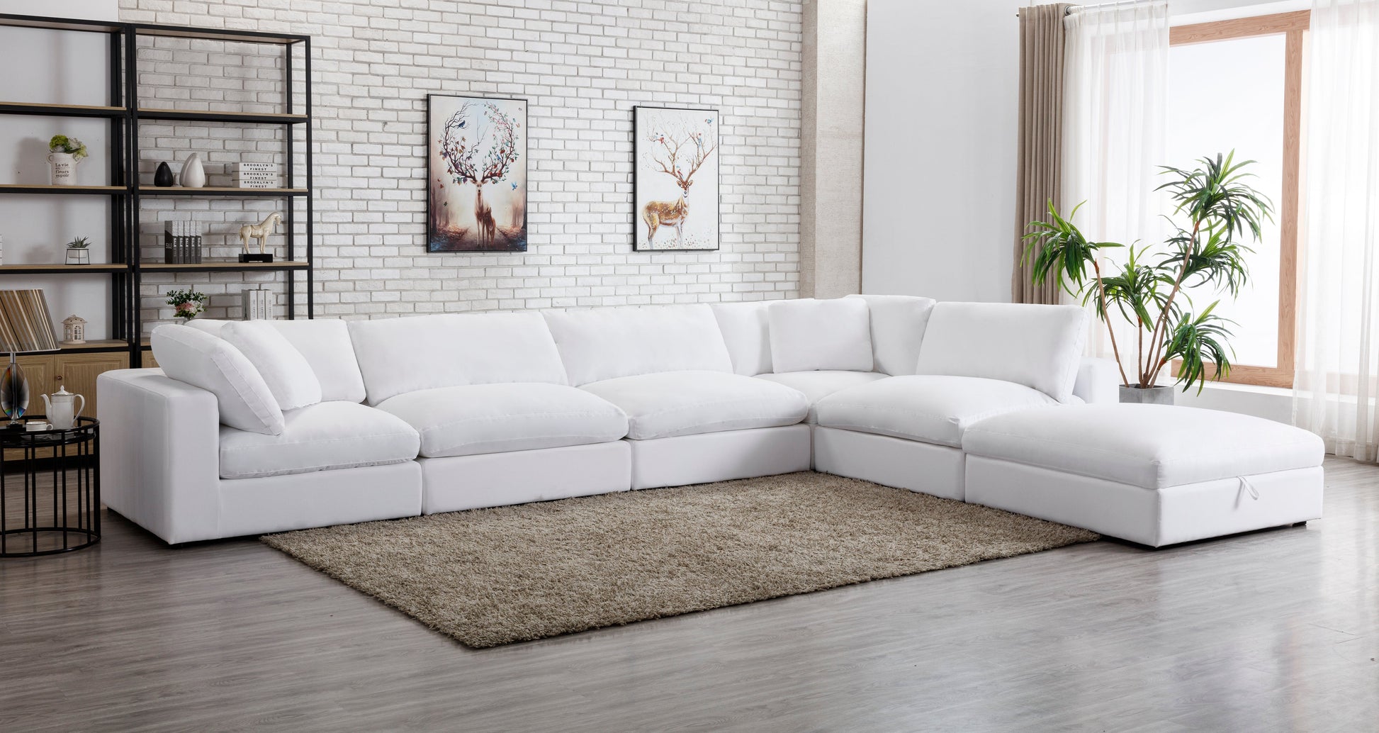 Rivas Contemporary Feather Fill 6-Piece Modular Sectional Sofa with Ottoman, White