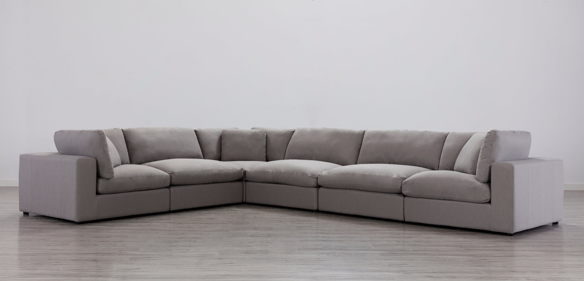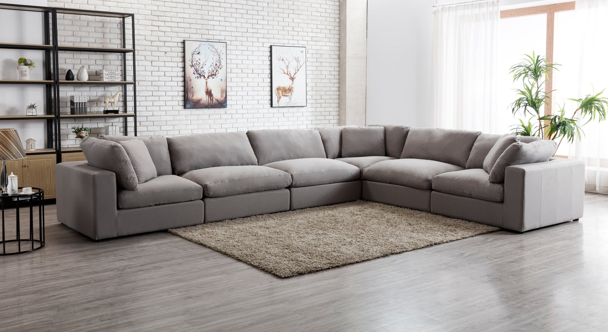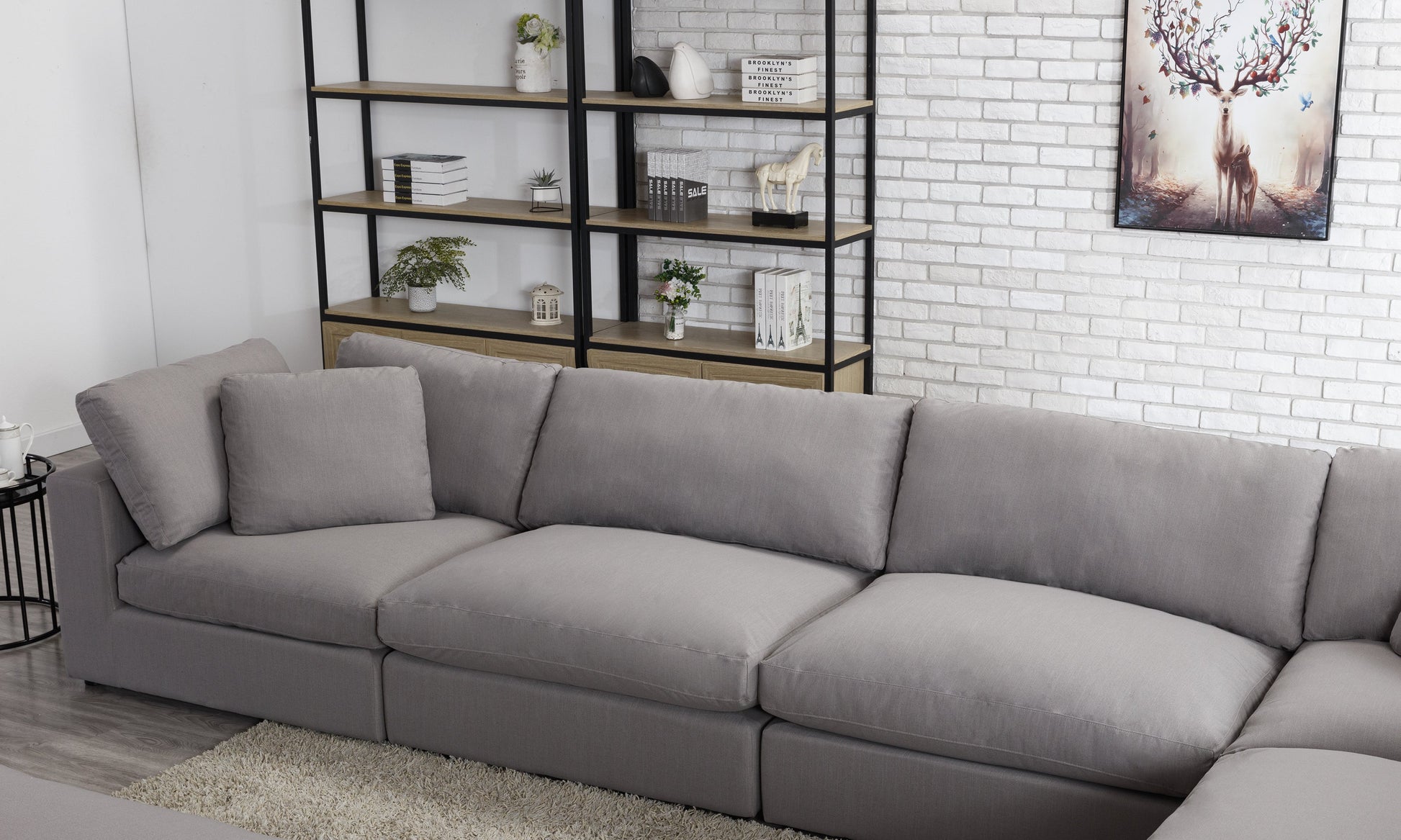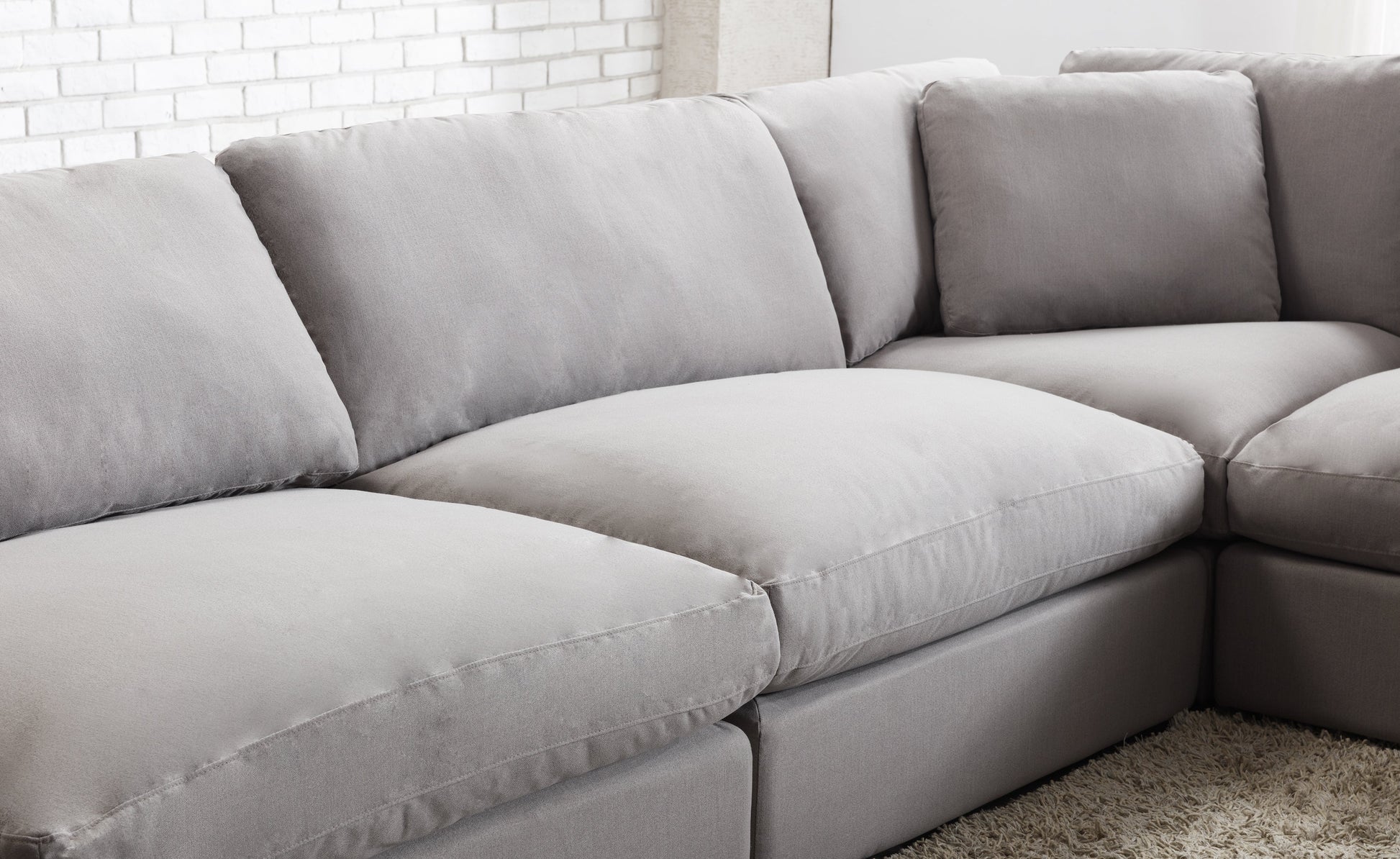 Love the way you lounge with the Rivas Contemporary Feather Fill Modular Sectional Sofa. This cloud-like modular sofa can be configured in any shape and space. The pieces have plush, breathable polyester blended upholstery in your choice of color. The feather-filled cushion provides a plush seating experience, supported by sinuous springs. The performance fabric is made with stain-resistant technology, features moisture repellent and barrier protection that safeguards your sofa all the way through. The durability of the fabric keeps your furniture looking and feeling as beautiful as the day you brought it home.