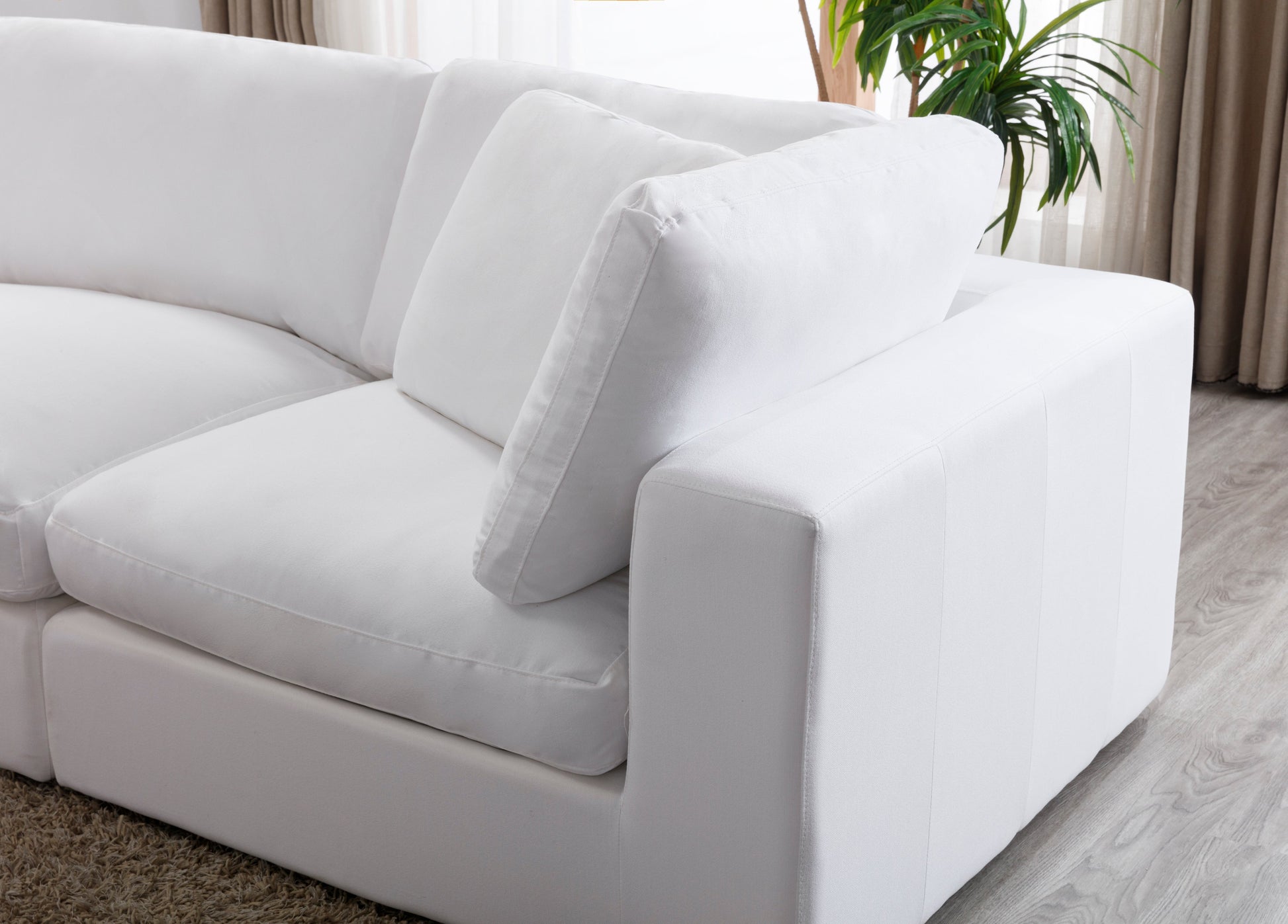 Love the way you lounge with the Rivas Contemporary Feather Fill Modular Sectional Sofa. This cloud-like modular sofa can be configured in any shape and space. The pieces have plush, breathable polyester blended upholstery in your choice of color. The feather-filled cushion provides a plush seating experience, supported by sinuous springs. The performance fabric is made with stain-resistant technology, features moisture repellent and barrier protection that safeguards your sofa all the way through. The durability of the fabric keeps your furniture looking and feeling as beautiful as the day you brought it home.