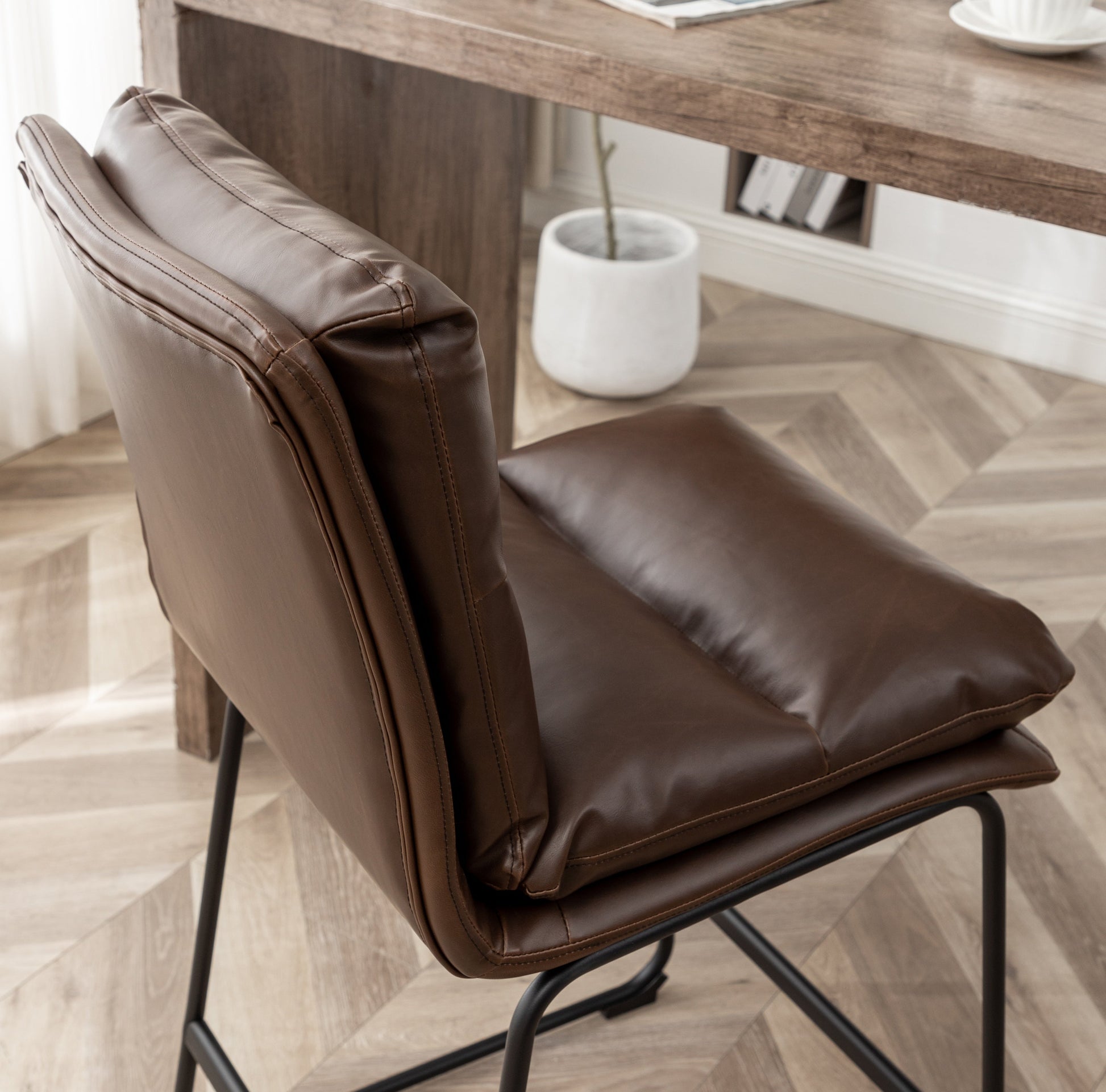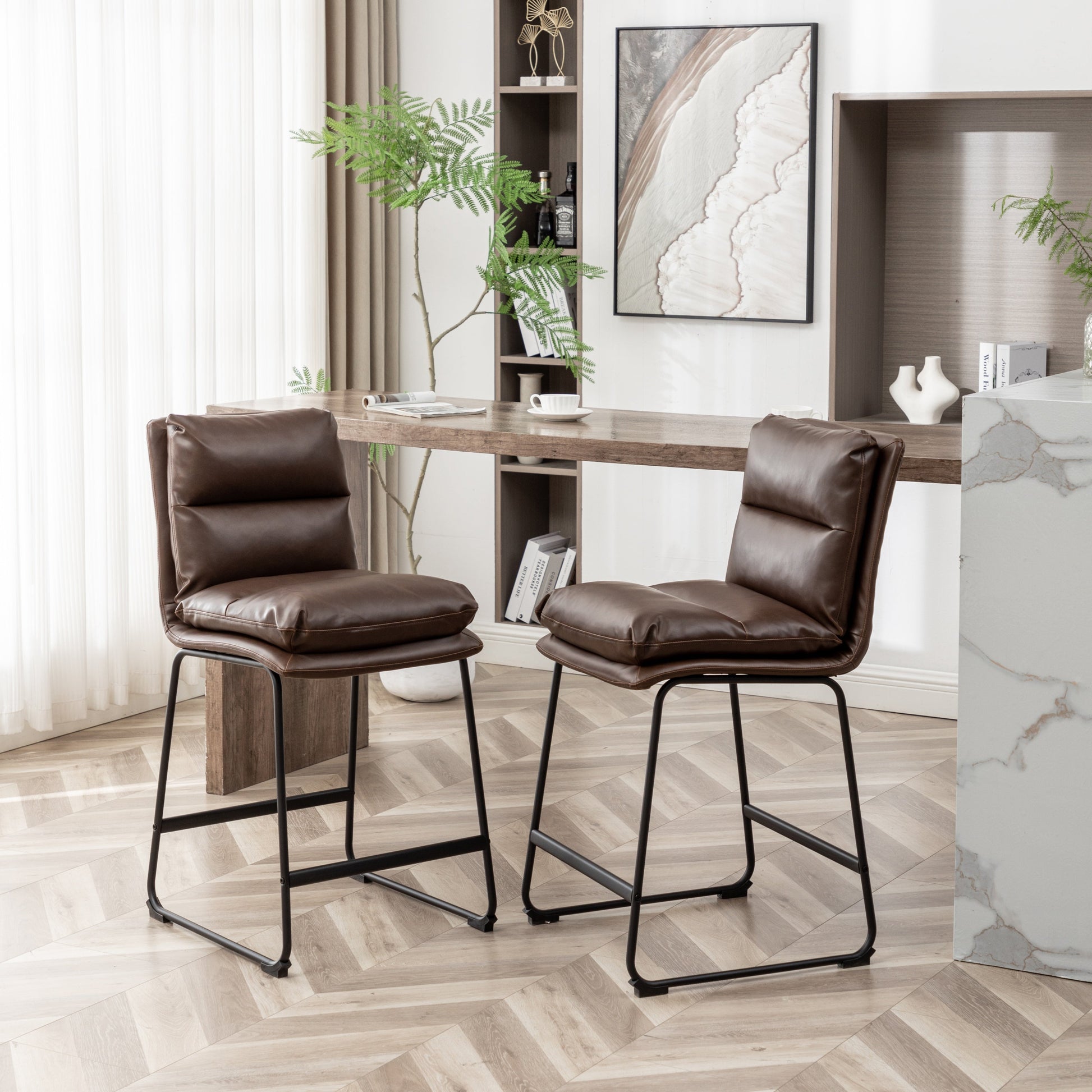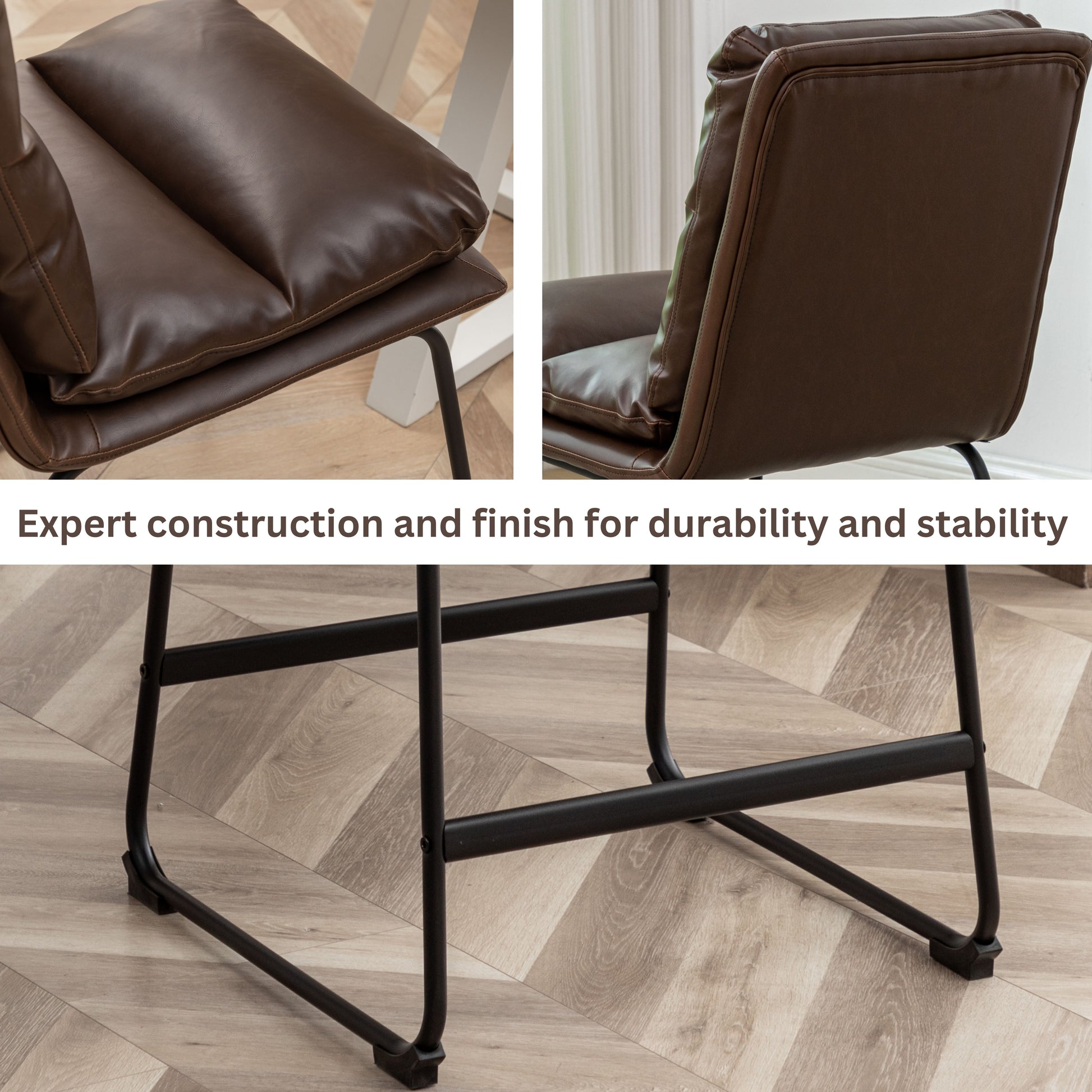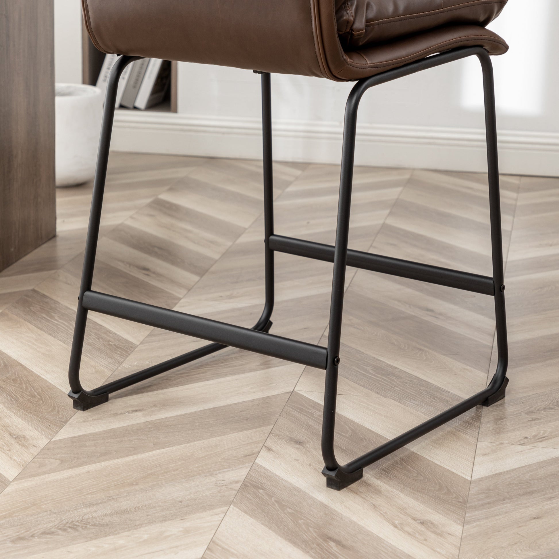 Meet the Roundhill Furniture Milos Upholstered 26-inch Counter Height Stools - a set of two stools that perfectly blend luxury, comfort and durability. These meticulously crafted counter height stools are a visual treat that adds a striking touch to any room. The sled-base design with a sleek matte black finish effortlessly enhances the décor of your dining area. The stool features a seat and back that are overfilled with faux leather(Antique Brown) /polyester blend(Vanilla White) for long-lasting comfort. The metal base provides uncompromising stability, and a footrest is available for added support and durability. The built-in floor protectors keep your floors free of scratches.