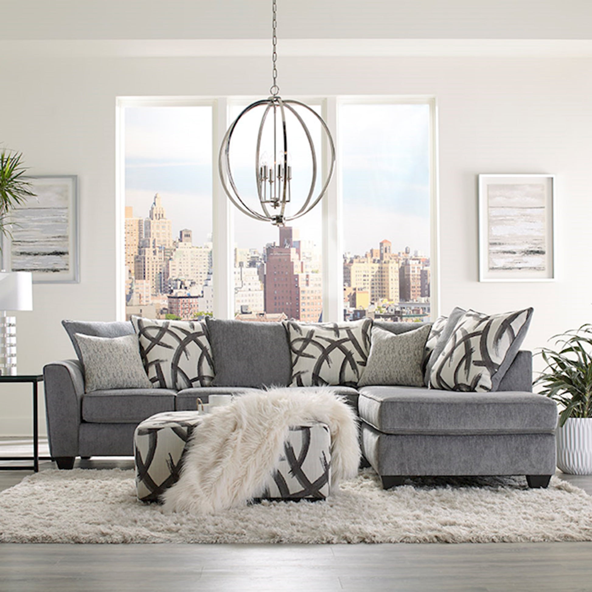 For daily use or putting up guests, the Montero Contemporary Gray Fabric Sectional Sofa is here to make any occasion a little easier. This modern sofa has a classic L-shaped design with a built-in chaise seat. The right-facing chaise makes it a cinch to stretch out, whether you're watching movies or visiting with friends. Durable hardwoods construct the frame, padded with high-density foam. Fine gray polyester upholsters the seat. The matching throw pillows are included.