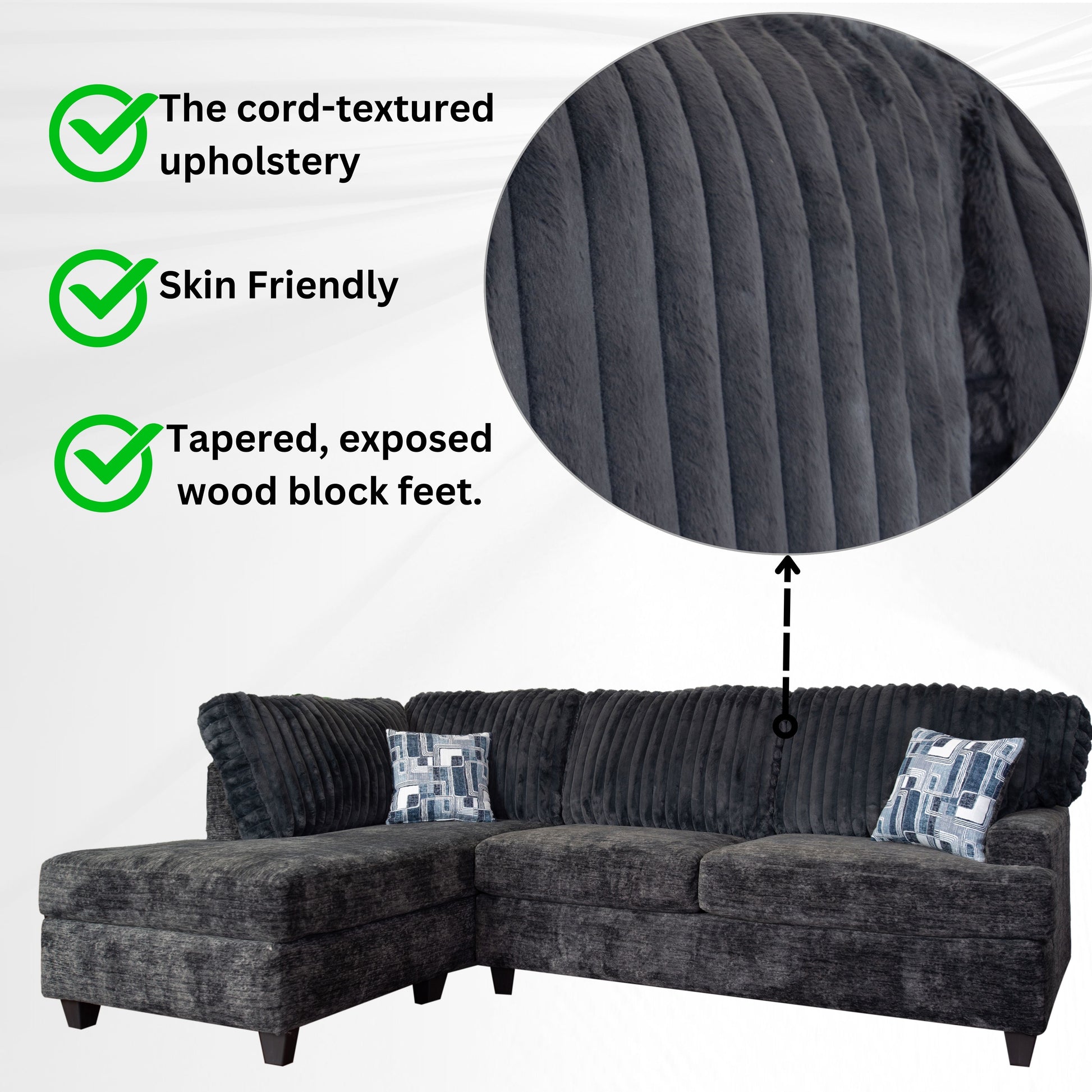 This Sectional has a plush, cord-textured upholstery, combined with reversible back cushions and matching accent pillows, ensure maximum comfort. The wooden frame and high-resiliency foam cushions offer durability for this set. The chic, exposed feet with a rich espresso finish add a touch of contemporary elegance. Immerse yourself in a serene retreat of relaxation with every moment spent on this collection.