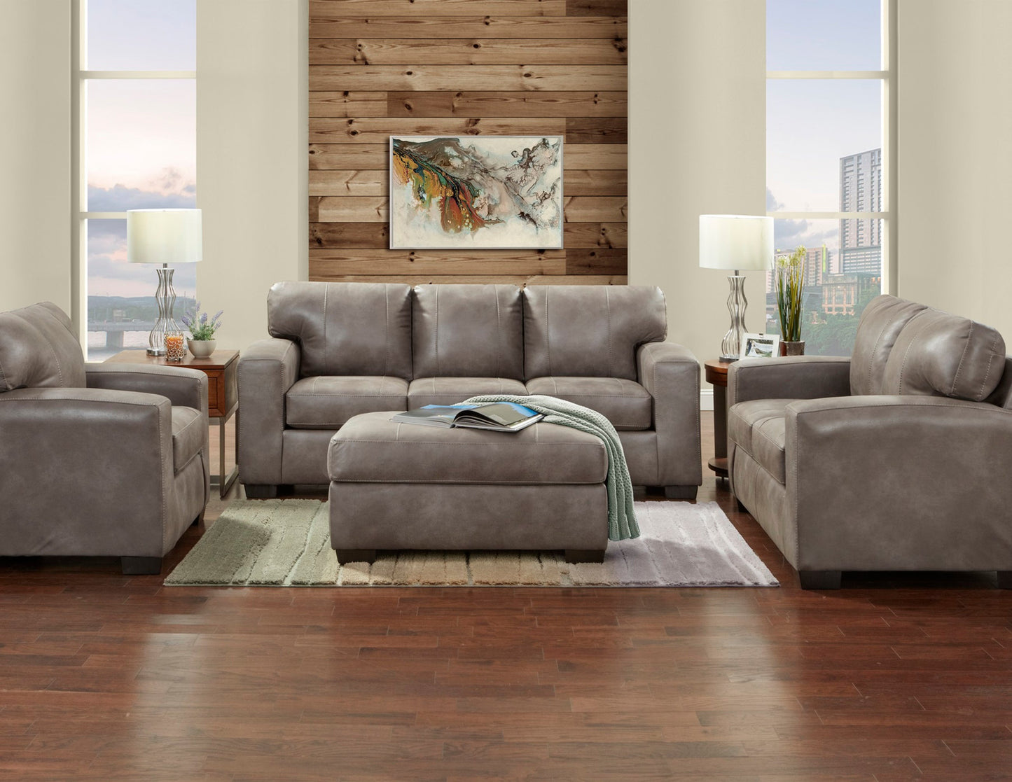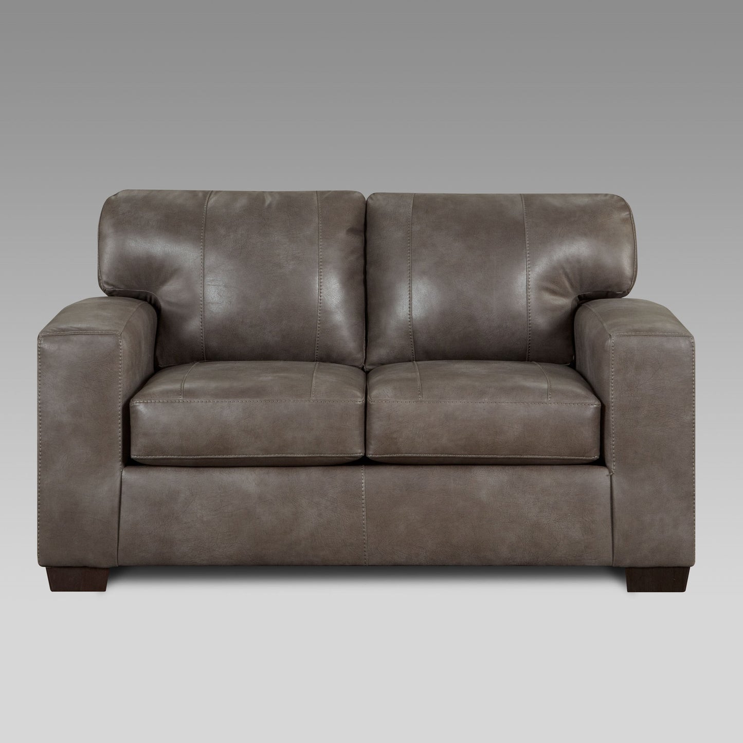Smarten up your living room with the Noel Weathered Brown Faux Leather Living Room Collection. Contemporary style points include track arms, boxy cushions, and weathered brown faux leather upholstery fabric that matches any decor. The sofa has a hardwood frame that's covered with thick foam padding beneath soft faux leather upholstery.