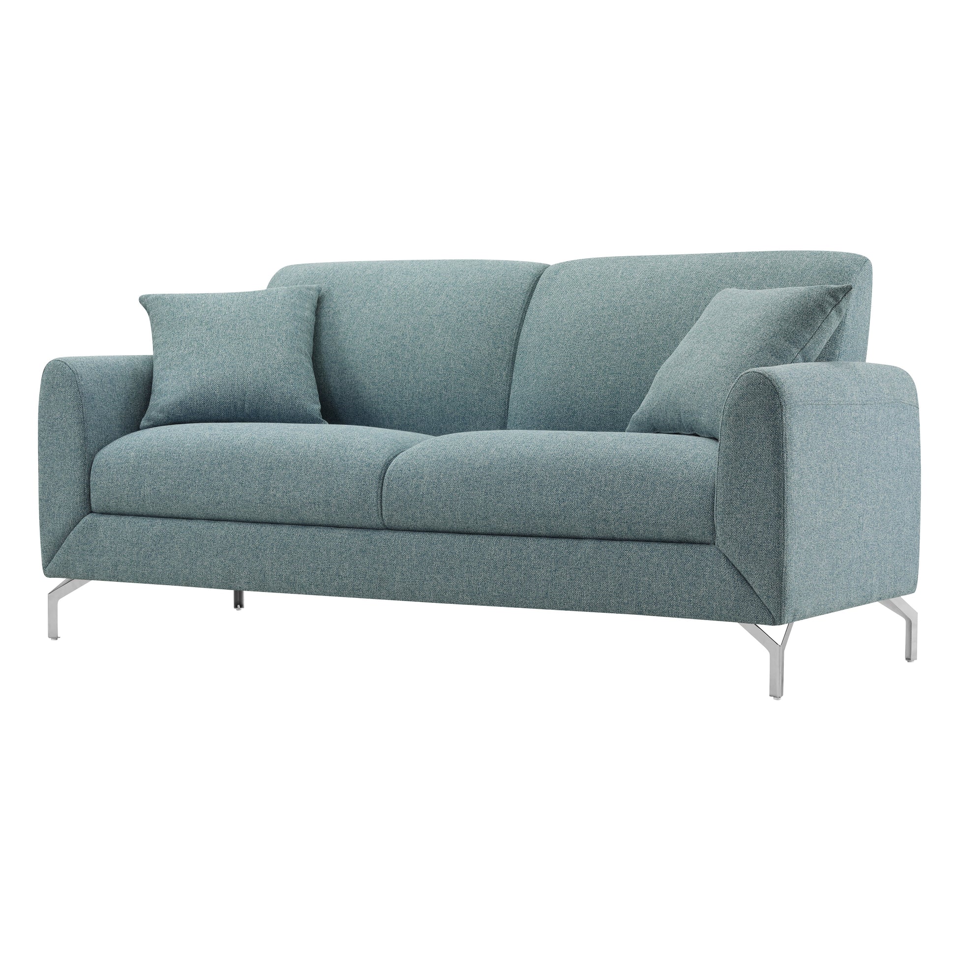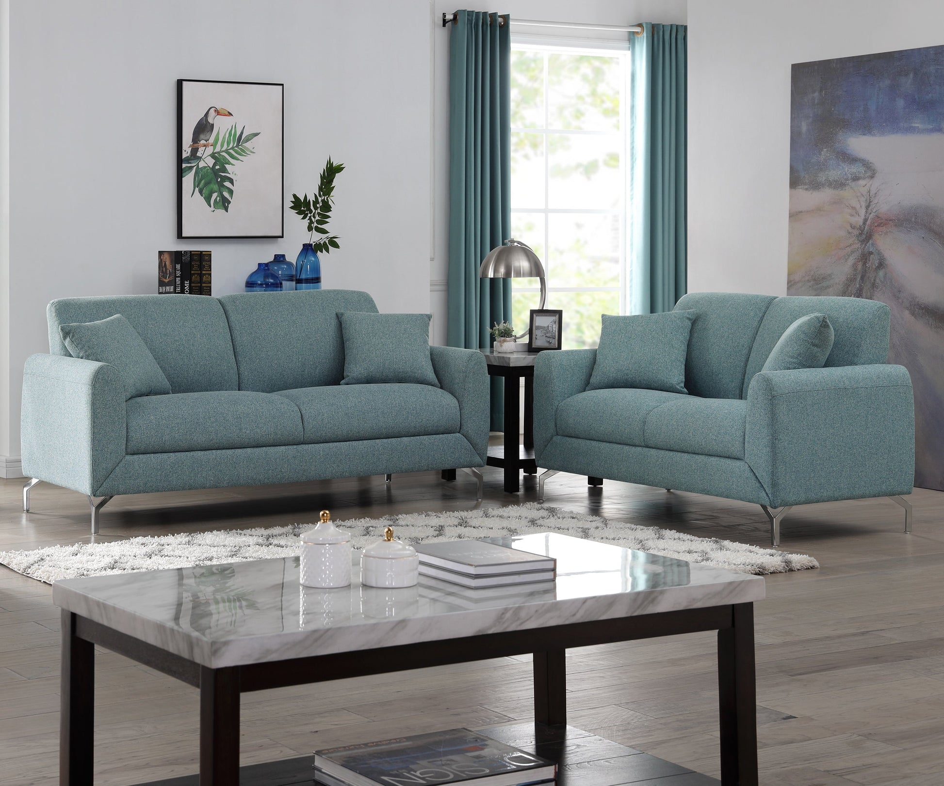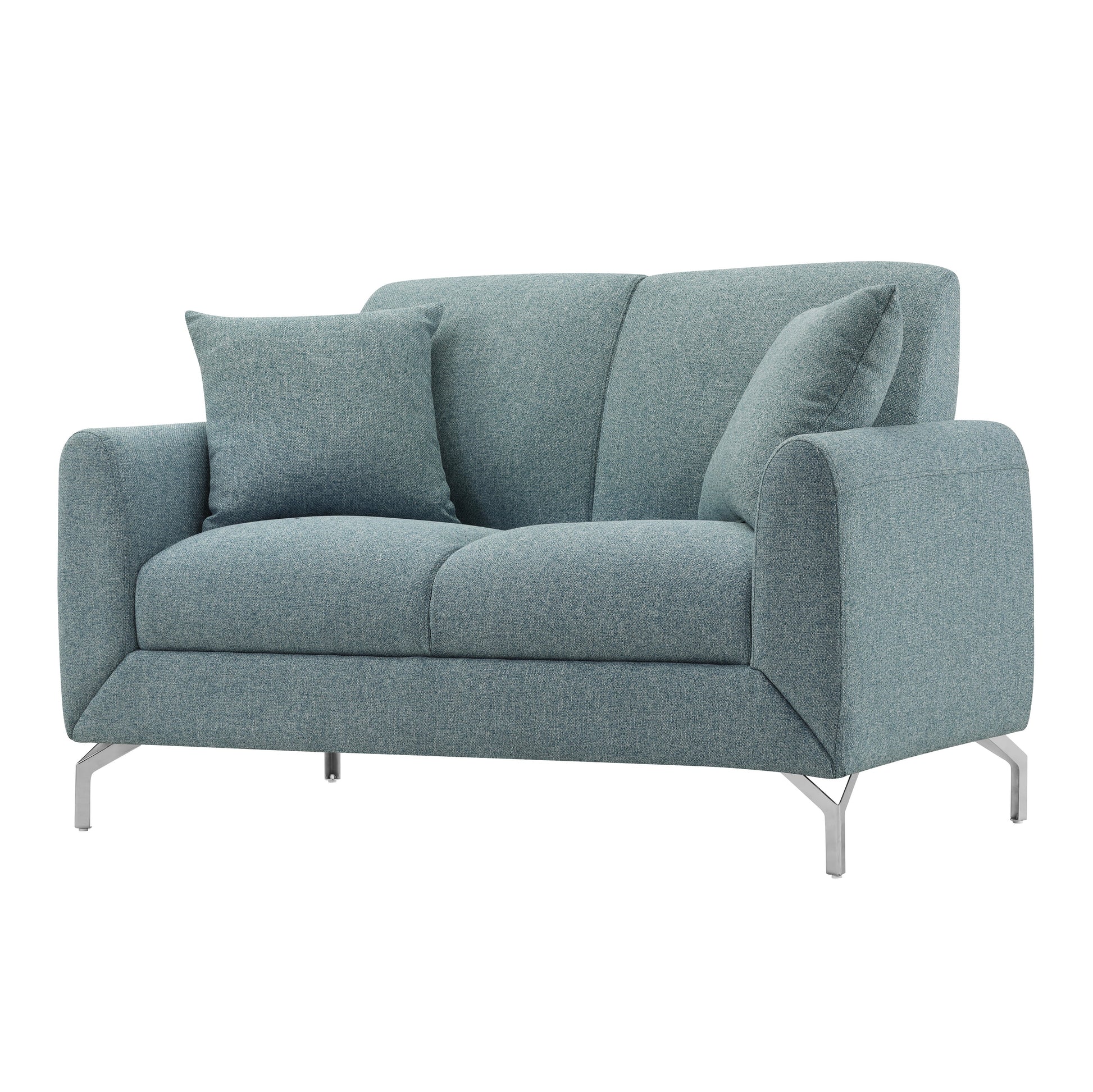 Give your living room a welcome change of pace with the Noreen Contemporary Blue Fabric Rounded Arm Living Room Collection. The Noreen collection offers a modern, clean-lined design while still inviting you to curl up with a good book. This expansive sofa has a minimalist, contemporary appeal with sleek metal legs and rounded armrests. Dense foam cushions make the deep seating especially cozy, with the strong hardwood frame underneath, you'll be enjoying this sofa set year after year.