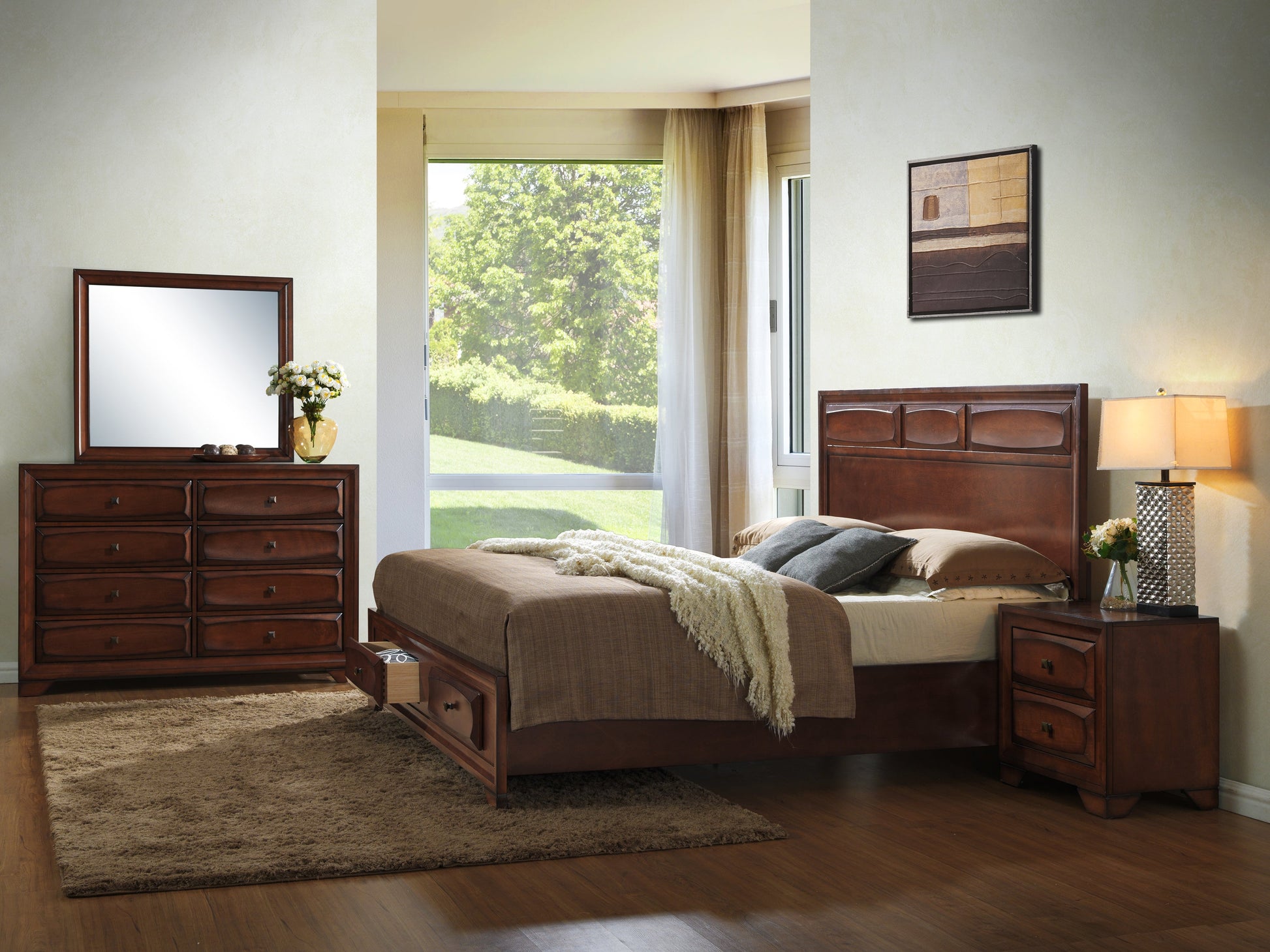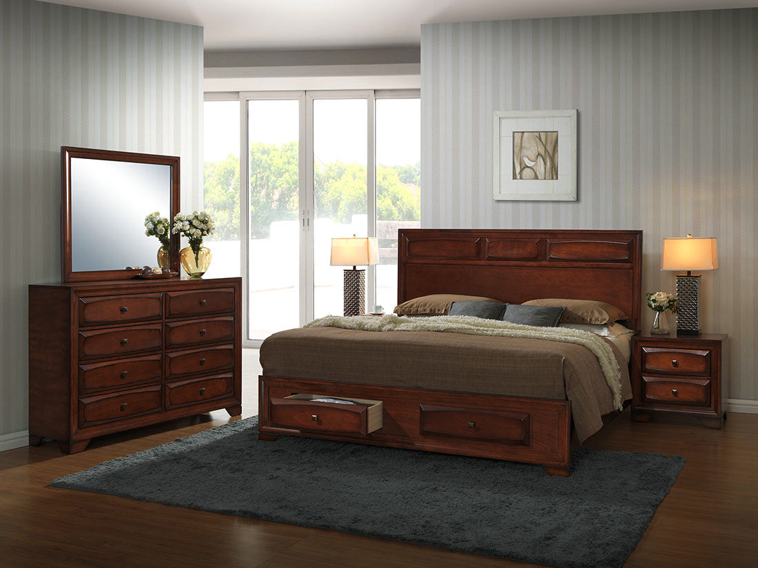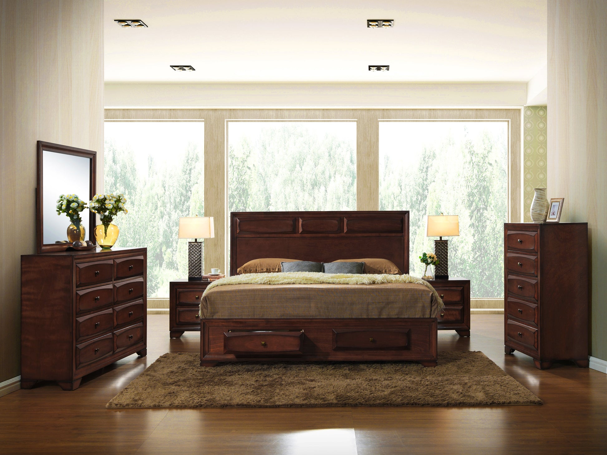 - The collection includes storage platform bed, dresser, mirror, nightstand, chest