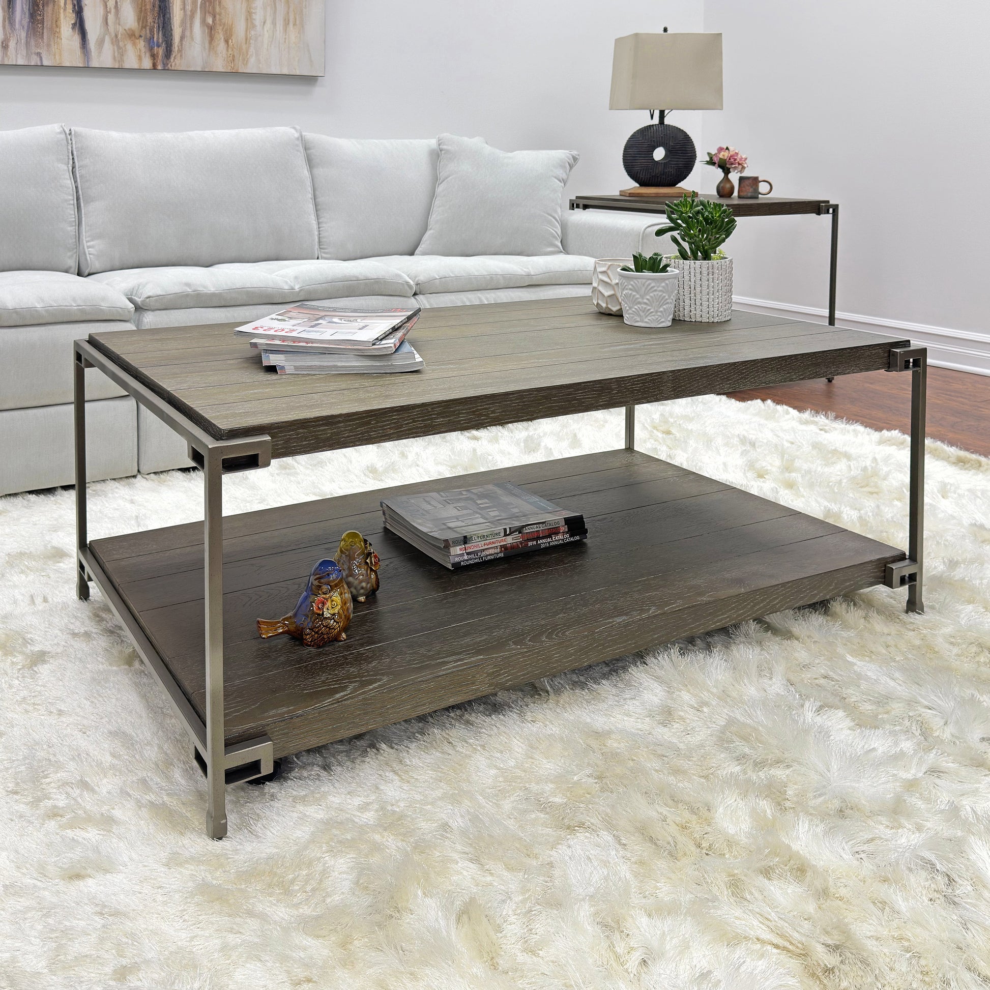 Unveil the Roundhill Furniture 3-Piece Corbeta Coffee Table Set, a masterful fusion of contemporary and modern style that enhances your living space with its distinctive design and practicality. This ensemble includes one coffee table and two chairside tables, each meticulously crafted of hardwood solid and oak veneer with a metal base/framework, ensuring enduring durability and captivating aesthetics. The Corbeta Coffee Table serves as the centerpiece of the set, boasting a sleek rectangular design that provides ample space to display coffee table books, decorative accents, and treasured possessions. Its aged graphite finish imparts an air of elegance and sophistication, elevating the overall allure of your room. Equipped with a fixed bottom shelf, the coffee table offers additional storage and display options, making it a versatile asset for maintaining a tidy and organized living room. The inclusion of casters allows effortless mobility, allowing you to easily reposition the coffee table as per your needs.