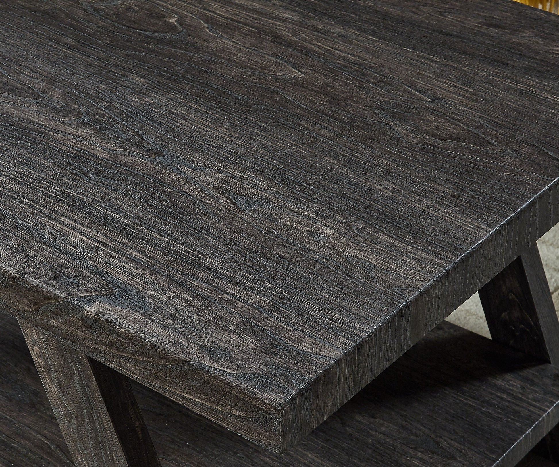 The Athens Contemporary Replicated Wood Shelf Coffee Table provides your room with a lodge-style feel that's at once stunning and welcoming. The compact frame of this coffee table??features wide-angled legs in a??charcoal??finish. Inspired by sawhorses and the simplicity of some craftsman-era tables, this coffee table fits with rustic or contemporary styles.