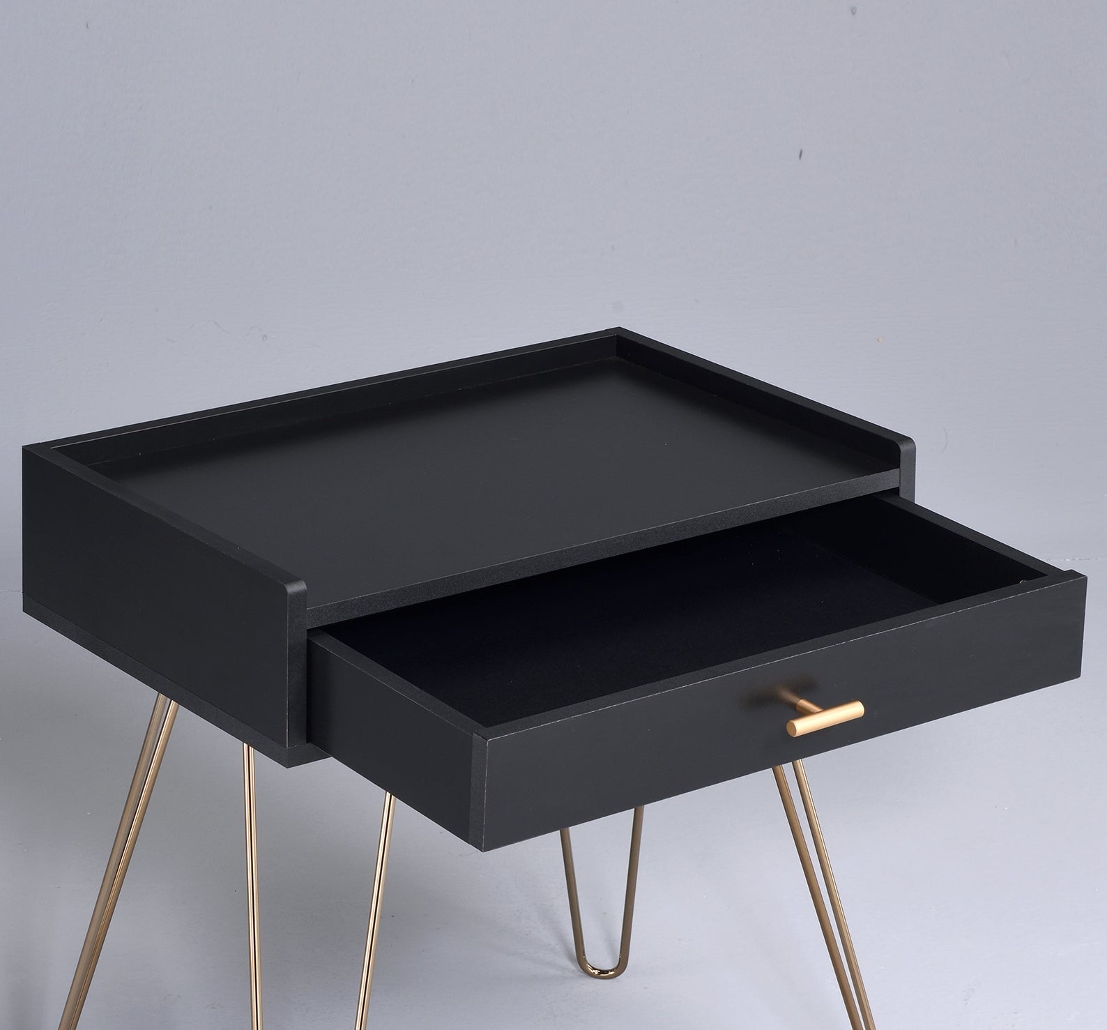 The modern Hailey Black and Gold Wood Storage End Table goes beyond function to add mid-century artistic value to your room. This coffee table is constructed of sturdy wood with a black wood finish. It has a drawer that is perfect for remote controls, reading material, and more. The table features sturdy iron hairpin-style legs with a gold-tone finish.