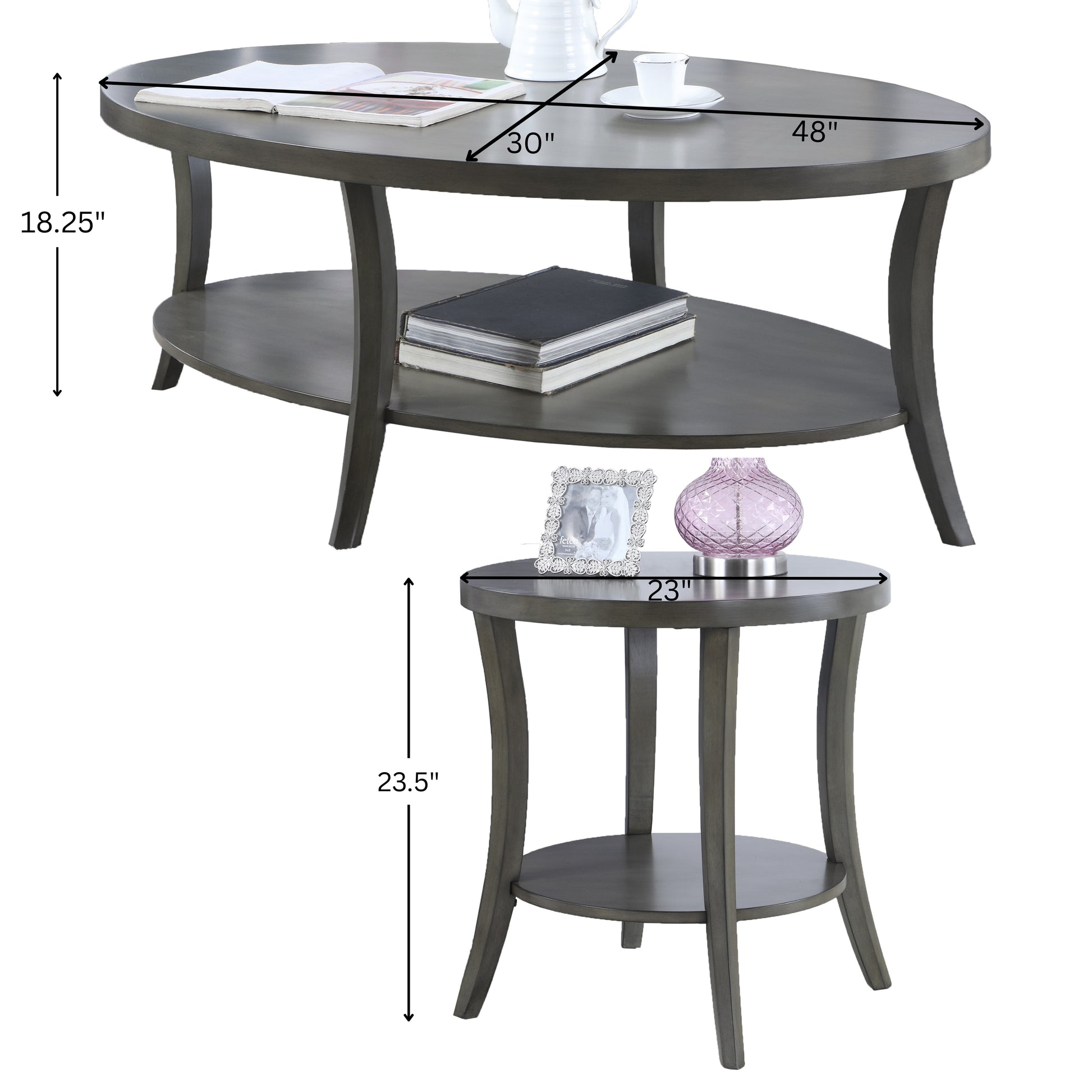 The ultra handy and handsome Perth 3-Piece Gray Oval Coffee Table with End Tables Set brings casual elegance to your living room. Both wooden coffee table and end table boast a versatile gray finish and a lower shelf offers display space. Search "Perth" to see the whole collection.
