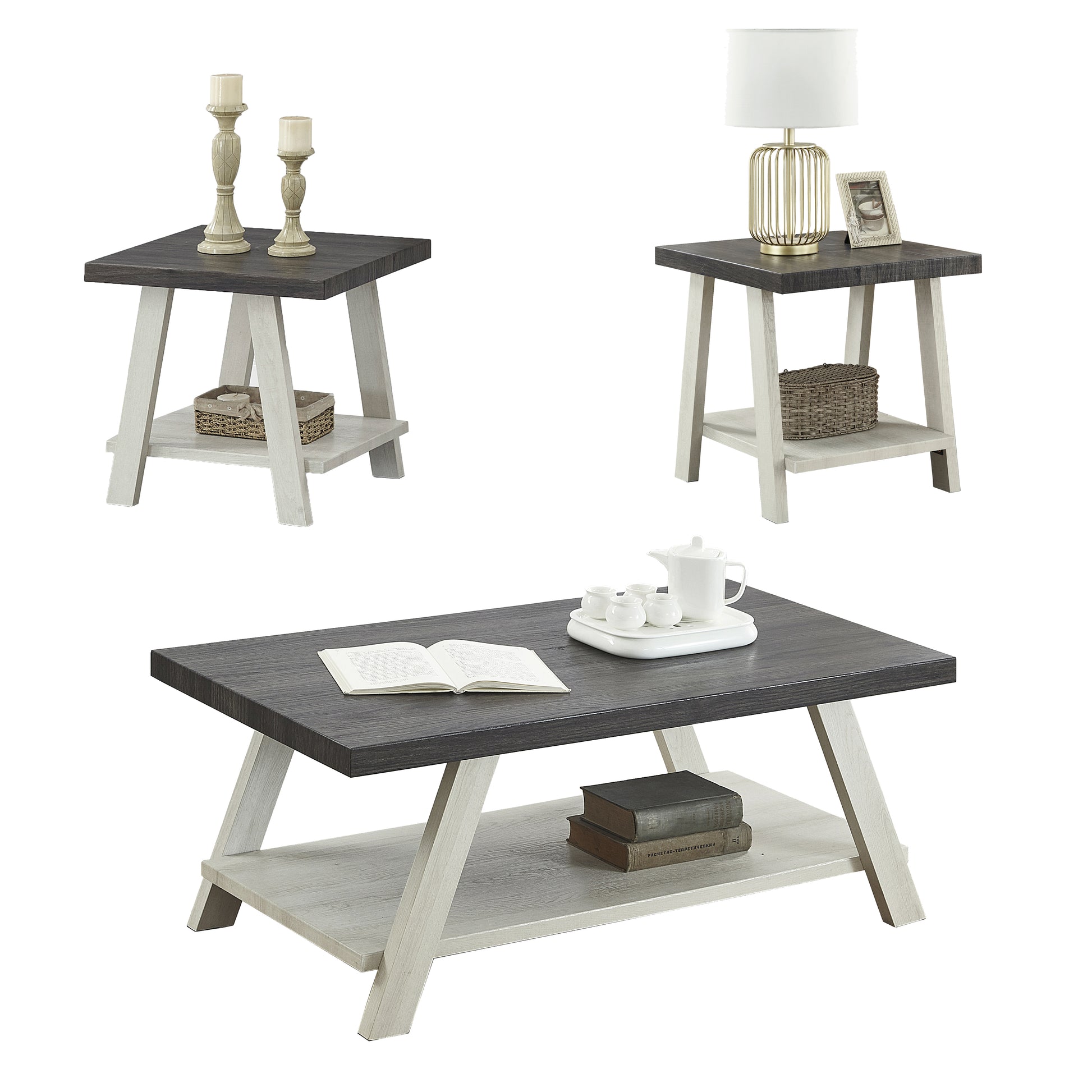 - The set includes a coffee table and two end tables, with a weathered charcoal finish on the table top and beige finish on the base