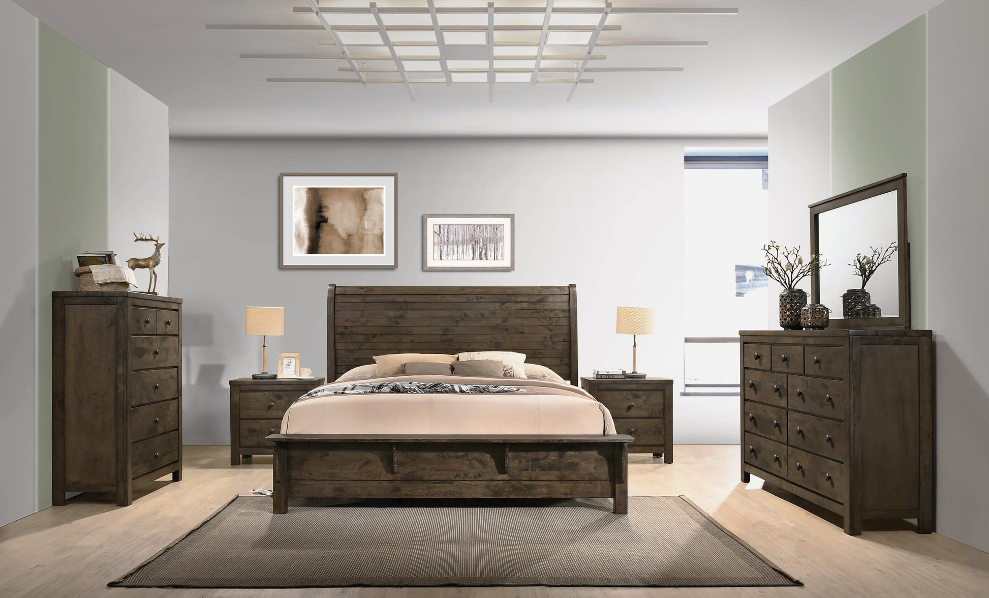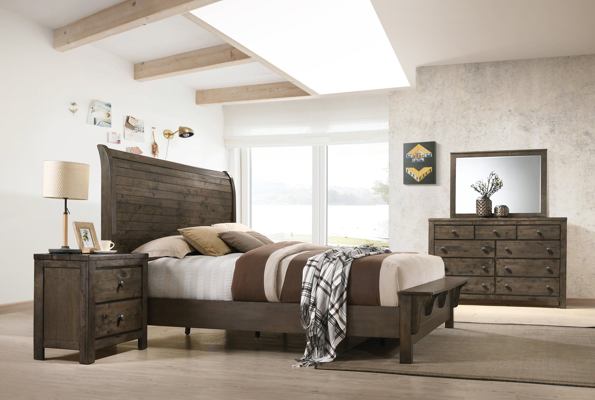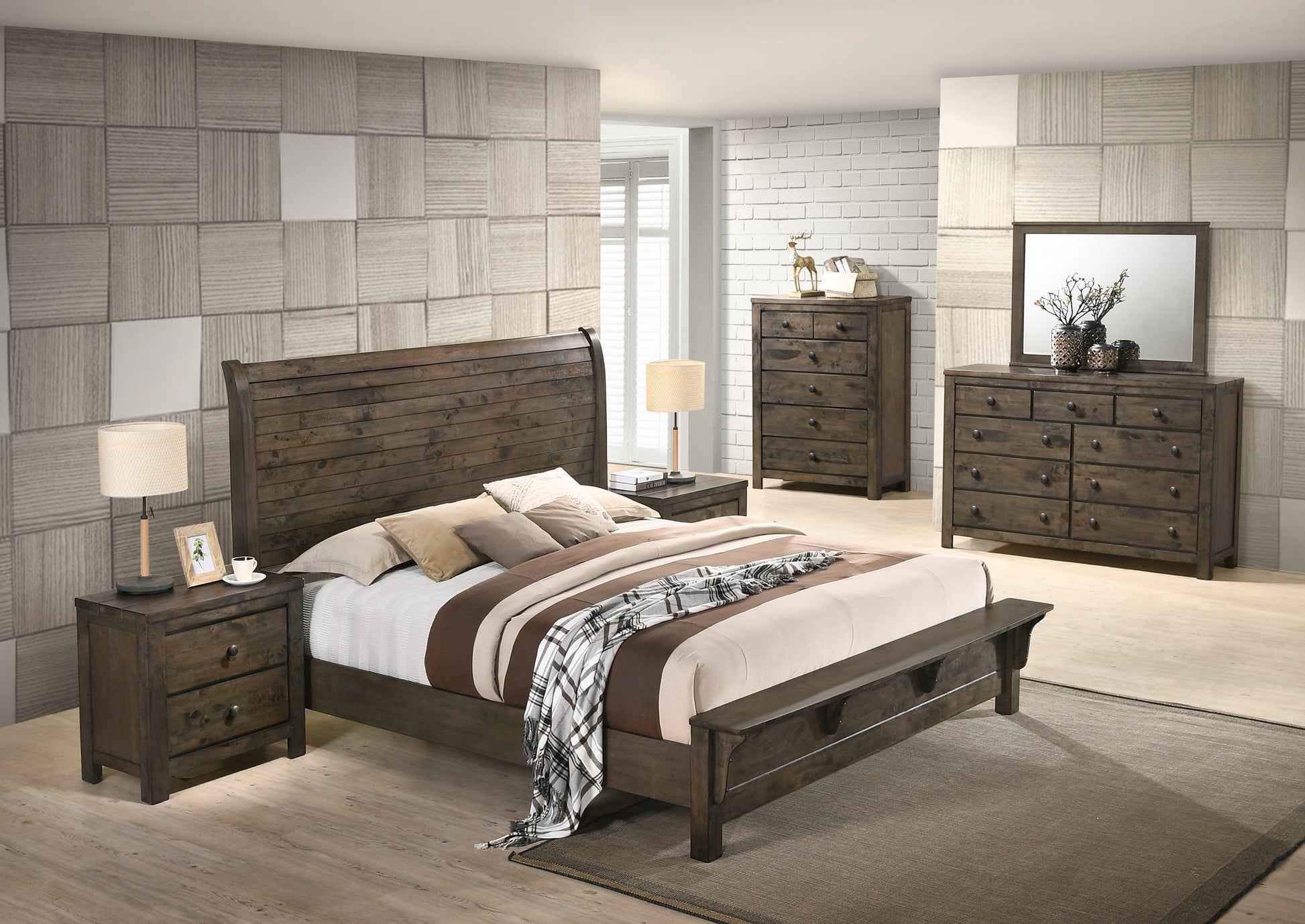 - Features beautiful wood planks details on sleigh headboard