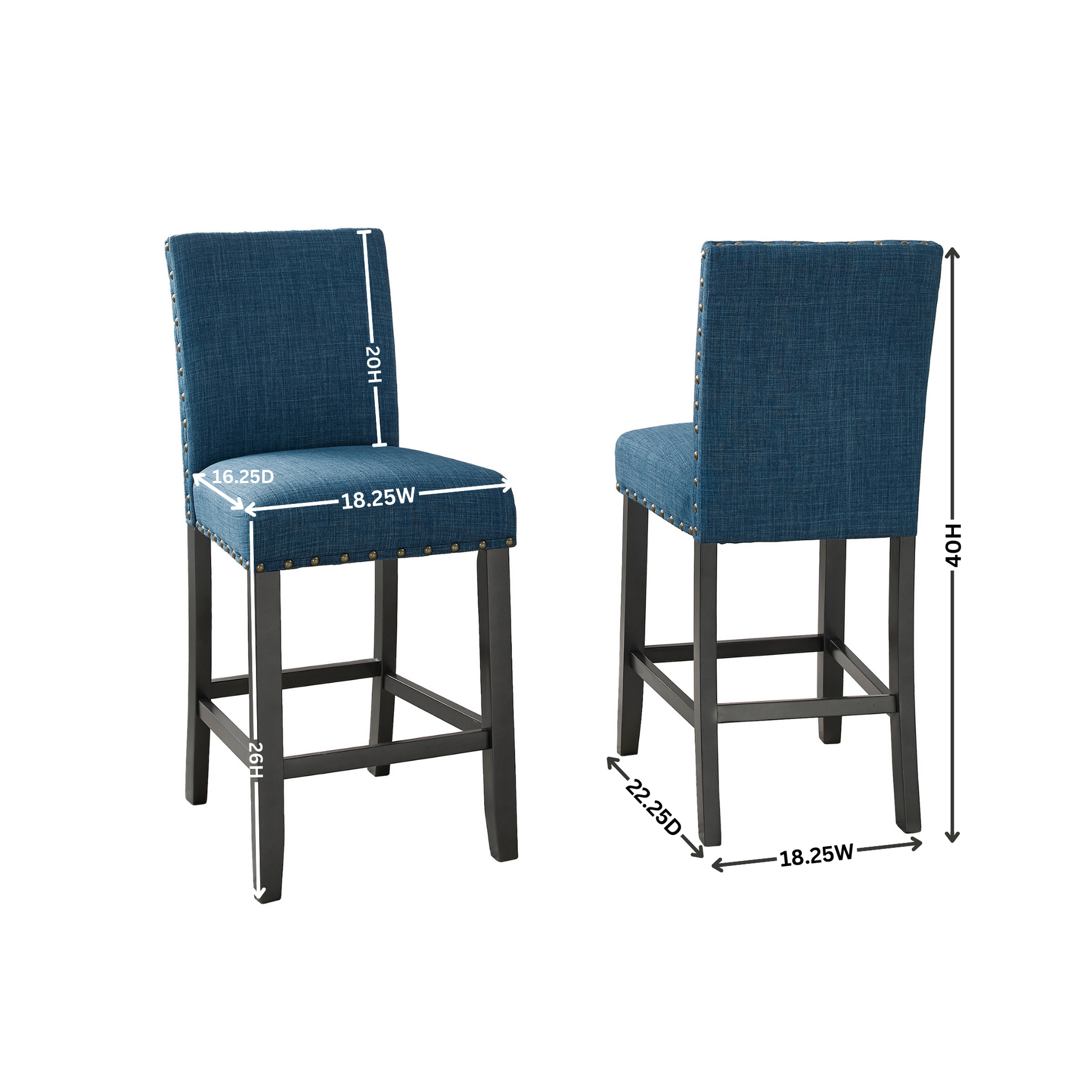 - Set of 2 enticing nailhead trim counter height stool, blue-colored linen and cotton fabric upholstery on the seat and chair back.