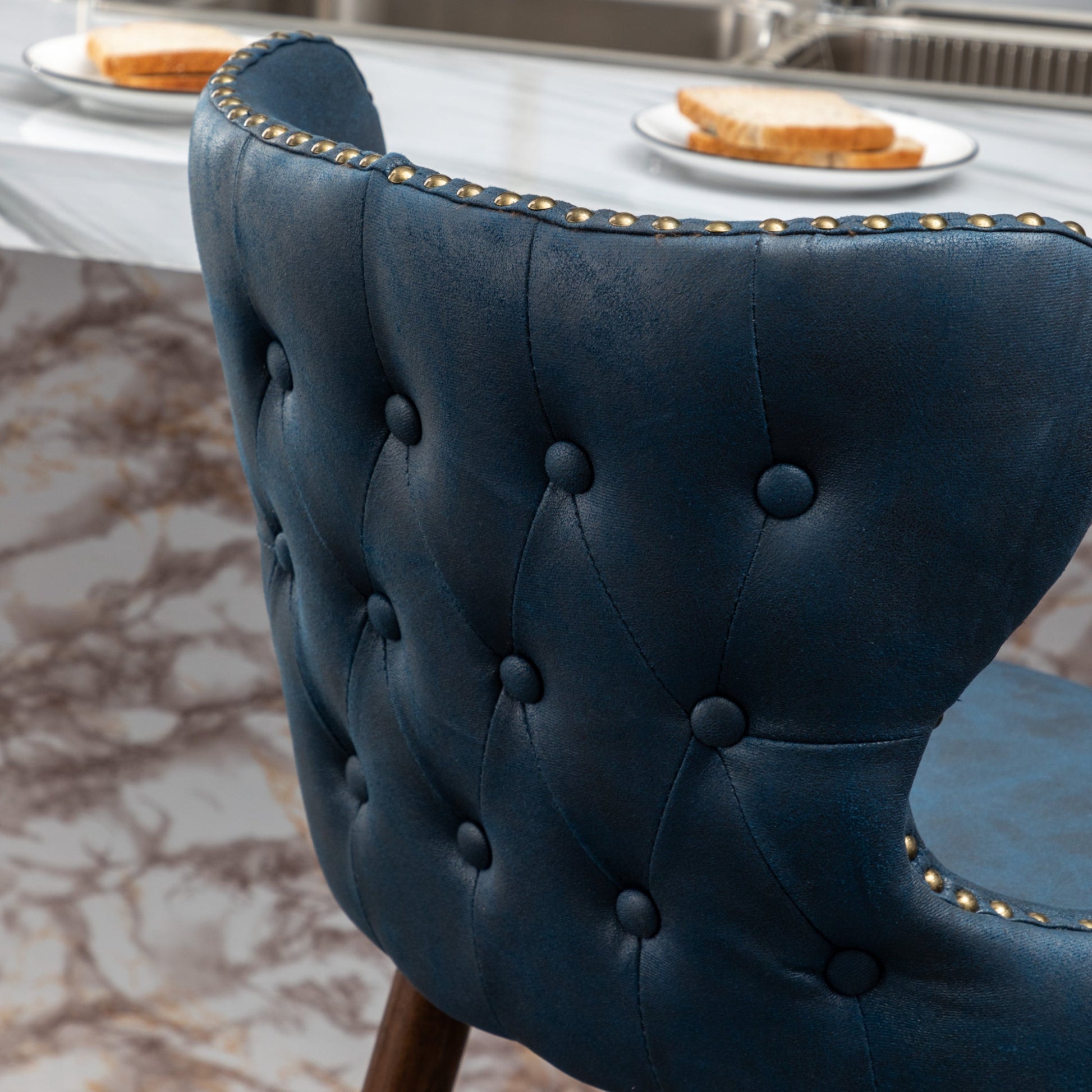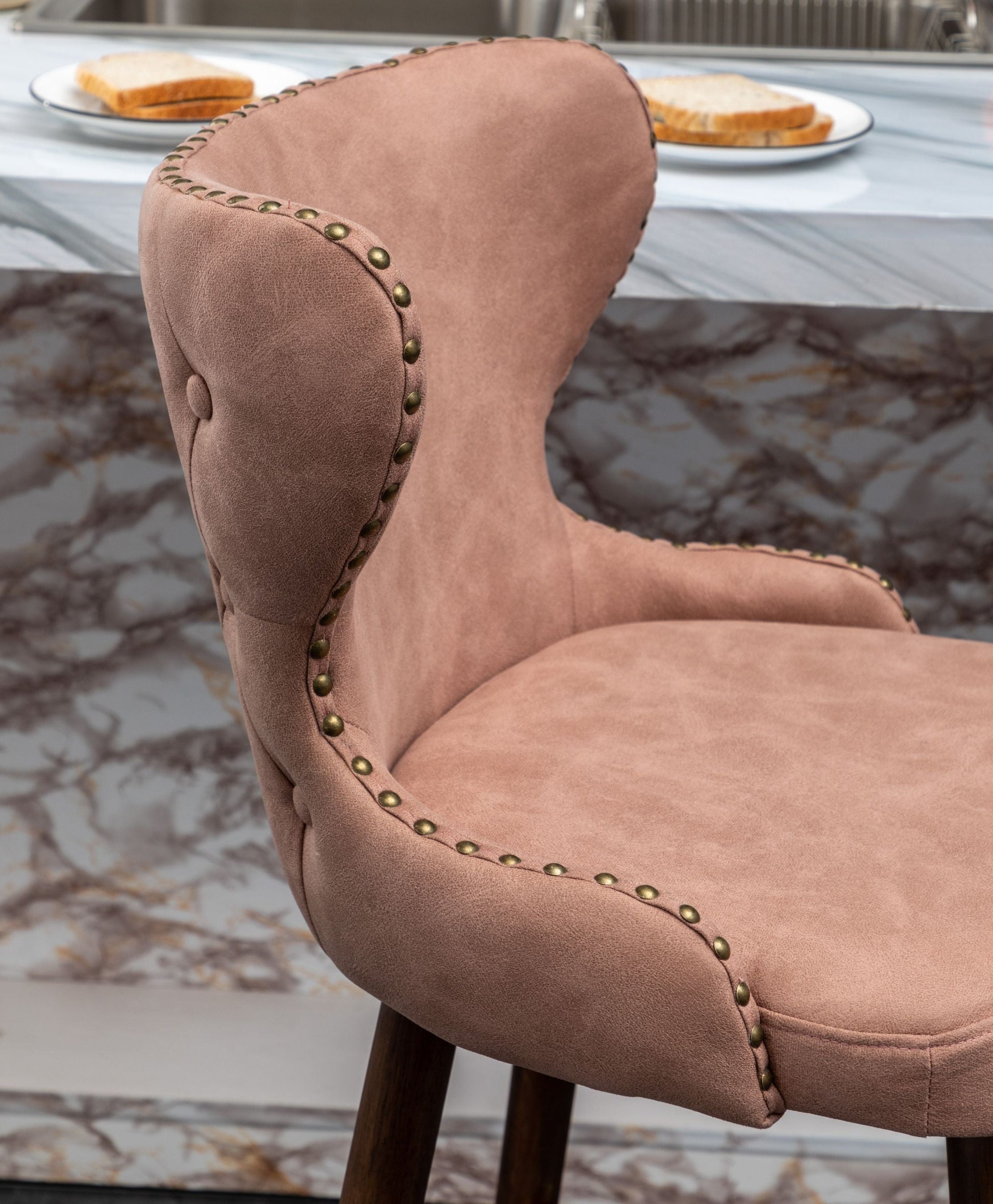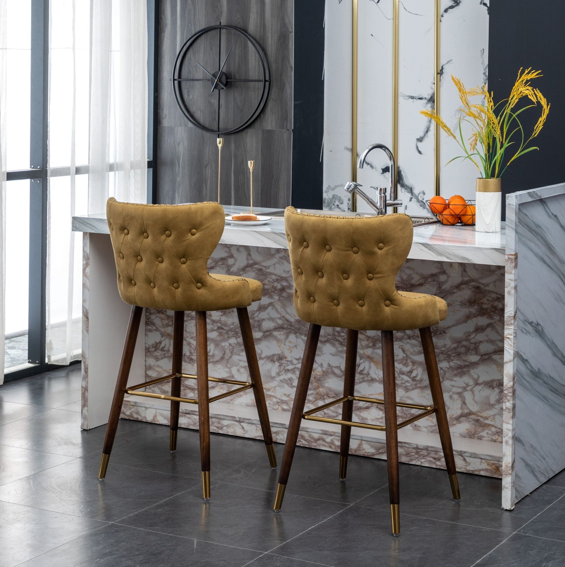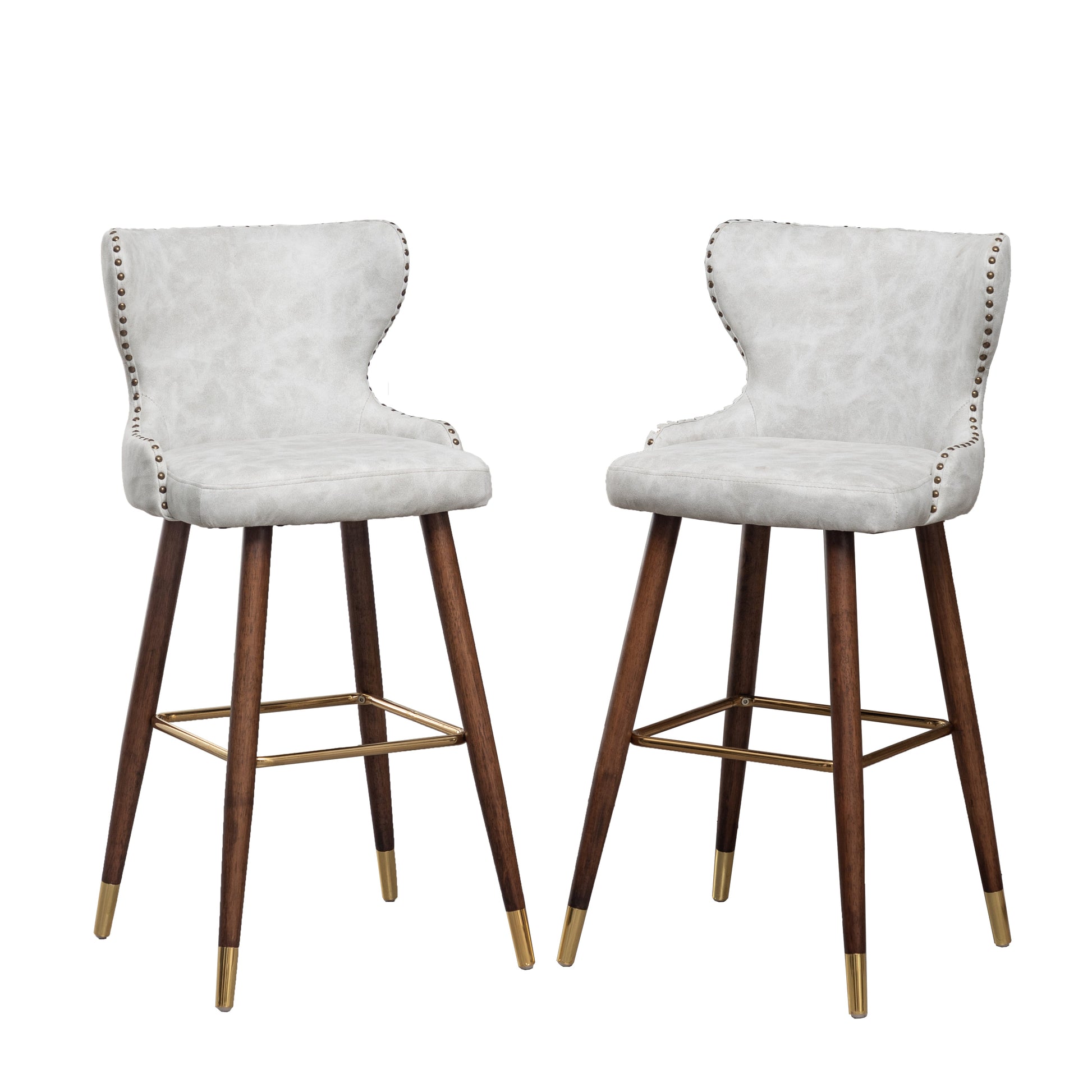 Go glam around your tall dining table by offering the Roundhill Furniture Nevis Mid-century Modern Faux Leather Tufted Nailhead Trim Barstools. The set includes two counter height stools with button-tufted backs and suede-like fabric upholstery. A curved wing-back seat brings these stools plenty of vintage, mid-century appeal. A metal footrest assures comfort as you sit. Brushed bronze nailhead trim along the back, and gold metal-plated detail on the legs of these counter stools. For a custom look, choose from available colors.