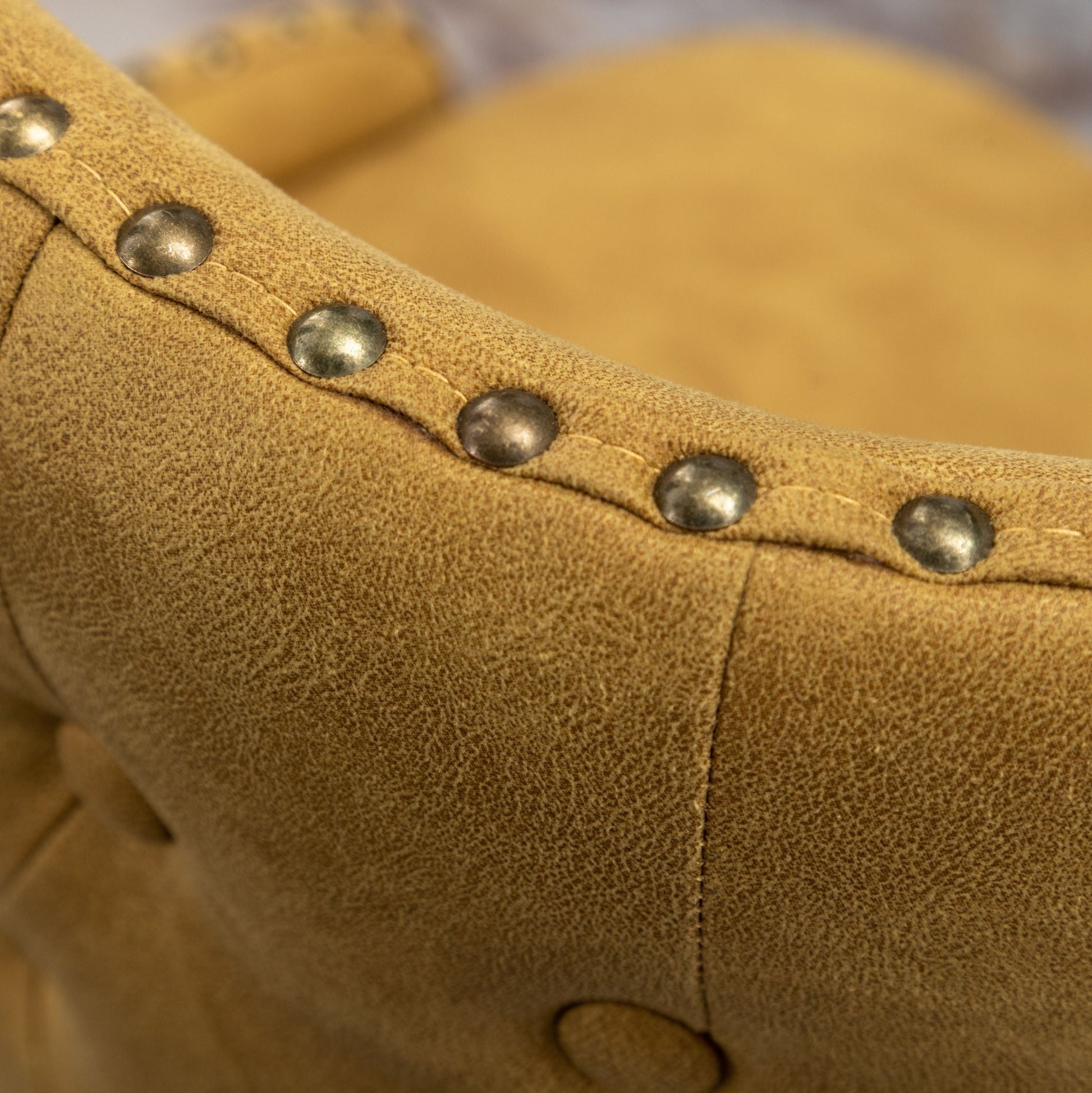 - A button tufted back and curved wing-back seat with nailhead trim bring the mid-century appeal
