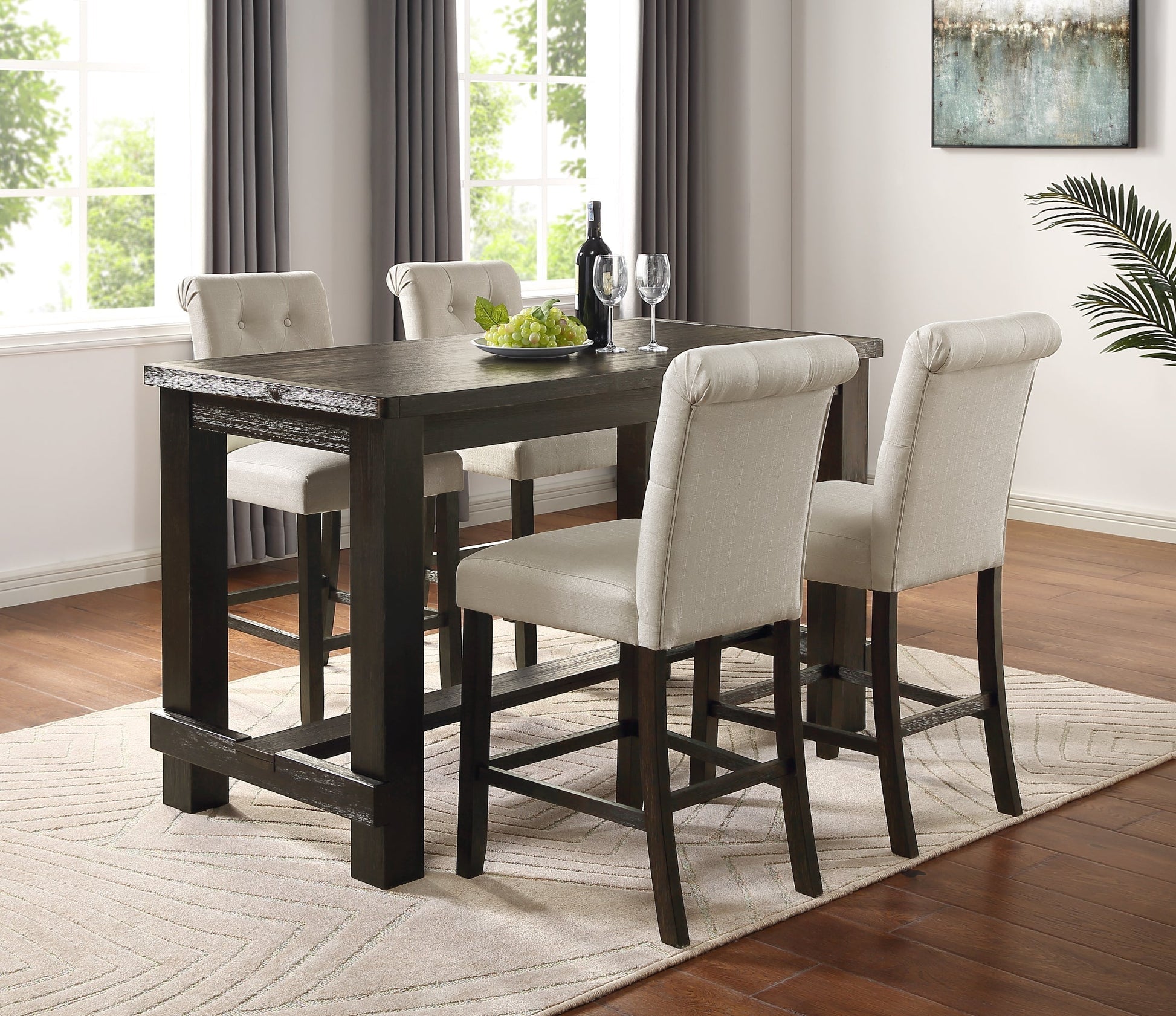 - Counter height dining set with one table and four chairs. The dining chair is upholstered in soft solid color fabric with solid wood frame, perfectly accented with button tufting