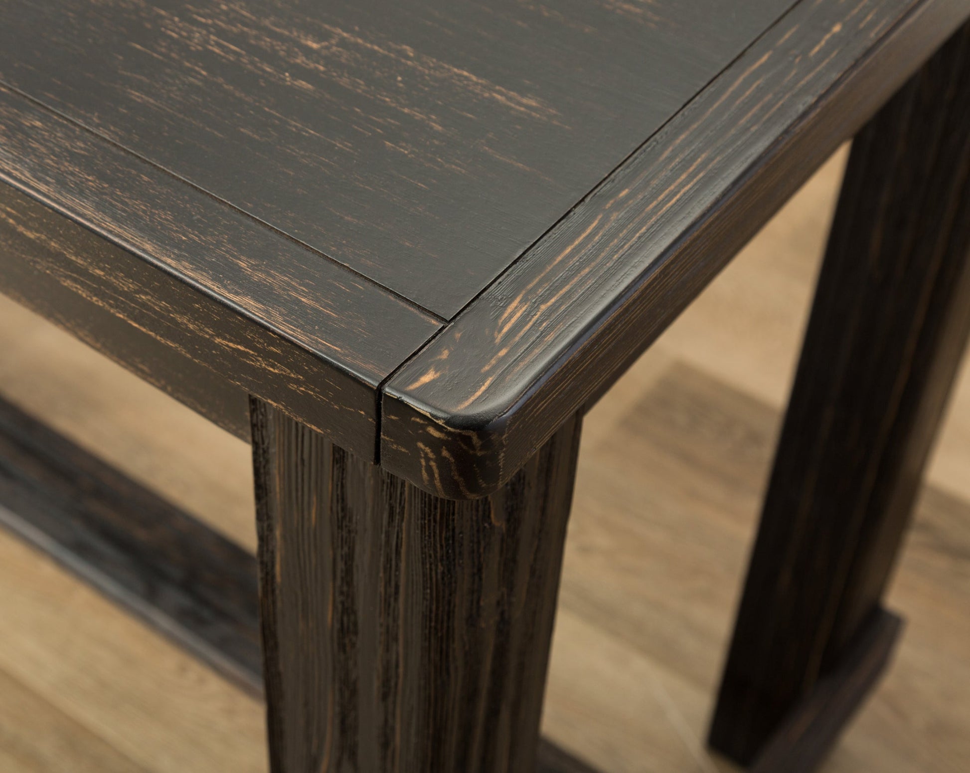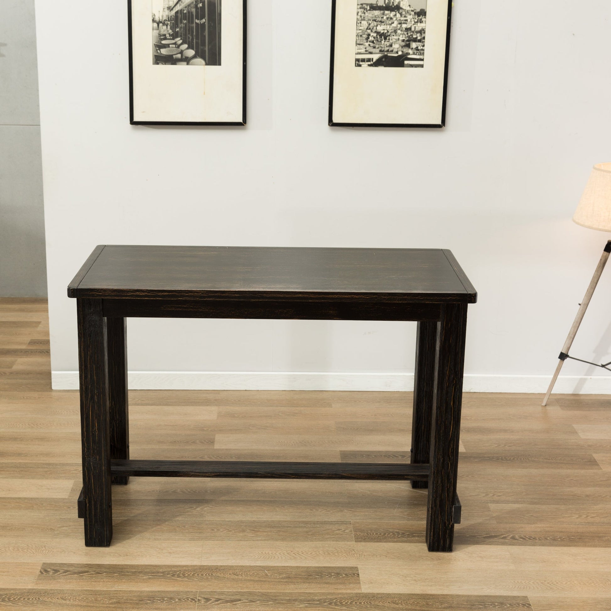 - 5-piece pub set that includes a pub table and four matching barstools. The table is finished in a dry vintage weathered black finish. Chic and contemporary style, sleek rectangular shape with footrest