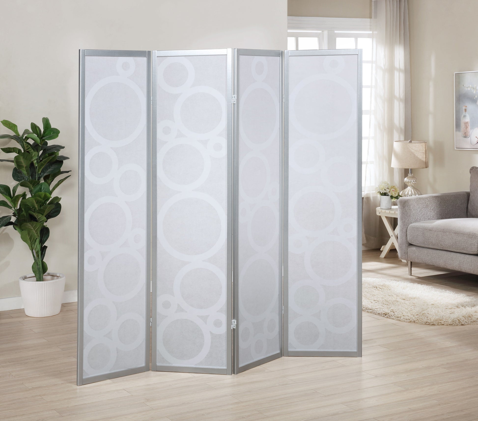 Roundhill Furniture Arvada 4-Panel Wood Room Divider with Circle Pattern, Silver