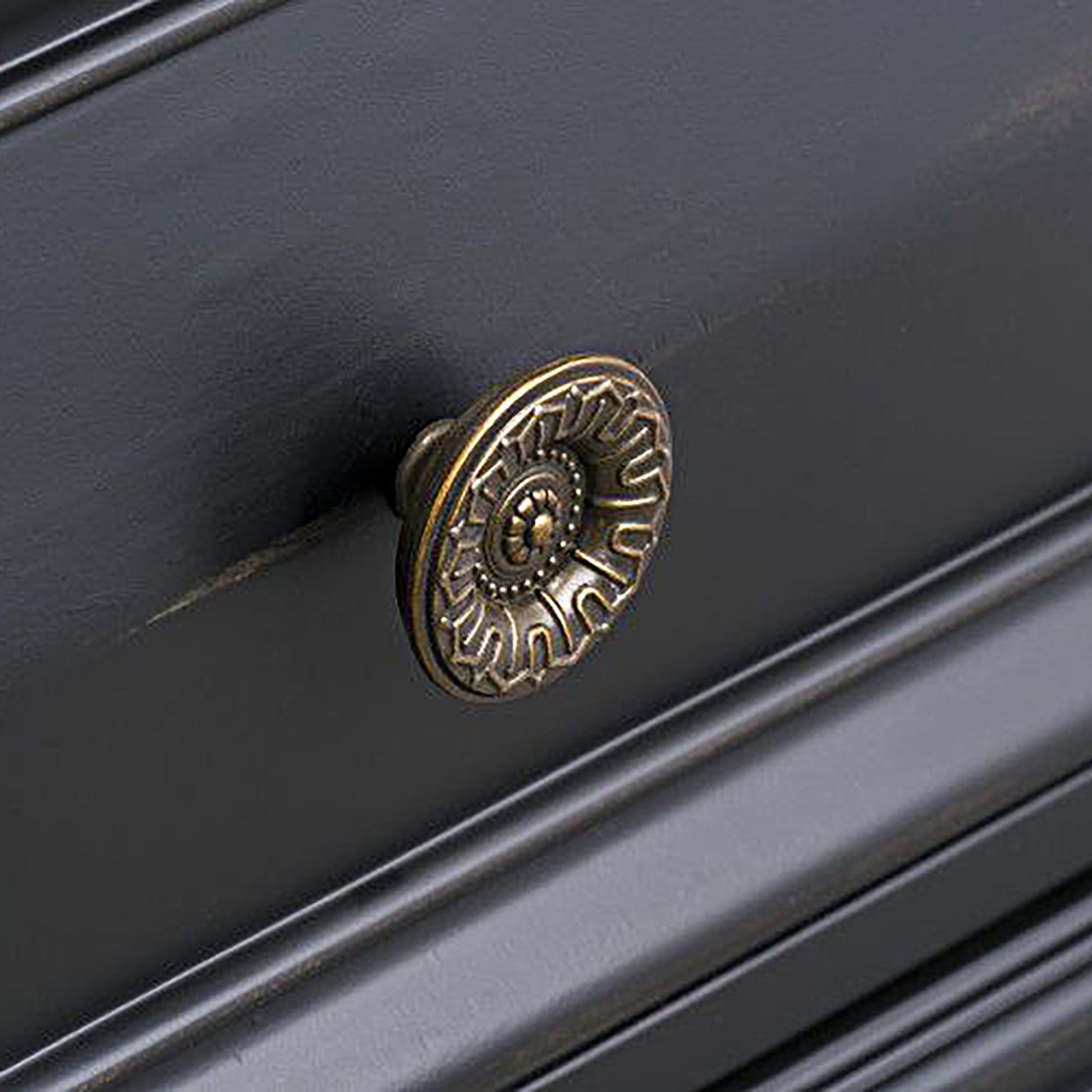 - Drawers run smoothly on Kenlin glide, feature English dovetail construction and rosette knob hardware in a brass finish