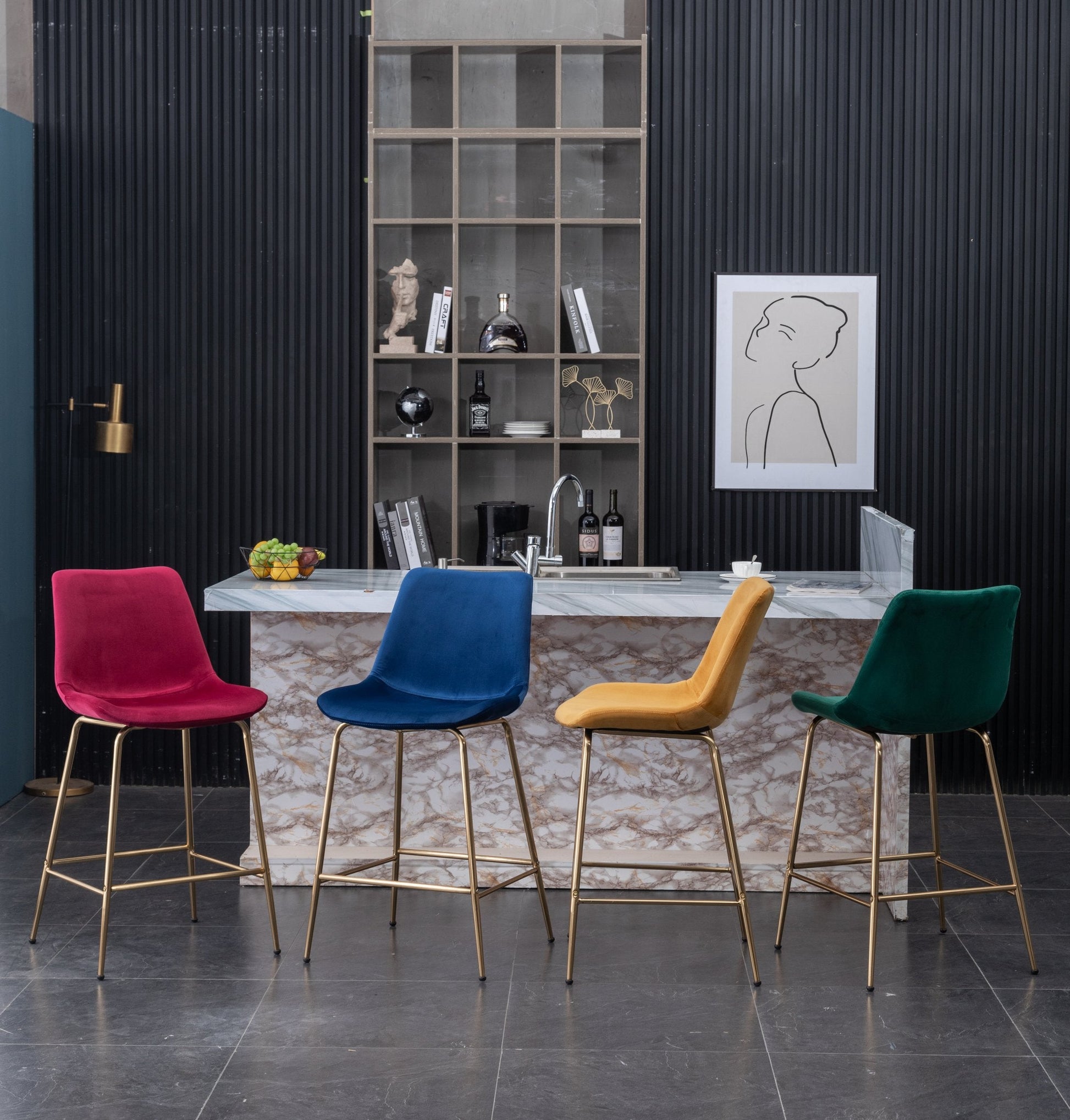 This Counter Height Stool from the Aufurr collection will offer both functionality and style to any interior design. Inspired by modern dining decor, this set is redefined by its durability, elegance, and comfort. The smooth velvet-wrapped seat and well-padded backrest are paired with the timeless gold-plated Legs for optimal comfort and great support, four stretcher footrests offer durability, and the floor protector available underneath will protect your floor from scratching and scuffing. Without a doubt! This eye-catching set will definitely make your dining space the central gathering area for your family and friends so they will spend quality time together and make great memories! Available in four colors: Blue, Gold, Green, and Red.
