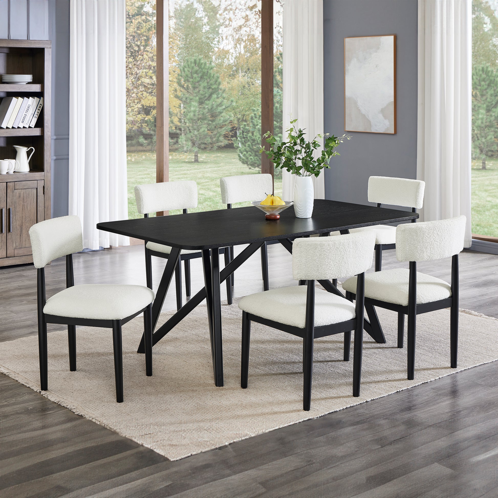 Elevate your dining space with the Roundhill Furniture Axler 7-Piece Dining Set, available in Black or Light Oak finishes to suit any decor. This modern set features a spacious rectangular table crafted from MDF with oak veneer and supported by a sculptural tripod-cross rubberwood base that seats up to six comfortably. Paired with six matching chairs upholstered in soft off-white boucle, this set blends clean lines, durable construction, and cozy texture to create a stylish and inviting dining area perfect for everyday meals or gatherings.