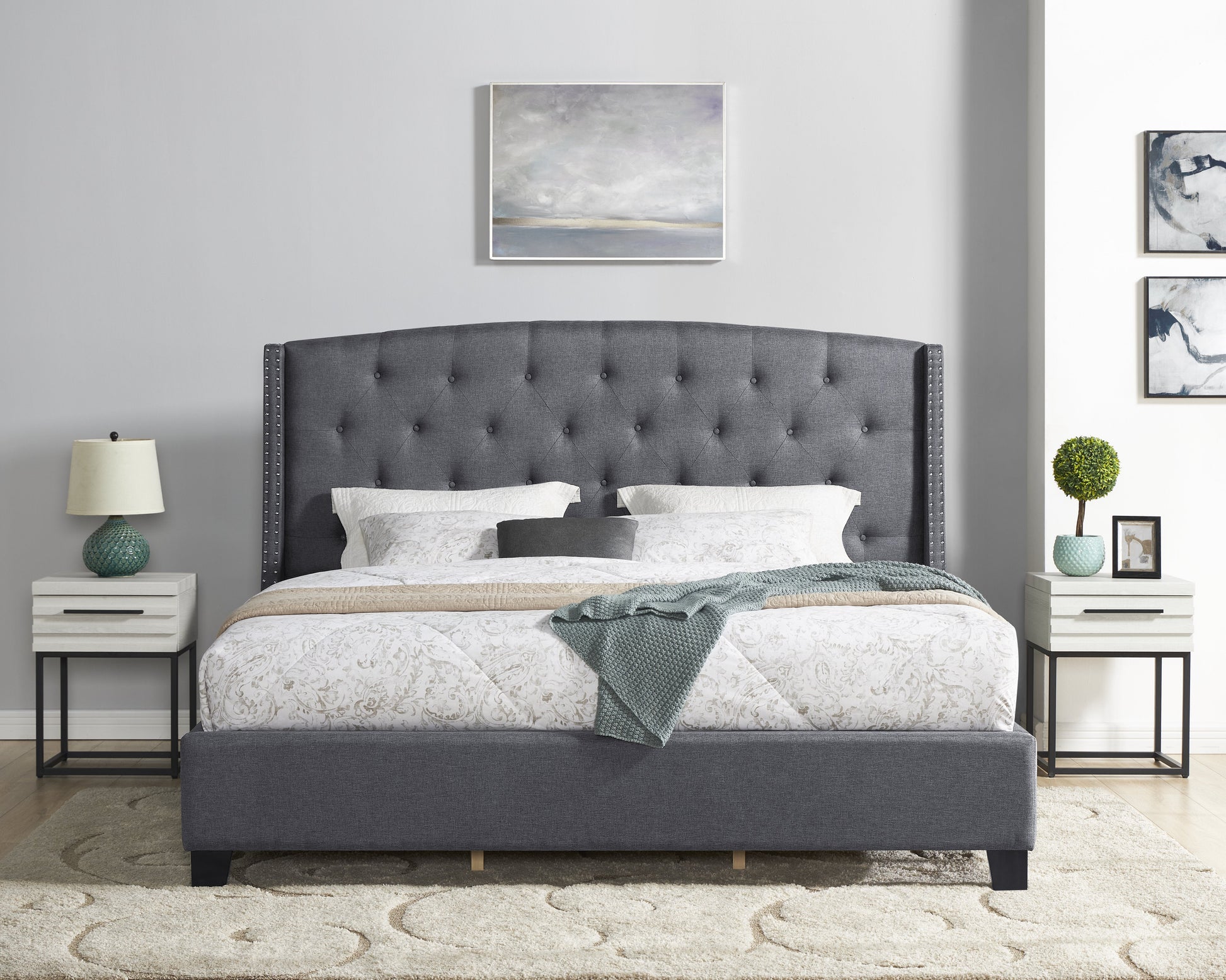 - Wing-back headboard with button tufting and pewter nailhead trim adds timeless elegance and sophistication.
