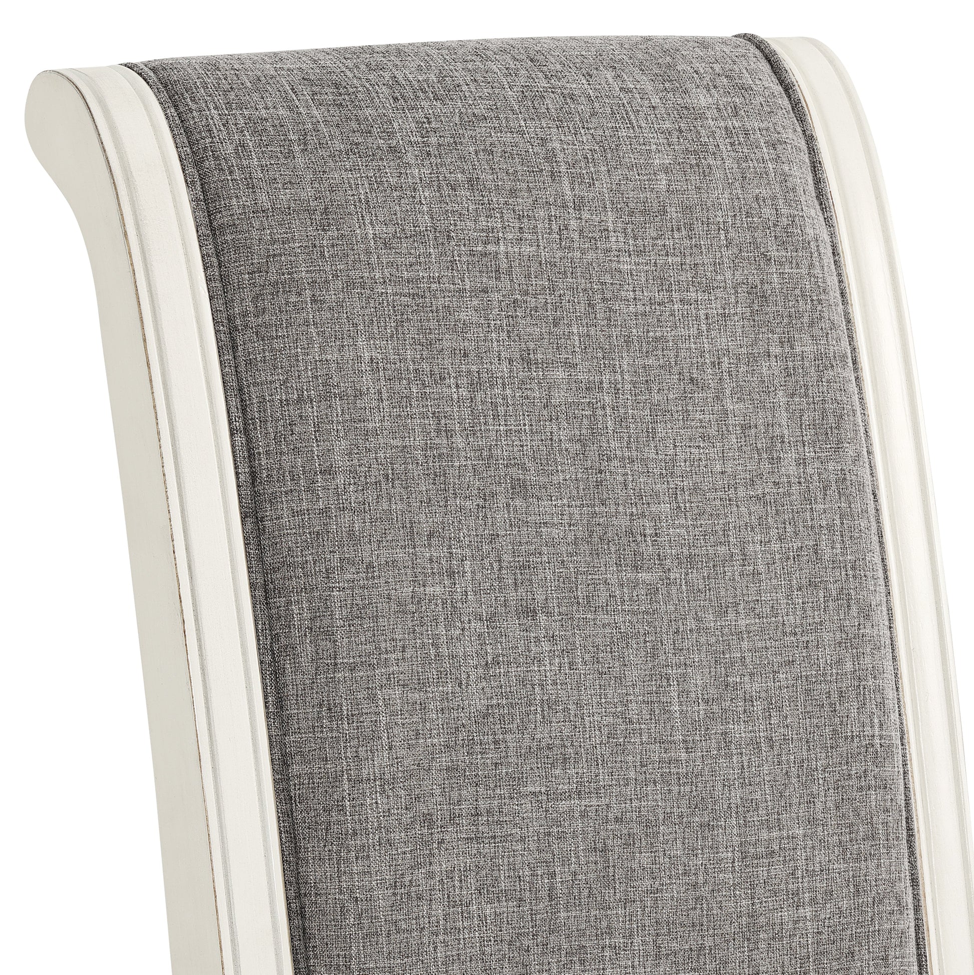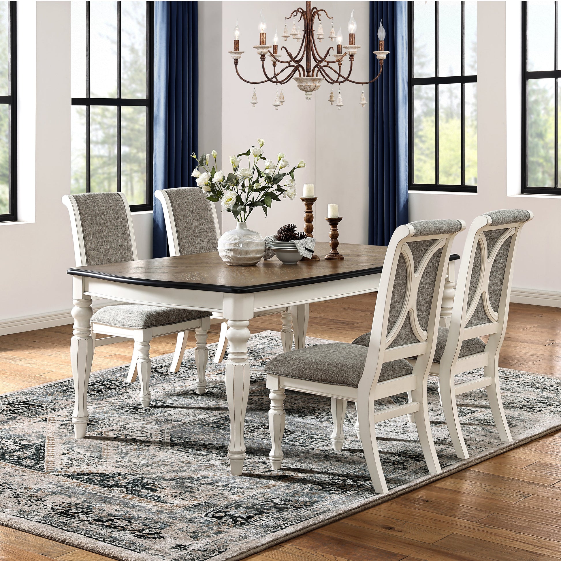 Create an inviting and stylish dining space with the Roundhill Furniture Belleza French Country Dining Set. This exquisite collection features a rectangular table and four matching chairs, combining French country elegance with timeless design. The Belleza dining table sets the stage for memorable gatherings. Crafted with a weathered oak finished table top, it exudes natural beauty and showcases a striking curved end design. The thumbnail table edge with dark varnish adds a touch of sophistication, while the solid rubberwood legs in an antique cream finish with distressed marks provide a charming rustic appeal. With its sturdy construction and the option to seat up to six people, this table is perfect for both everyday meals and special occasions. The Belleza dining chairs perfectly complement the table's style and comfort. With their deep turned French-style legs and matching antique cream finish, they add an extra layer of elegance to your dining space. The gray fabric upholstery, featuring a beautiful natural wood grain pattern, brings a touch of sophistication.