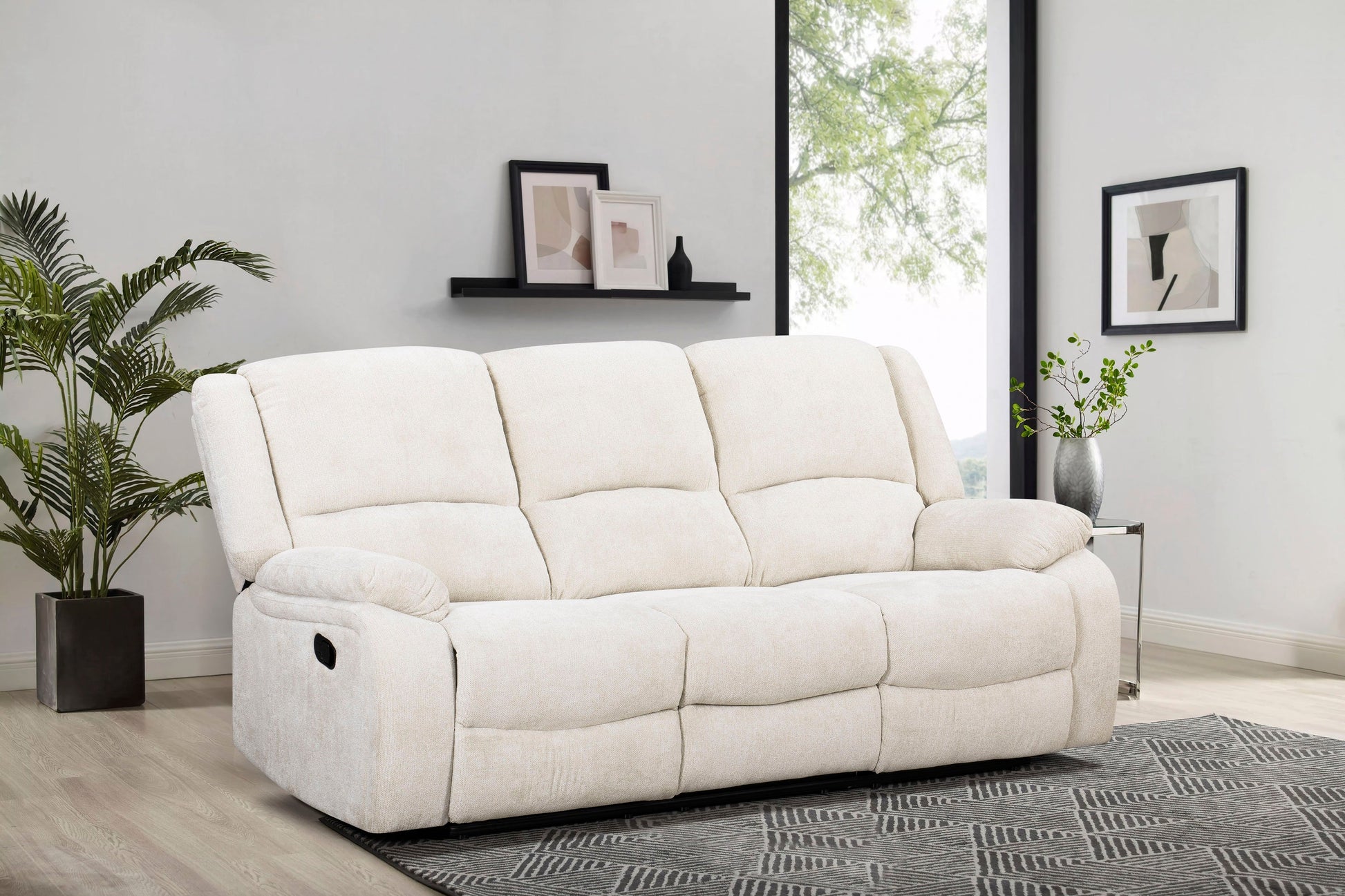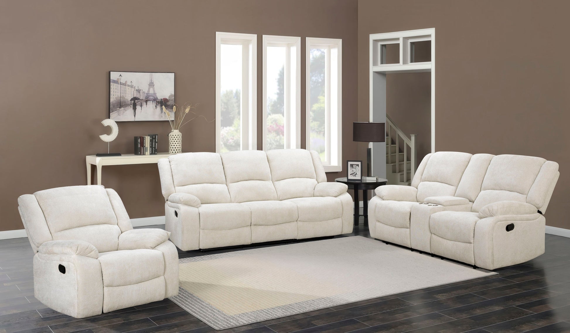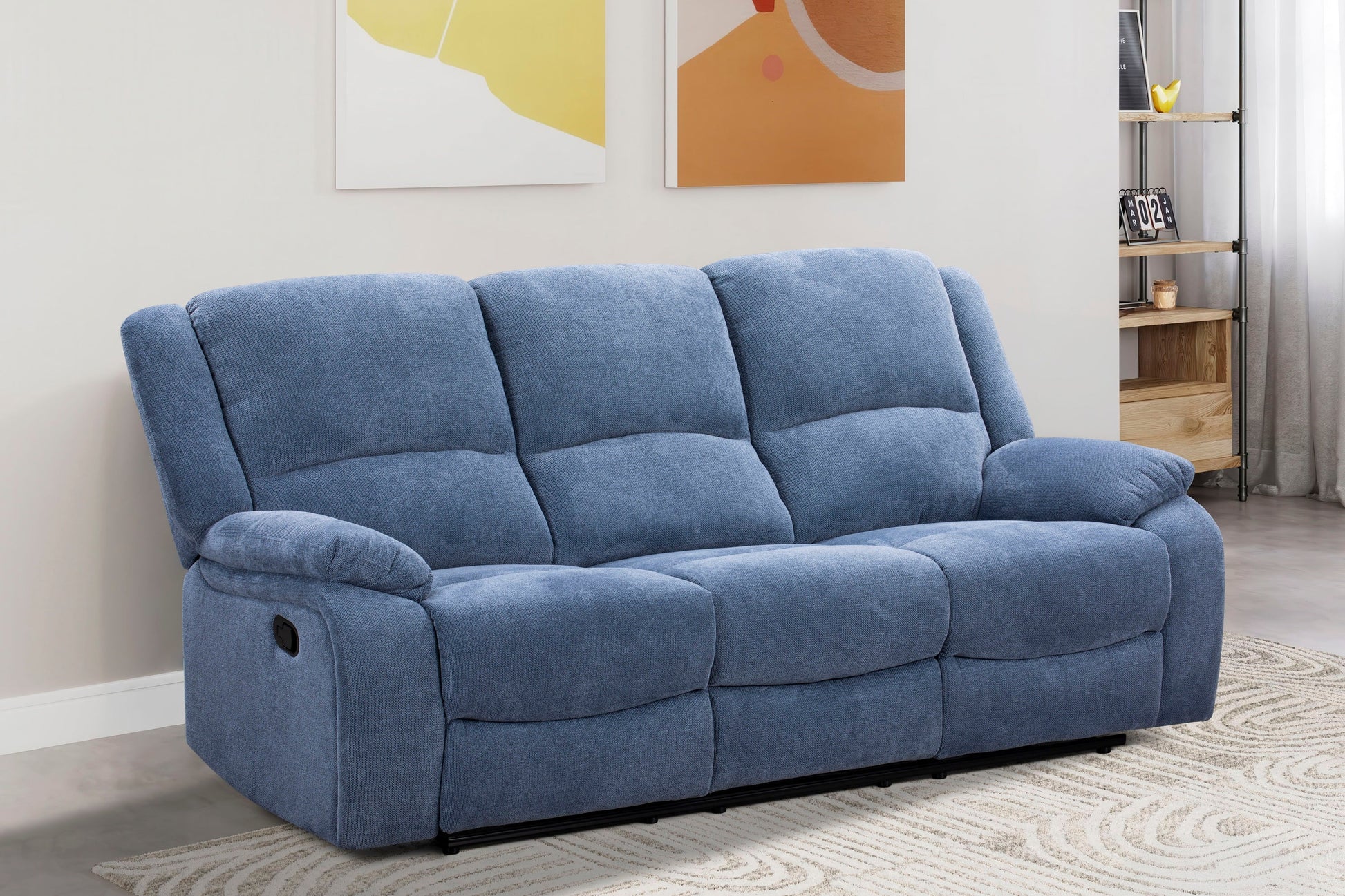 Elevate your living space with the Blitz Transitional Reclining Collection by Roundhill Furniture. This collection featuring a sofa, loveseat, and recliner, this collection blends timeless design with modern comfort. Spencer-upholstered cushions and sculpted pillow arms offer cloud-like support, while rich, versatile hues enhance any décor. All pieces boast smooth manual recliners with pull-tab levers for effortless lounging. The loveseat features built-in dual cup holders and a storage cabinet that keeps drinks, remotes, or essentials within reach. Built with reinforced hardwood frames and durable metal mechanisms, this set ensures lasting stability.
