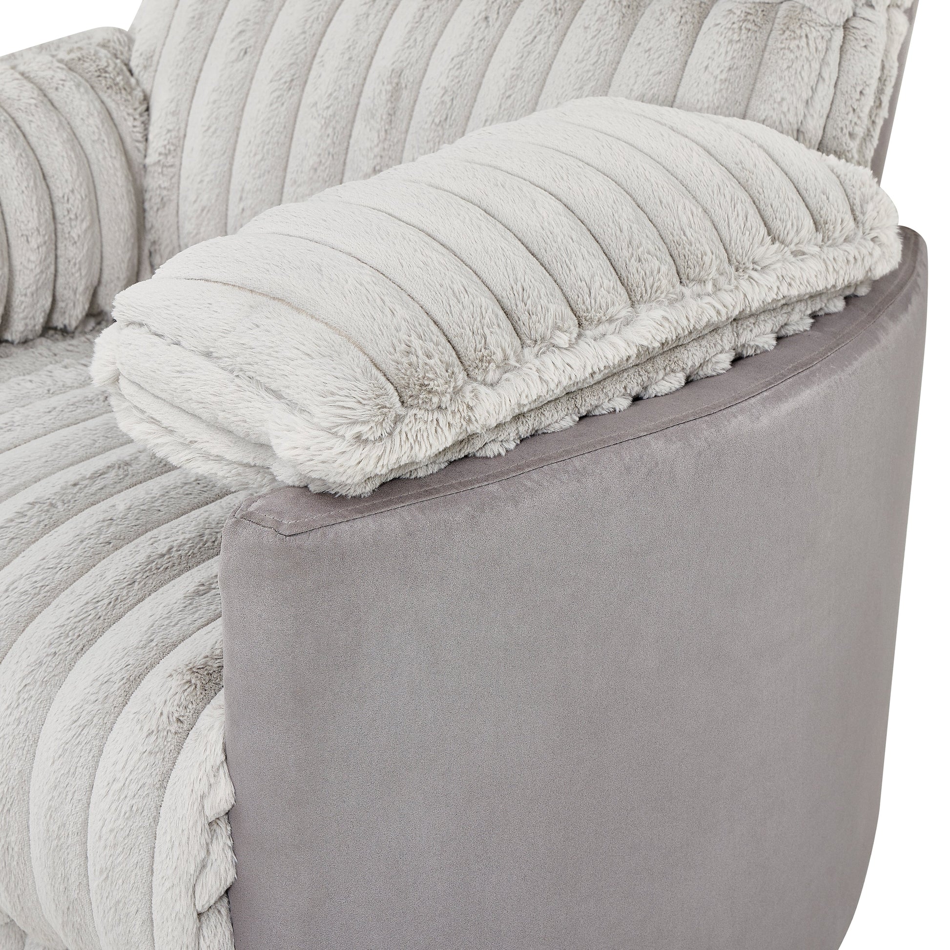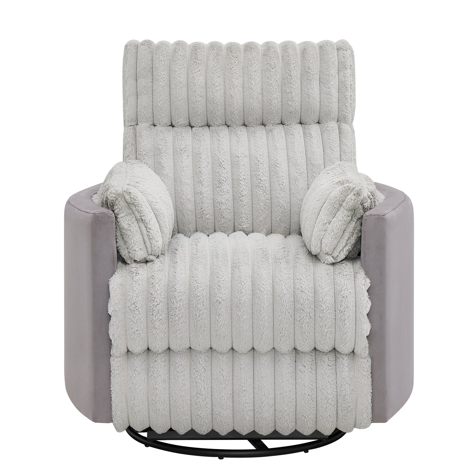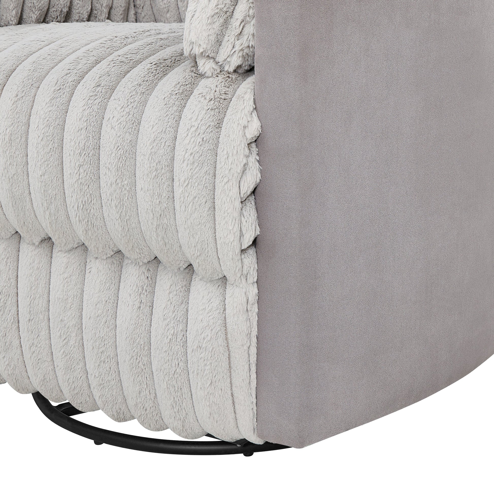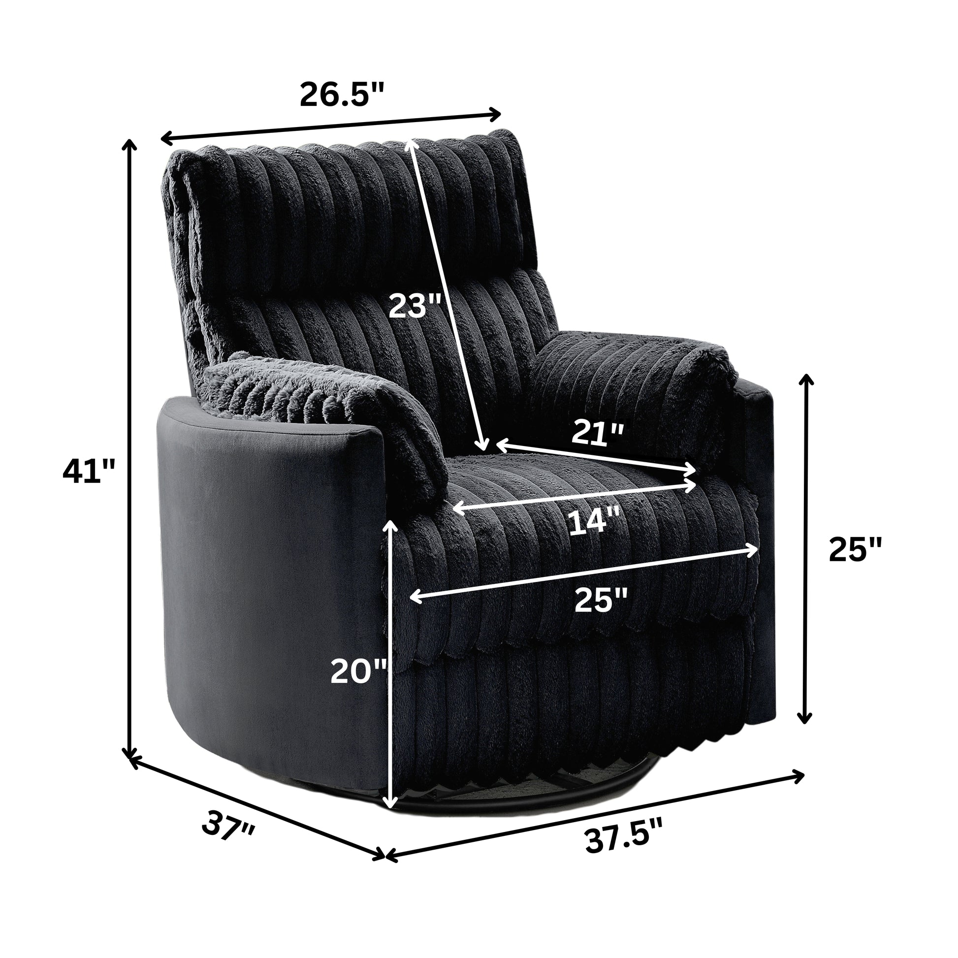 Enjoy ultimate relaxation with this wide wale corduroy recliner, upholstered in soft, premium fabric in your choice of elegant gray, cream, and black tones. Its spacious design features plush pillow-top armrests and a wide, comfortable seat, perfect for lounging. Easily adjust the recliner with a simple pull of the handle, and enjoy 360-degree swivel movement for versatile comfort. Feather-soft cushioning, supported by pocket and sinuous springs, provides a cloud-like experience. Built with a solid plywood frame and sturdy metal base, this recliner offers long-lasting durability, making it the perfect blend of style and affordability for any home.