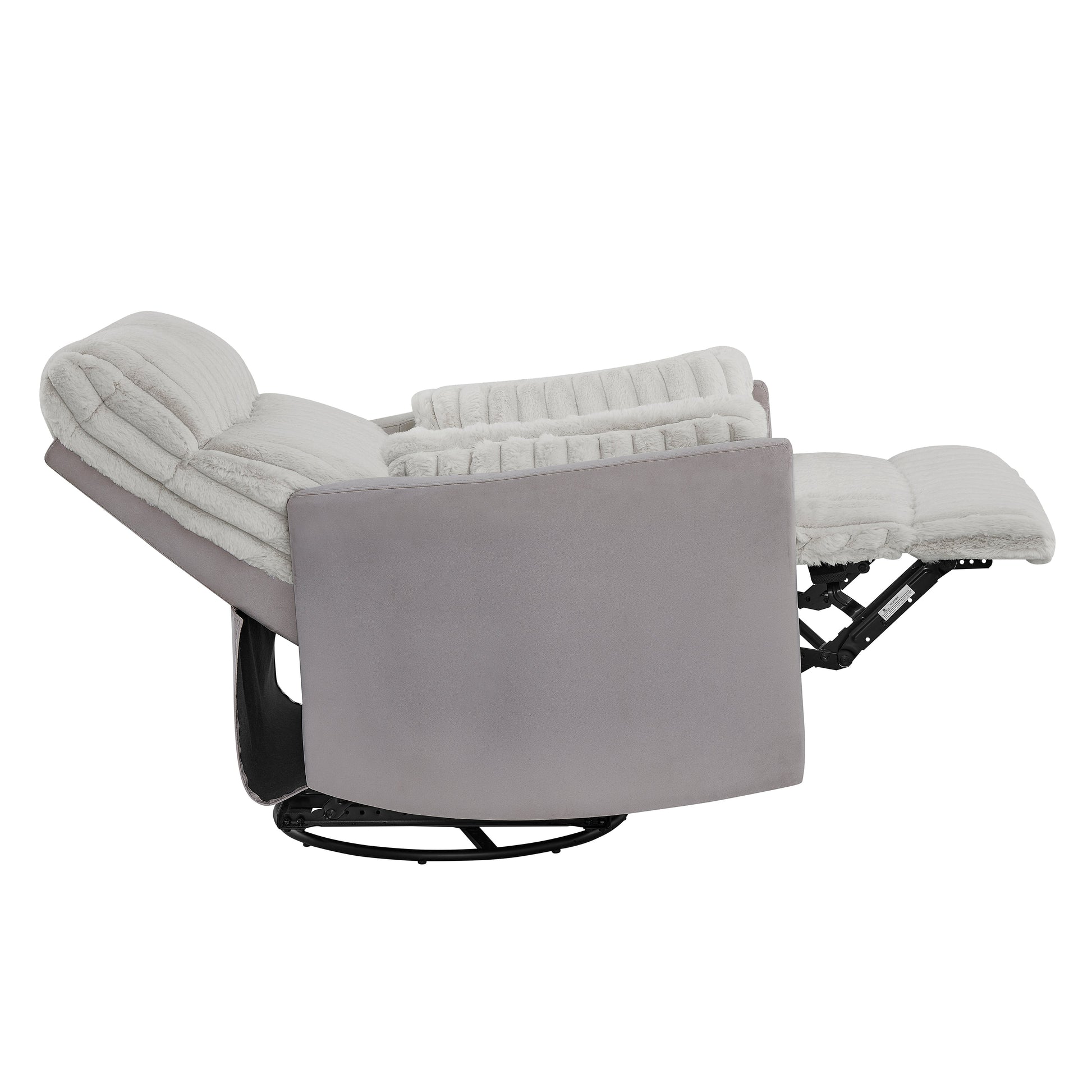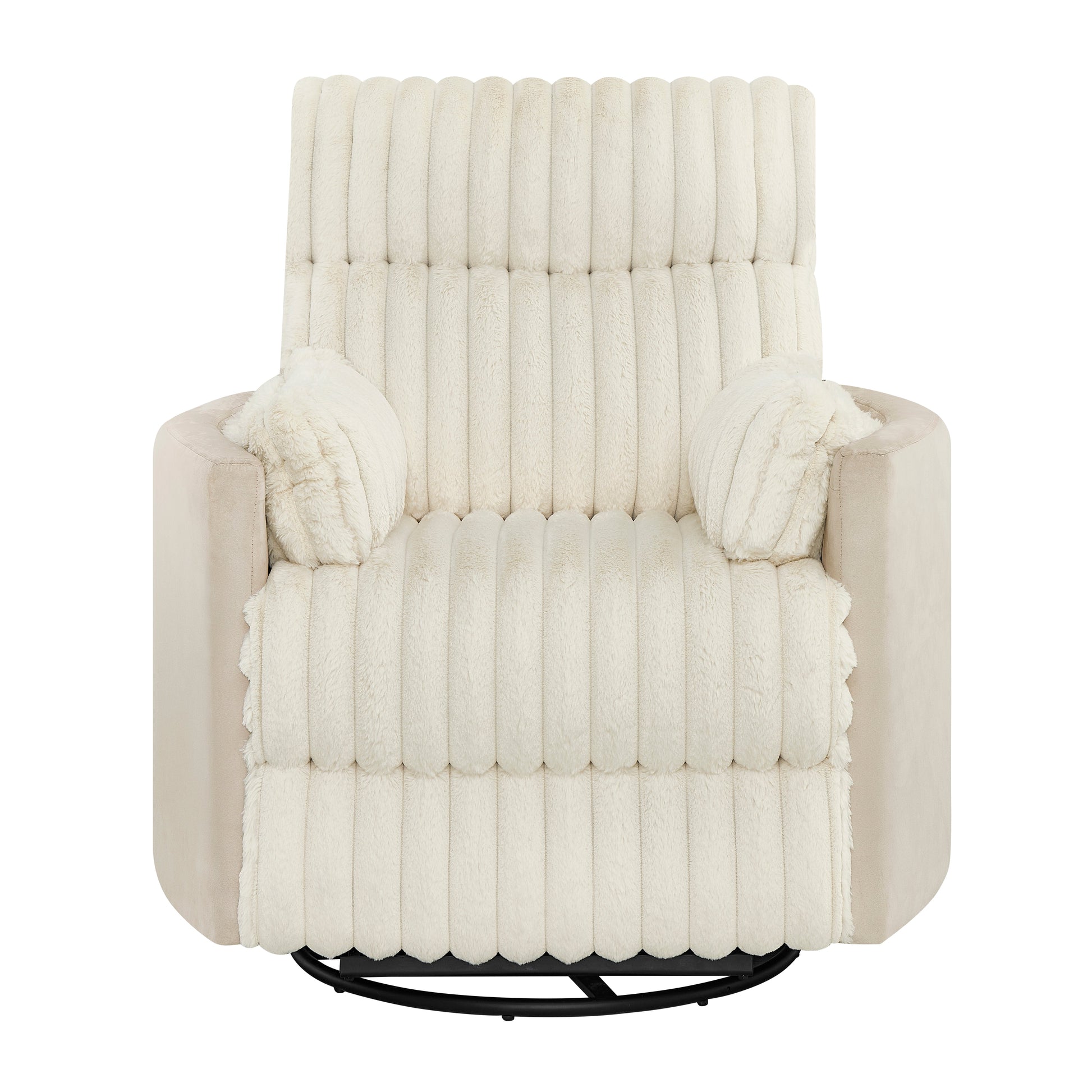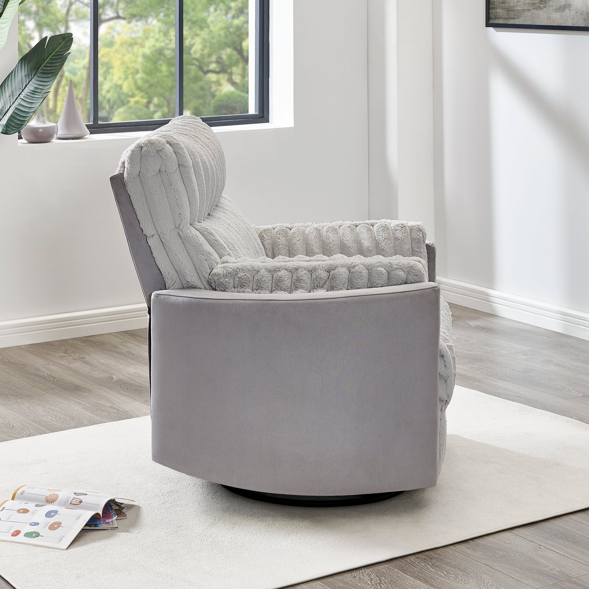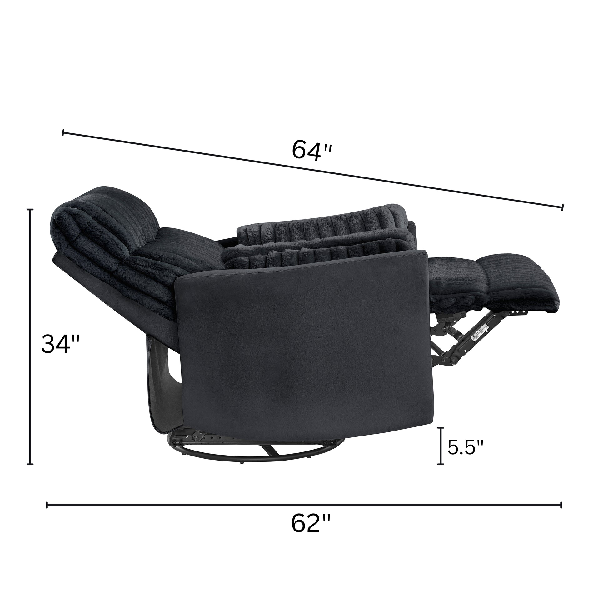 Enjoy ultimate relaxation with this wide wale corduroy recliner, upholstered in soft, premium fabric in your choice of elegant gray, cream, and black tones. Its spacious design features plush pillow-top armrests and a wide, comfortable seat, perfect for lounging. Easily adjust the recliner with a simple pull of the handle, and enjoy 360-degree swivel movement for versatile comfort. Feather-soft cushioning, supported by pocket and sinuous springs, provides a cloud-like experience. Built with a solid plywood frame and sturdy metal base, this recliner offers long-lasting durability, making it the perfect blend of style and affordability for any home.
