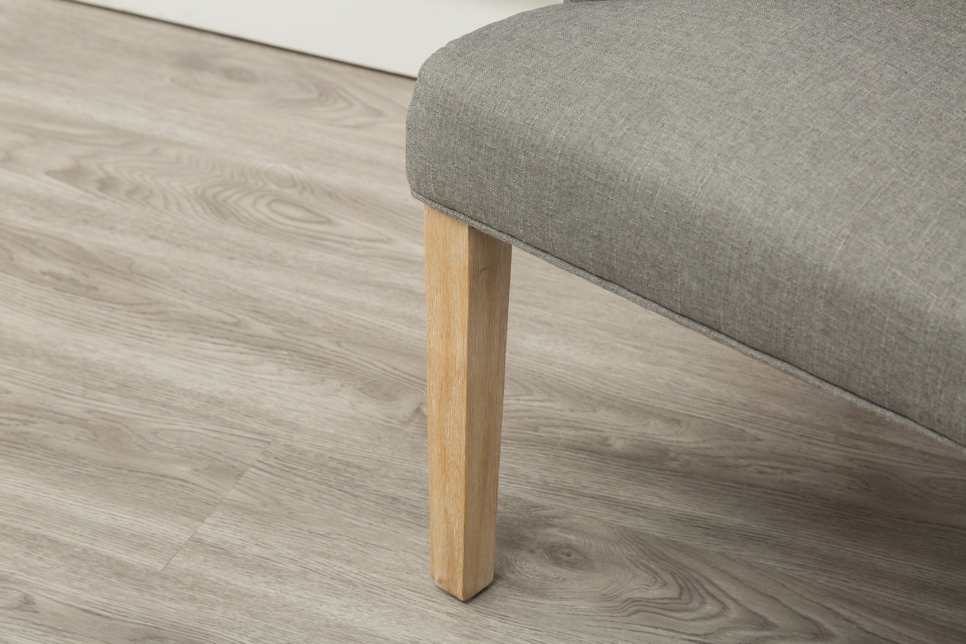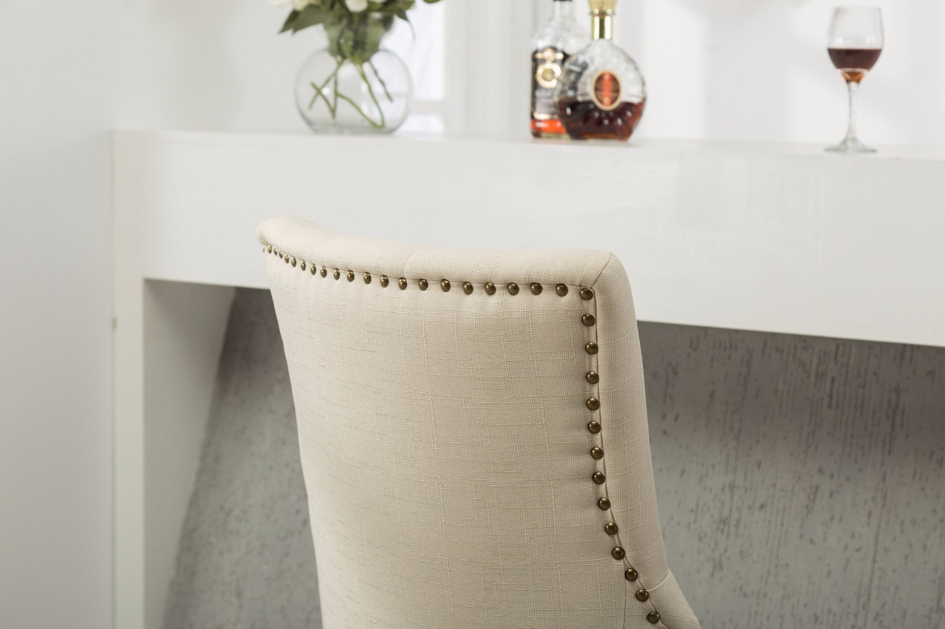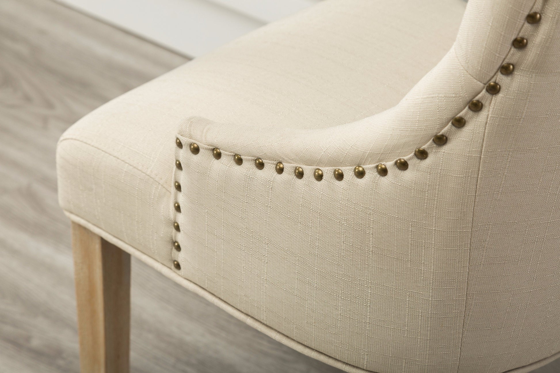 Give your dining room a touch of rustic elegance with these linen-look upholstered dining chairs. Traditionally inspired details like a wingback design and button tufting give a formal air, while a natural wood grain finish, and simplified contours keep the look understated. Choose between three colors upholstery options to find your perfect style.
