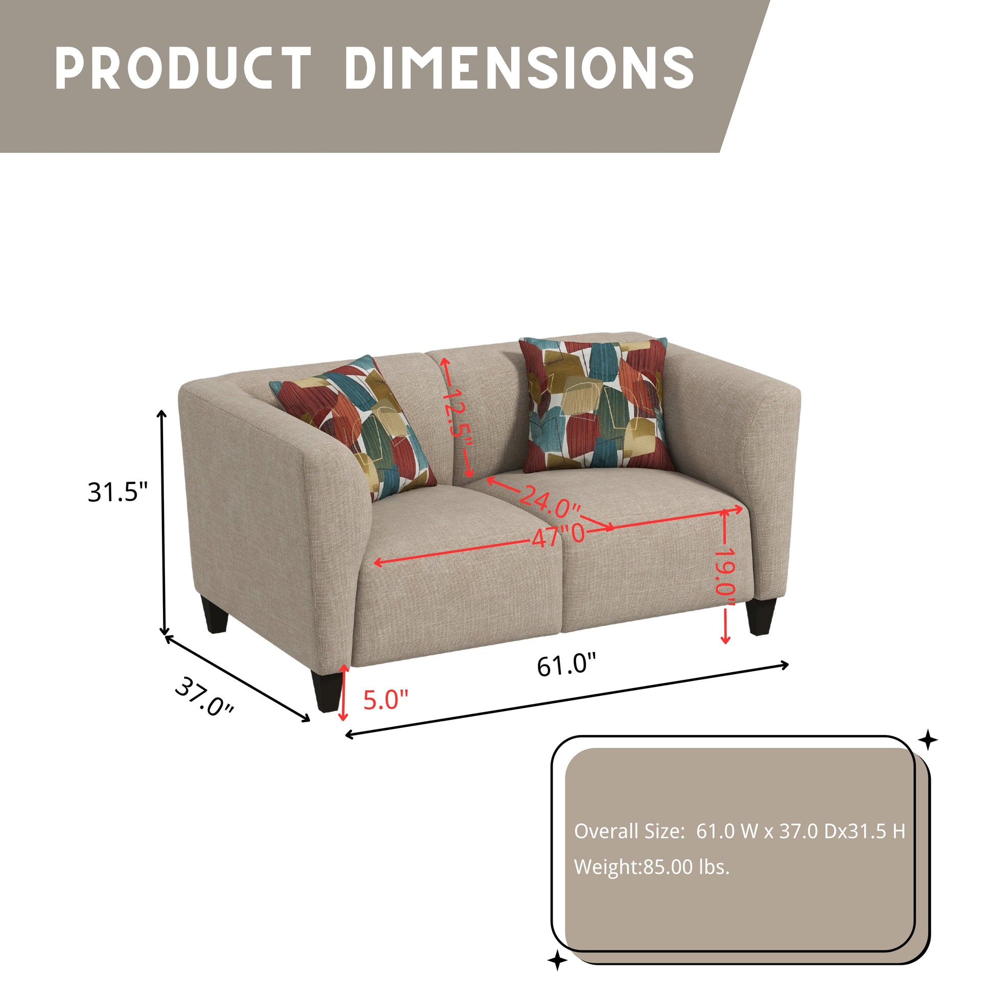 Loveseat: 37.0D x 61.0W x 31.5H;Seat: 24D x 47W x 19H in.