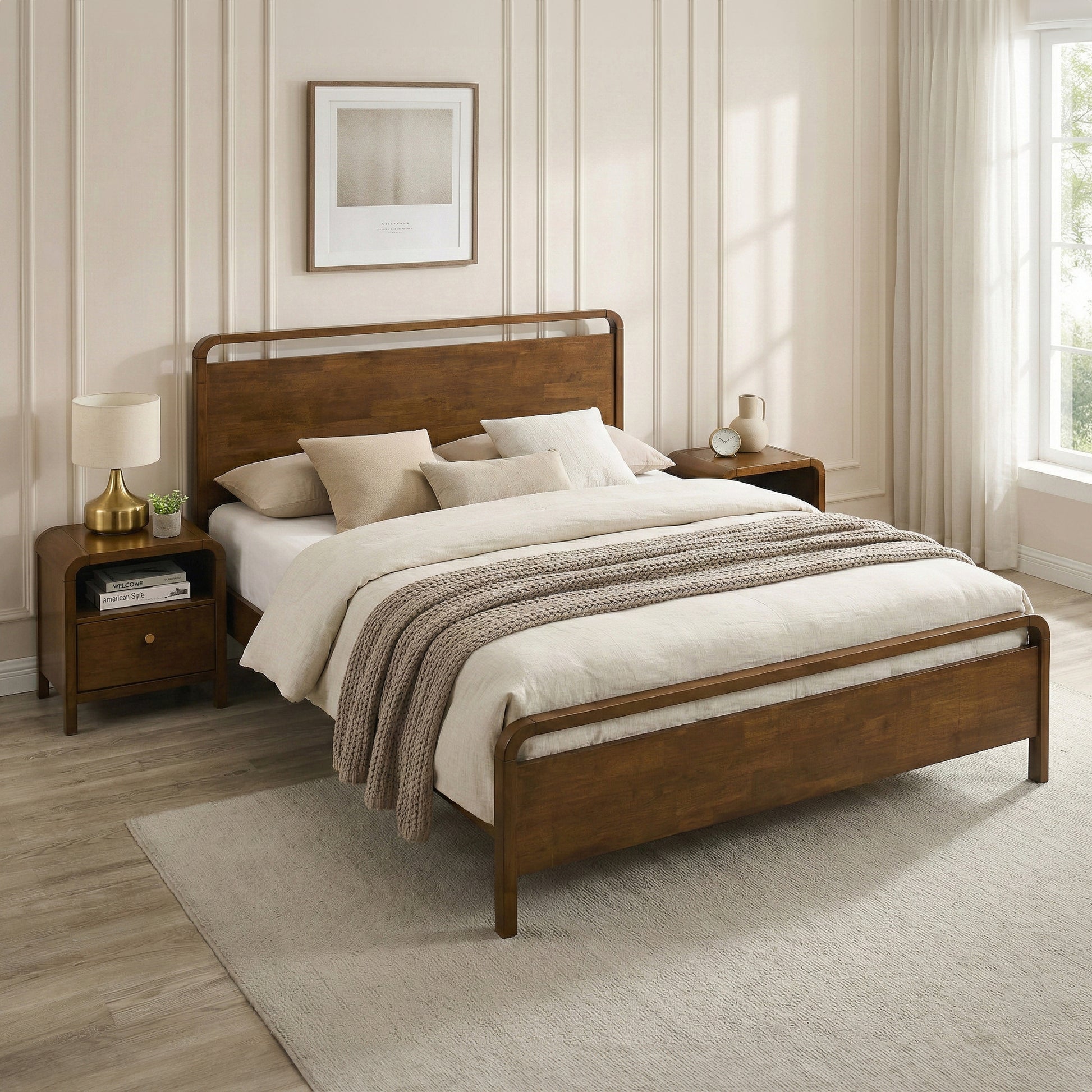 Create a warm and cohesive bedroom with the Roundhill Furniture Eldren Wood 3-Piece Bedroom Set, featuring a platform bed and two matching nightstands. Crafted for everyday comfort and durability, the bed showcases a sturdy rubberwood frame with MDF and veneer body panels, finished in a rich walnut tone that highlights natural wood character. The platform design includes supportive wood slats, eliminating the need for a box spring. Completing the set, the two nightstands offer convenient bedside storage with smooth drawers and open shelving, perfect for books, lighting, and daily essentials. Together, this set delivers timeless style, dependable construction, and a calm, inviting feel ideal for modern and transitional bedrooms.