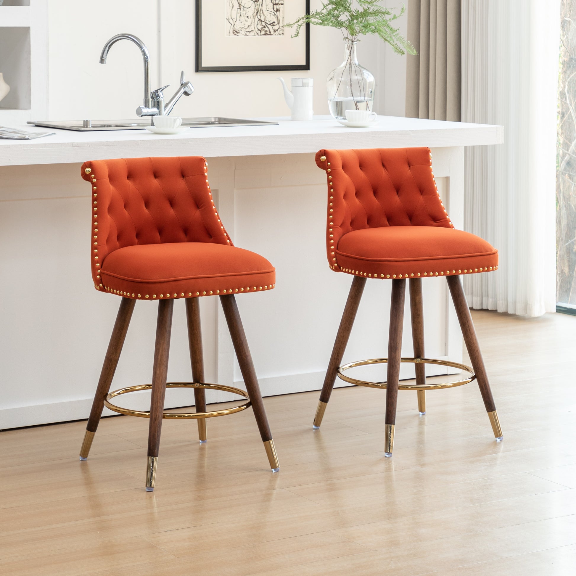 Roundhill Furniture Elvara Set of 2 Button-Tufted Counter Stools with Nailhead Trim seamlessly blend timeless craftsmanship with modern elegance. Designed with a rolled backrest, plush button-tufted upholstery, and hand-applied nailhead trim, these stools offer both style and comfort. A sleek metal pull ring on the back enhances functionality, while sturdy bentwood legs with metal-capped accents ensure lasting durability. The circular footrest provides additional support, and anti-slip pads help protect your flooring. Perfect for kitchen islands, home bars, or dining areas, these stools offer the ideal combination of elegance and practicality. Available in blue and orange, they add a vibrant touch to any space.