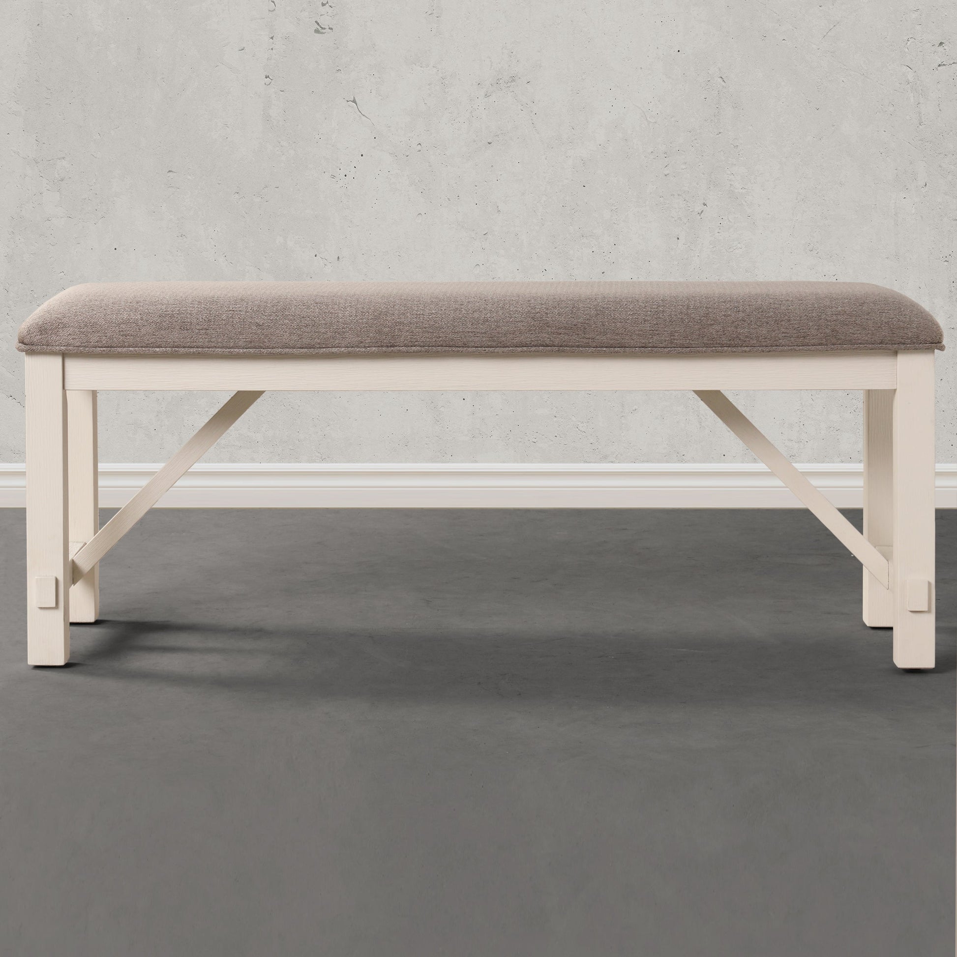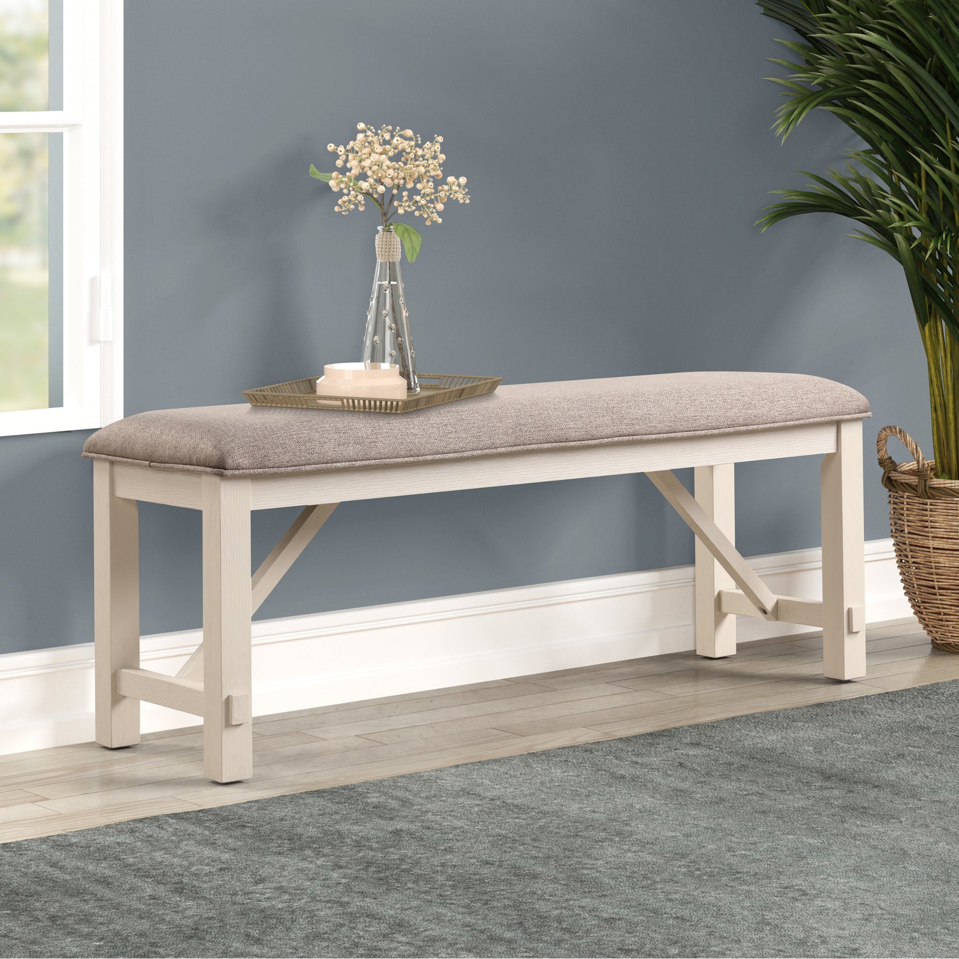 Experience the perfect blend of French country charm and versatile functionality with Roundhill Furniture Fasena Off White Solid Wood Upholstered Bench. Upholstered in a sophisticated gray fabric, this bench exudes timeless style and invites you to sit back and relax. The thick foam padded seat ensures optimal comfort, whether you're enjoying a meal in the dining room, adding a touch of luxury to your bedroom, or creating a welcoming atmosphere in your entryway. Crafted with a solid rubberwood base and finished in an exquisite off-white shade, this bench combines durability and beauty. Its sturdy construction allows it to comfortably seat two people, making it ideal for gatherings with friends and family. Whether you're enjoying a leisurely meal or adding extra seating to your living space, this versatile bench will effortlessly elevate your decor.