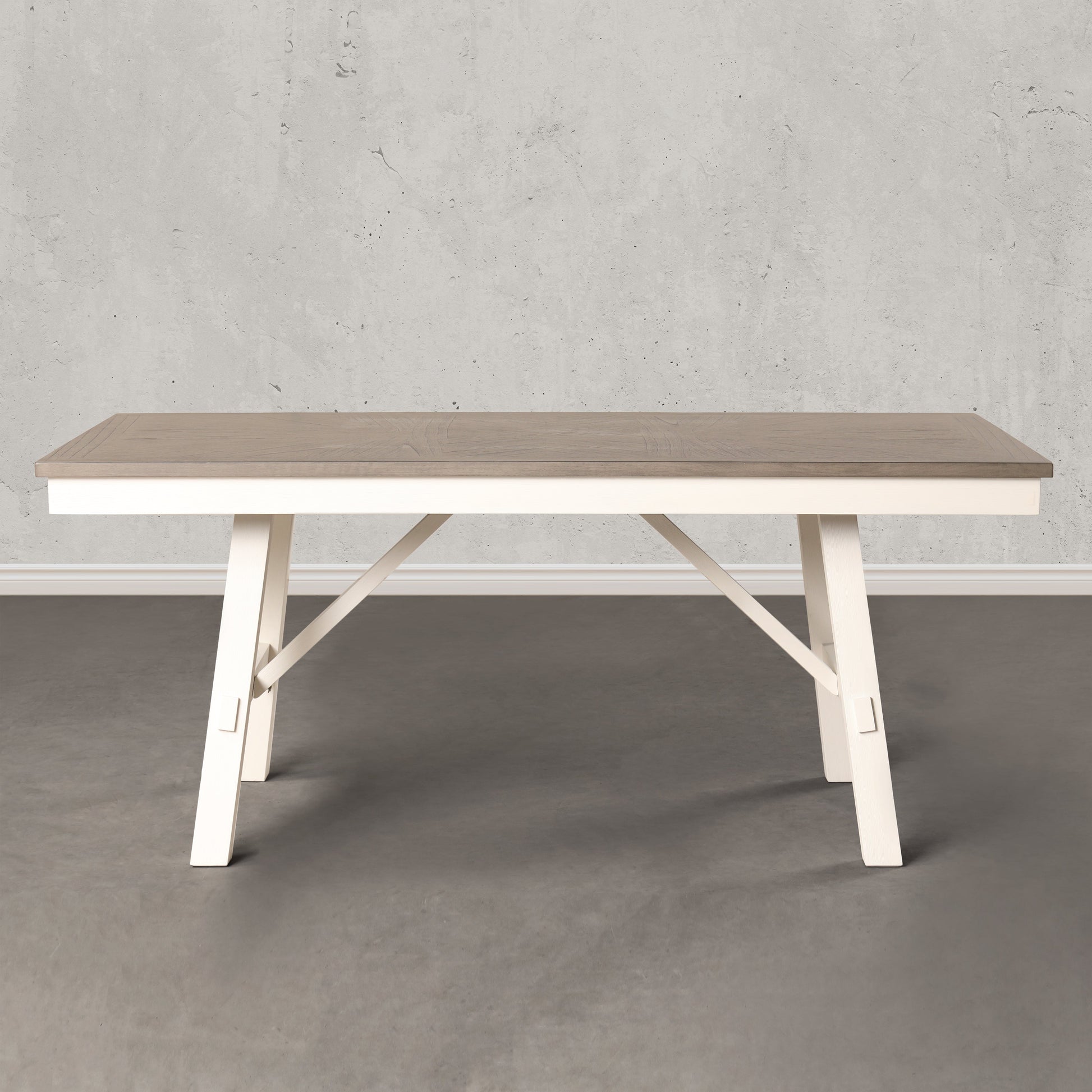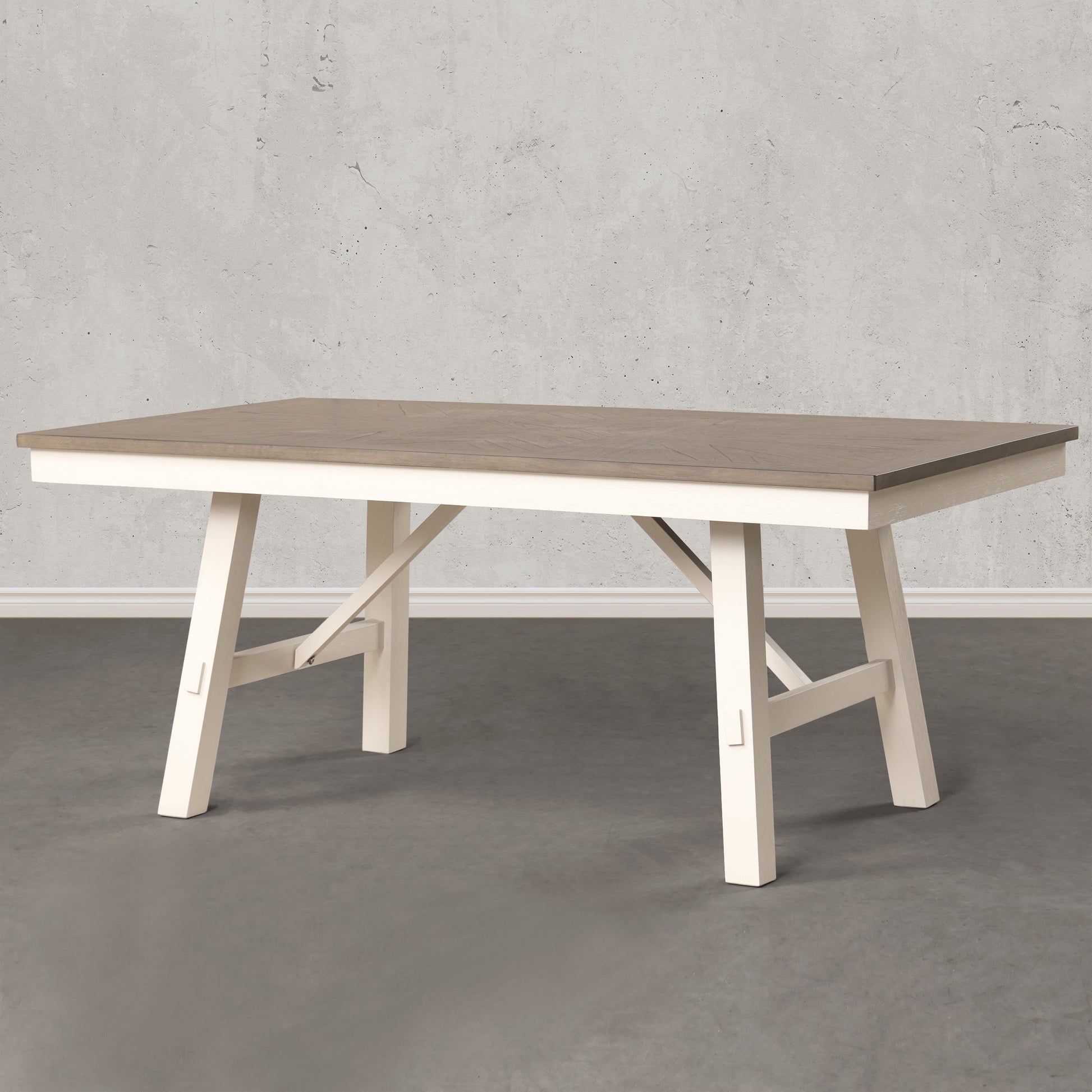Introducing the Roundhill Furniture Fasena Rectangular Trestle Dining Table, a French country-inspired centerpiece that effortlessly combines rustic charm with sophisticated style. With its rectangular shape and spacious design, this table comfortably accommodates up to six guests, making it perfect for intimate gatherings or lively family meals. The table features a sturdy trestle base, providing both stability and an architectural focal point. Crafted from solid rubberwood, the base showcases durability and exquisite craftsmanship. The tabletop, made of MDF with a wood veneer finish, adds a touch of warmth and elegance. The rustic gray and off-white finish exudes a captivating allure that effortlessly enhances any interior. Practicality is paramount, with the tabletop offering ample space for hosting delightful feasts or displaying cherished centerpieces. Maintenance is a breeze thanks to the durable finish.