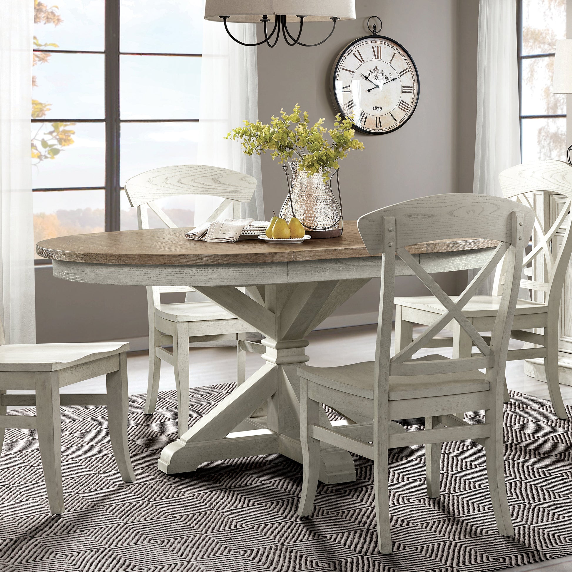 - Coastal Farmhouse Style: The combination of distressed pine and smoky white finishes, along with a pedestal base, adds coastal farmhouse charm to your dining space.