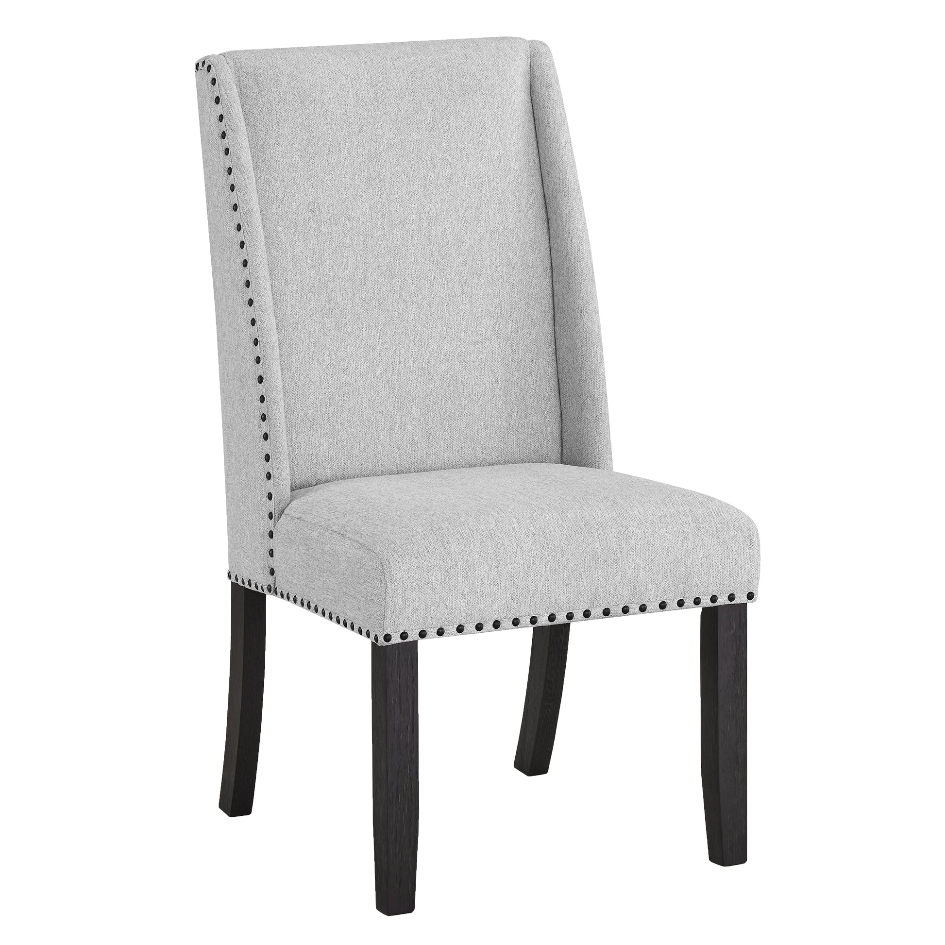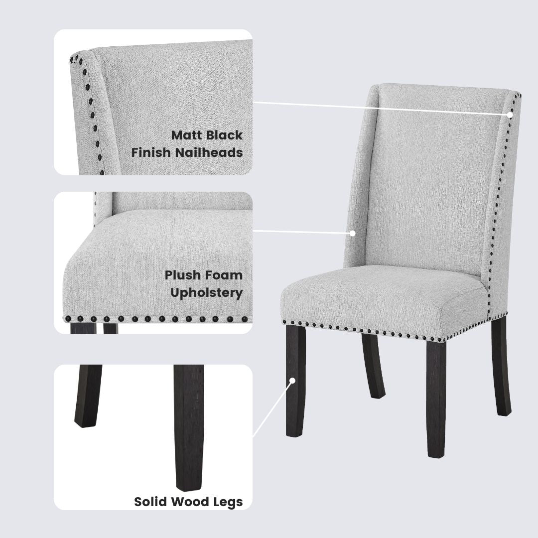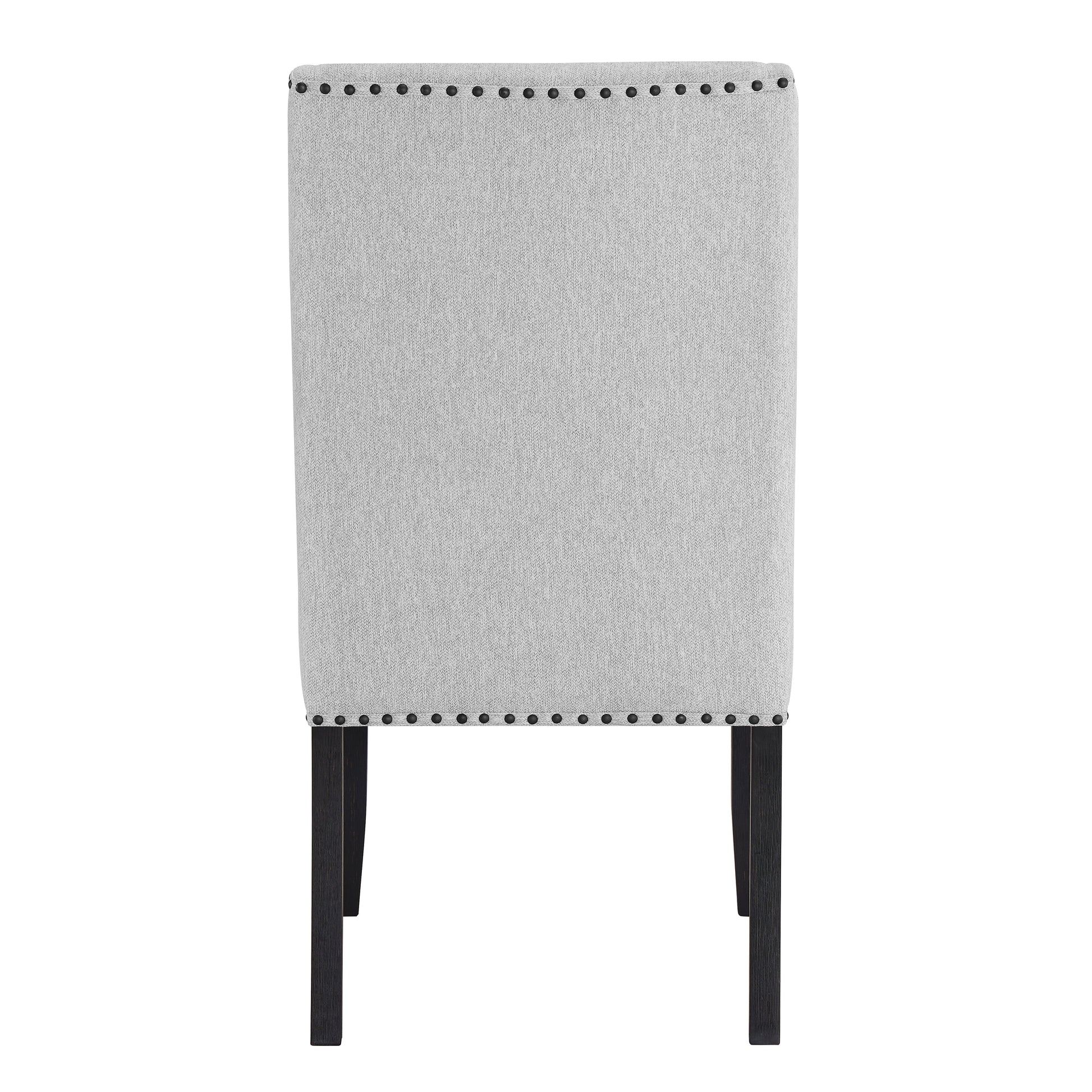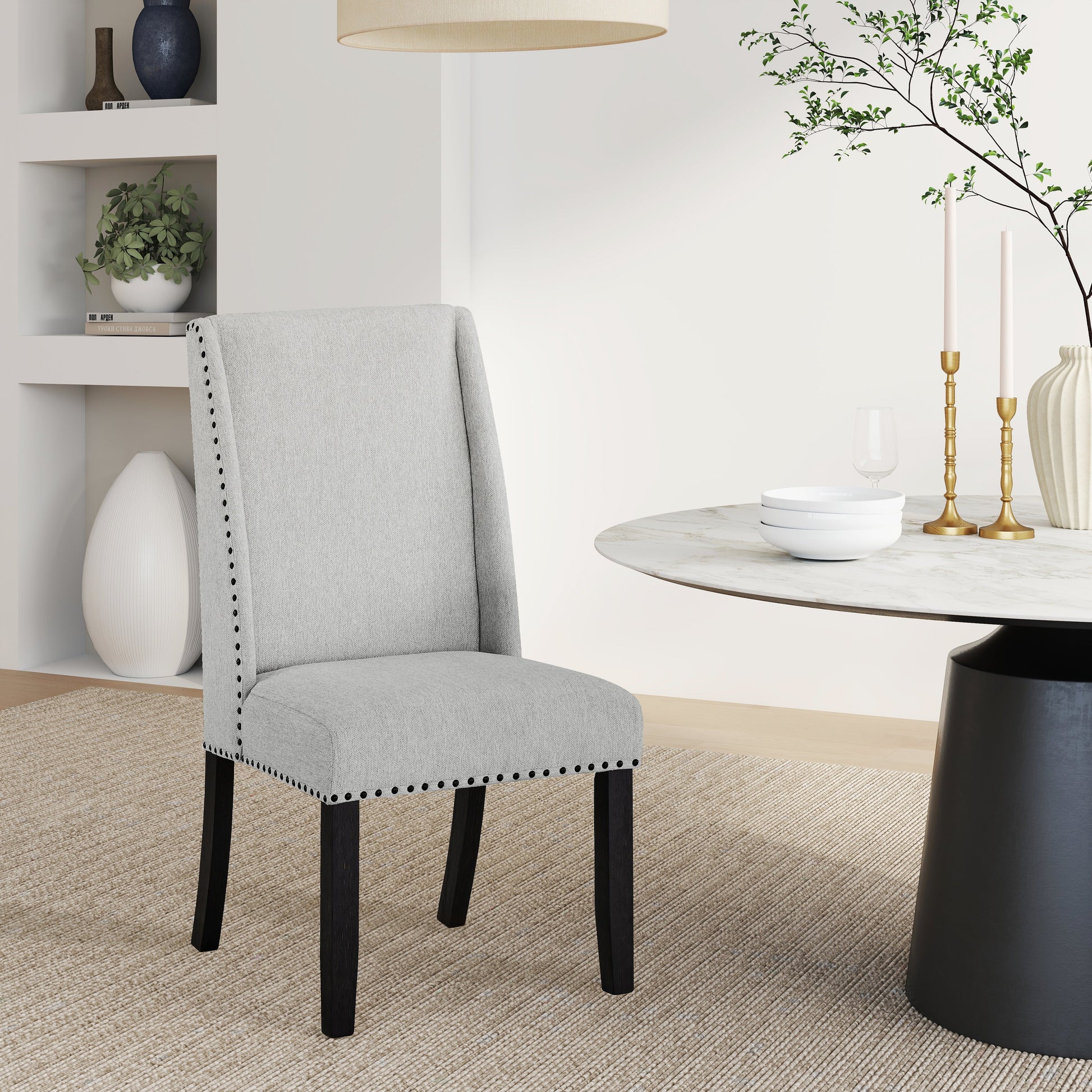 - Upholstered in solid light gray fabric, these chairs feature a sleek silhouette and matte black nailhead trim, adding a modern touch to any dining space