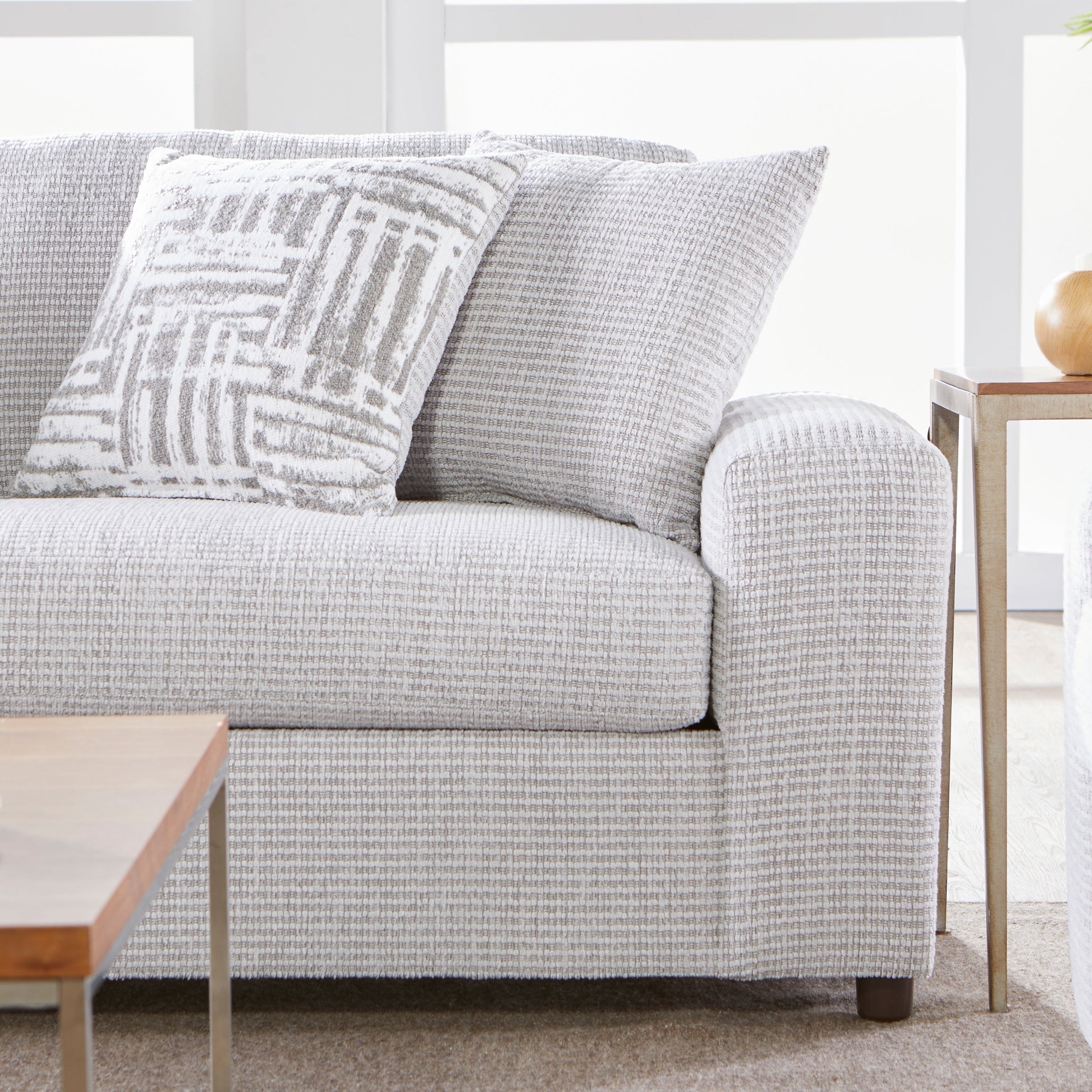 - [TRENDING TEXTURED UPHOLSTERY]: Featuring textured upholstery, combining a corner-blocked design and a generous size for ultimate comfort. Its sleek, sculptural lines, and track arms are highlighted in bold, vibrant tones, making it a standout piece in any room. Matching accent pillows included.
