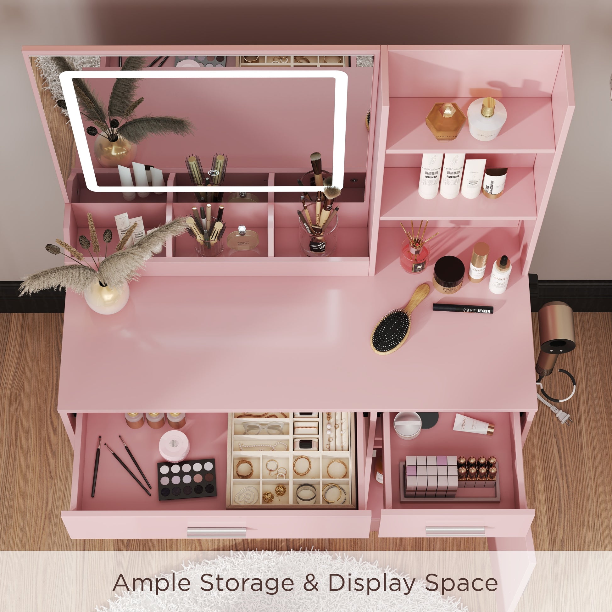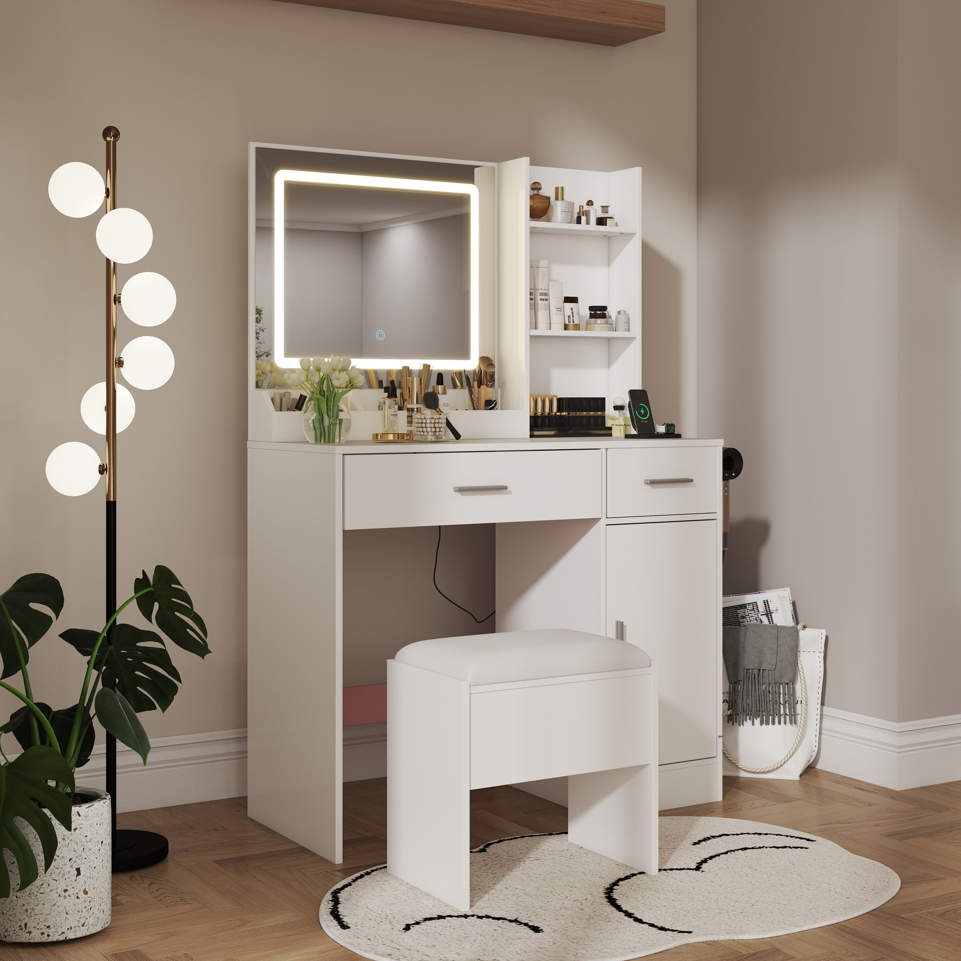 - [SMART STORAGE SOLUTIONS]: Maximize organization with 2 spacious drawers with smooth-gliding mechanisms, open shelves for quick-access essentials, and a roomy storage cabinet, designed to declutter your space. Store makeup, skincare, and accessories neatly while maintaining a sleek, polished aesthetic.