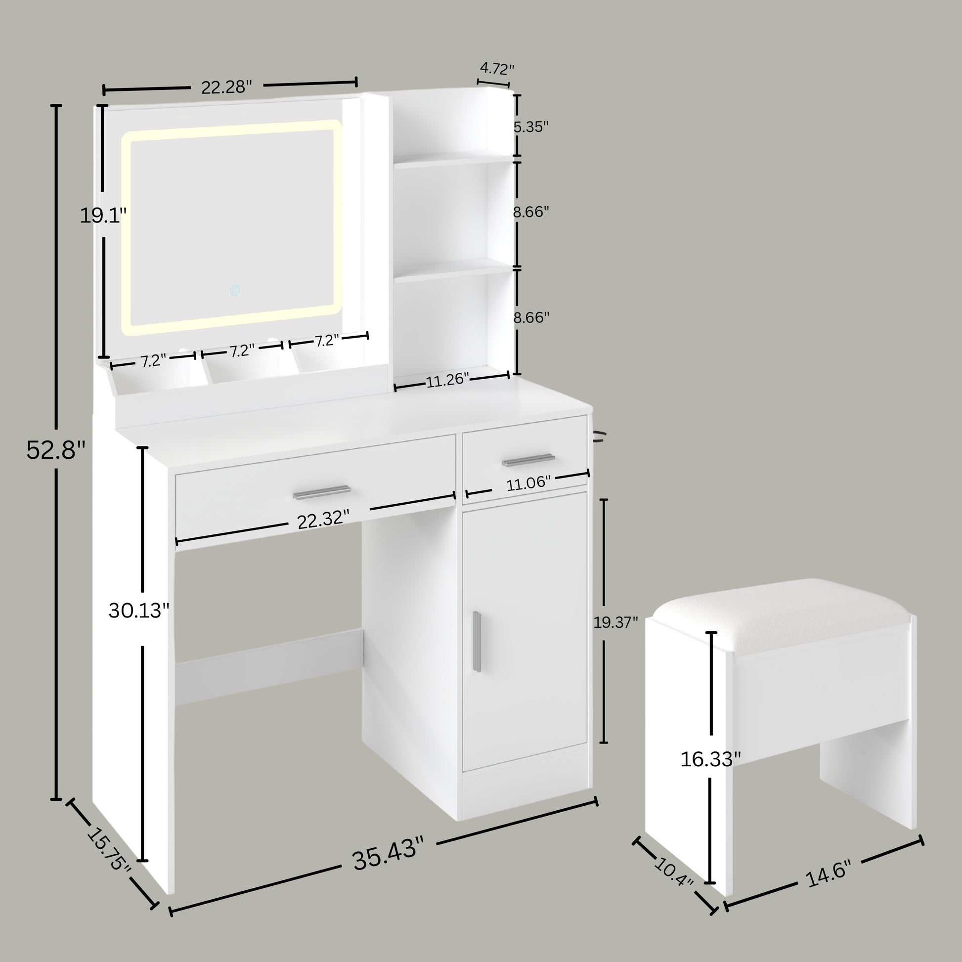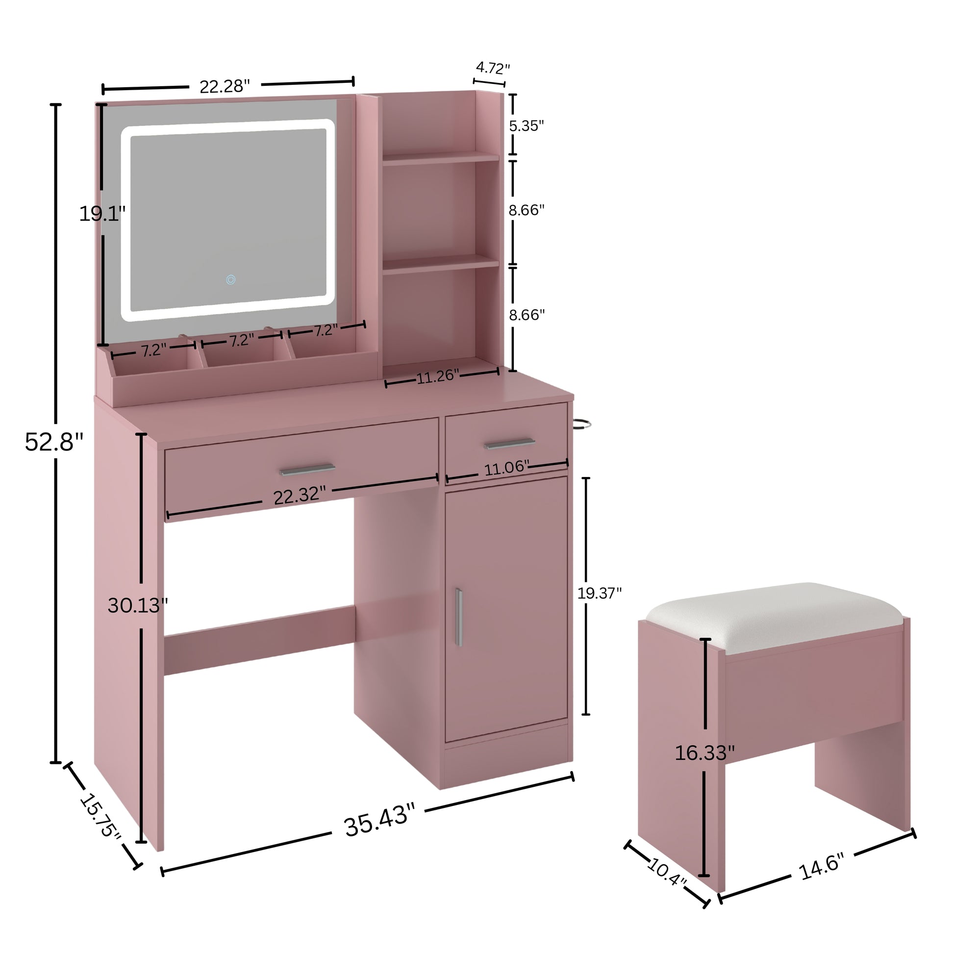 Vanity Desk: 35.43W x 15.75D x 52.8H;