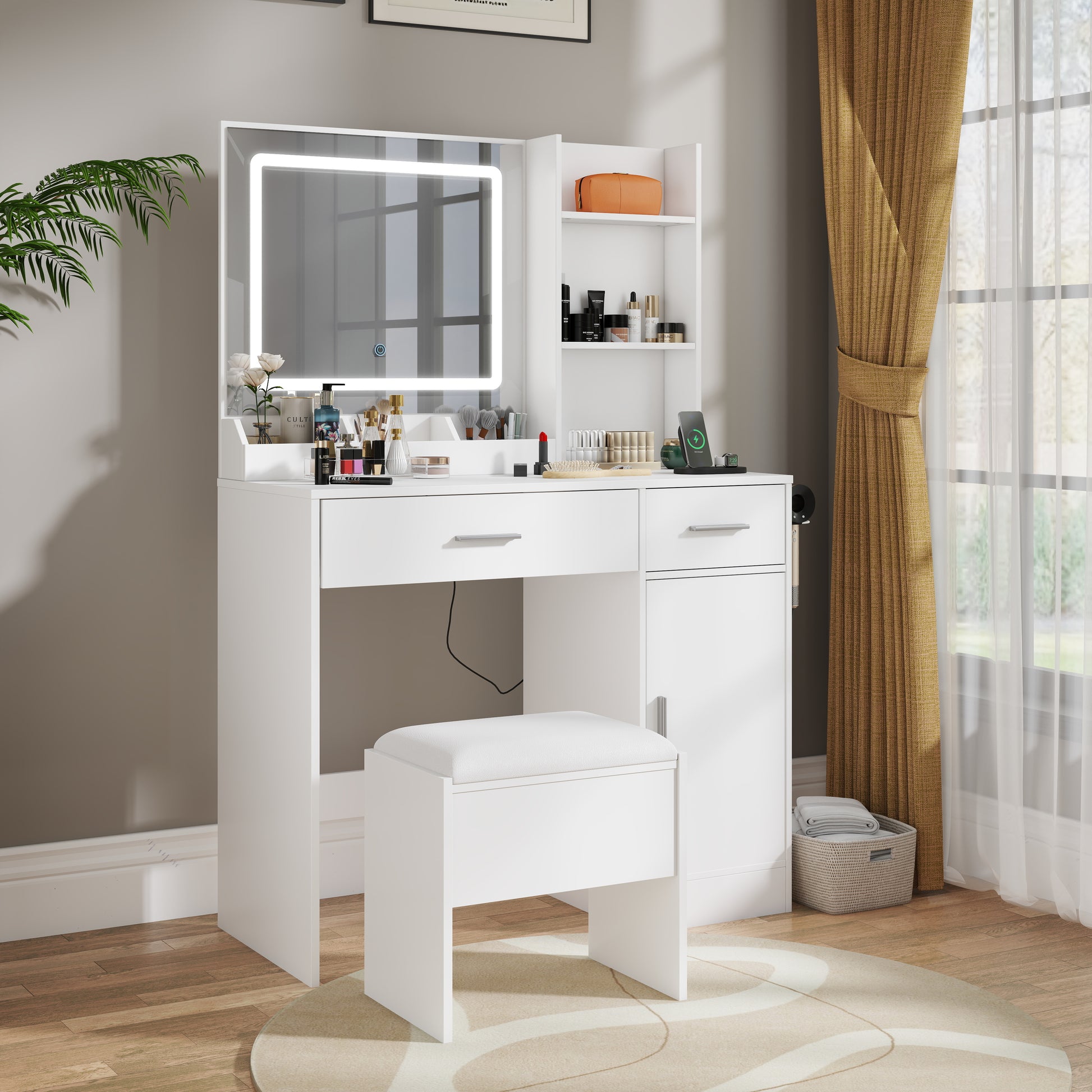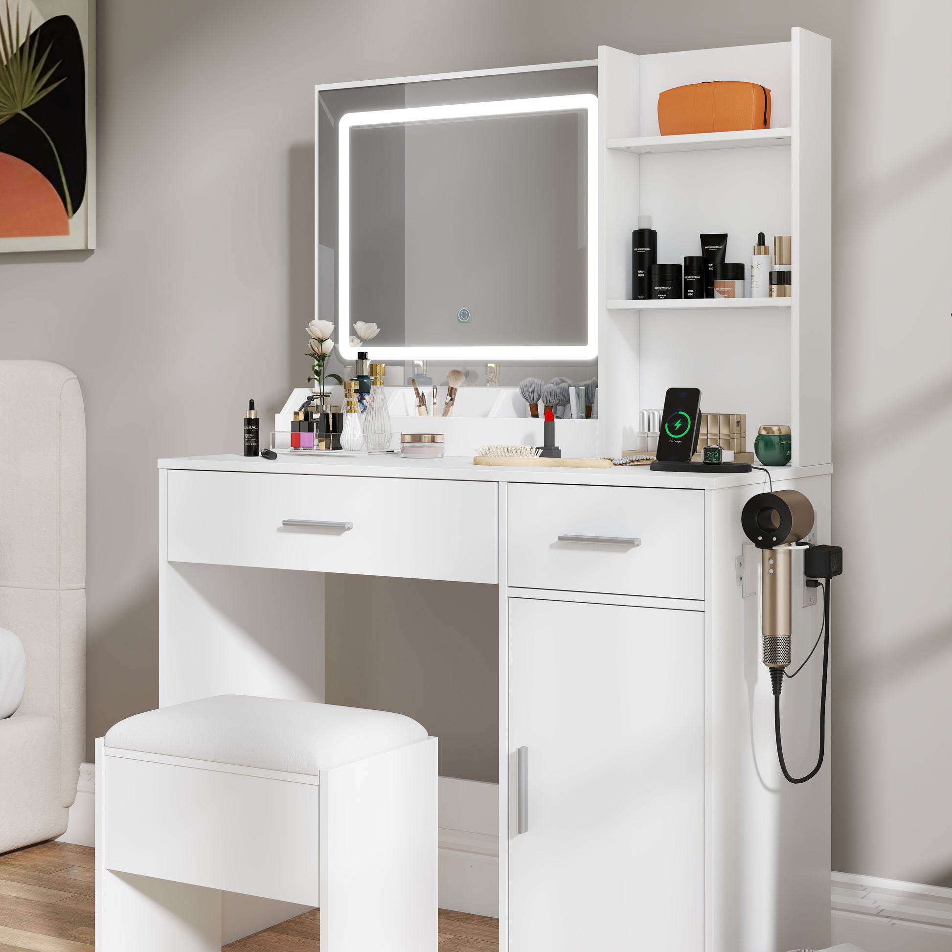 The Roundhill Furniture Lavin Makeup Vanity Set redefines beauty routines with its elegant blend of modern functionality and chic design. This vanity desk transforms your space into a luxurious dressing oasis. The built-in LED mirror offers three adjustable lighting modes: warm, natural, and cool white -- to flawlessly adapt to any occasion or lighting need. Stay connected with the integrated charging station, featuring 2 outlets and a USB port, while the hair dryer rack and open shelves keep essentials neatly organized. Two spacious drawers and a storage cabinet provide ample room for cosmetics, jewelry, and accessories, complemented by a plush upholstered stool for added comfort.