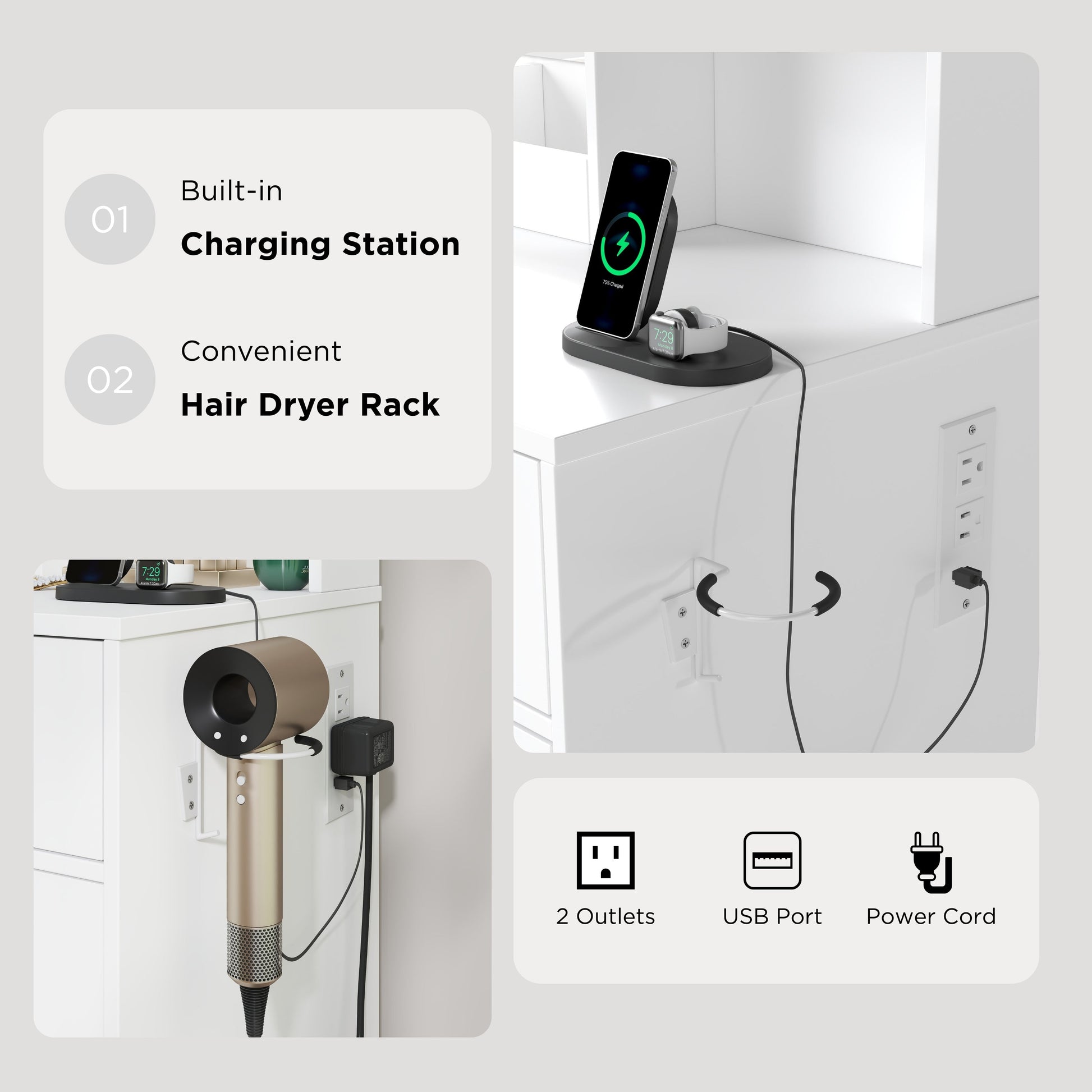 - [MODERN CONVENIENCE & TECH]:??Elevate your routine with a smart LED mirror offering 3 customizable lighting modes and a built-in charging station (2 outlets + USB port) to keep devices powered. The dedicated hair dryer rack ensures tools are always within reach, blending tech-savvy design with everyday ease.