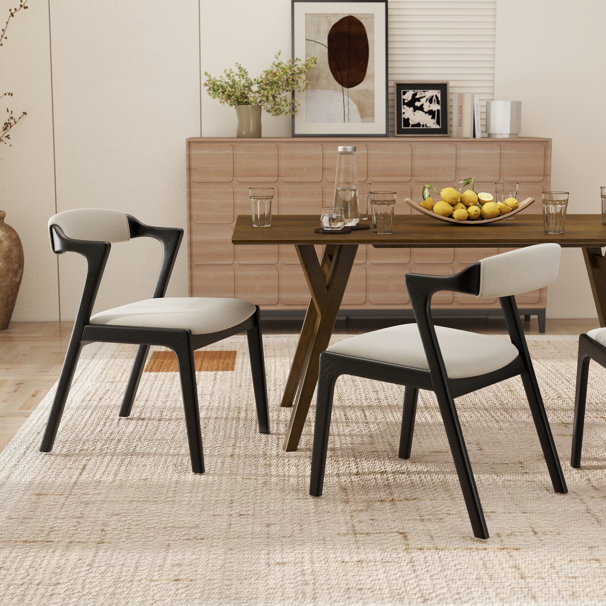 Bring timeless style and comfort to your dining space with the Lavinn Dining Chairs. Designed with a contemporary silhouette, these chairs feature solid rubberwood frames finished in your choice of rich walnut and black, perfectly complementing the soft, neutral-toned upholstered seat and backrest. The ergonomic design offers both support and relaxed comfort, making them ideal for long meals and gatherings. Sold as a set of two, these chairs blend seamlessly into a variety of interiors, from modern to mid-century inspired spaces.