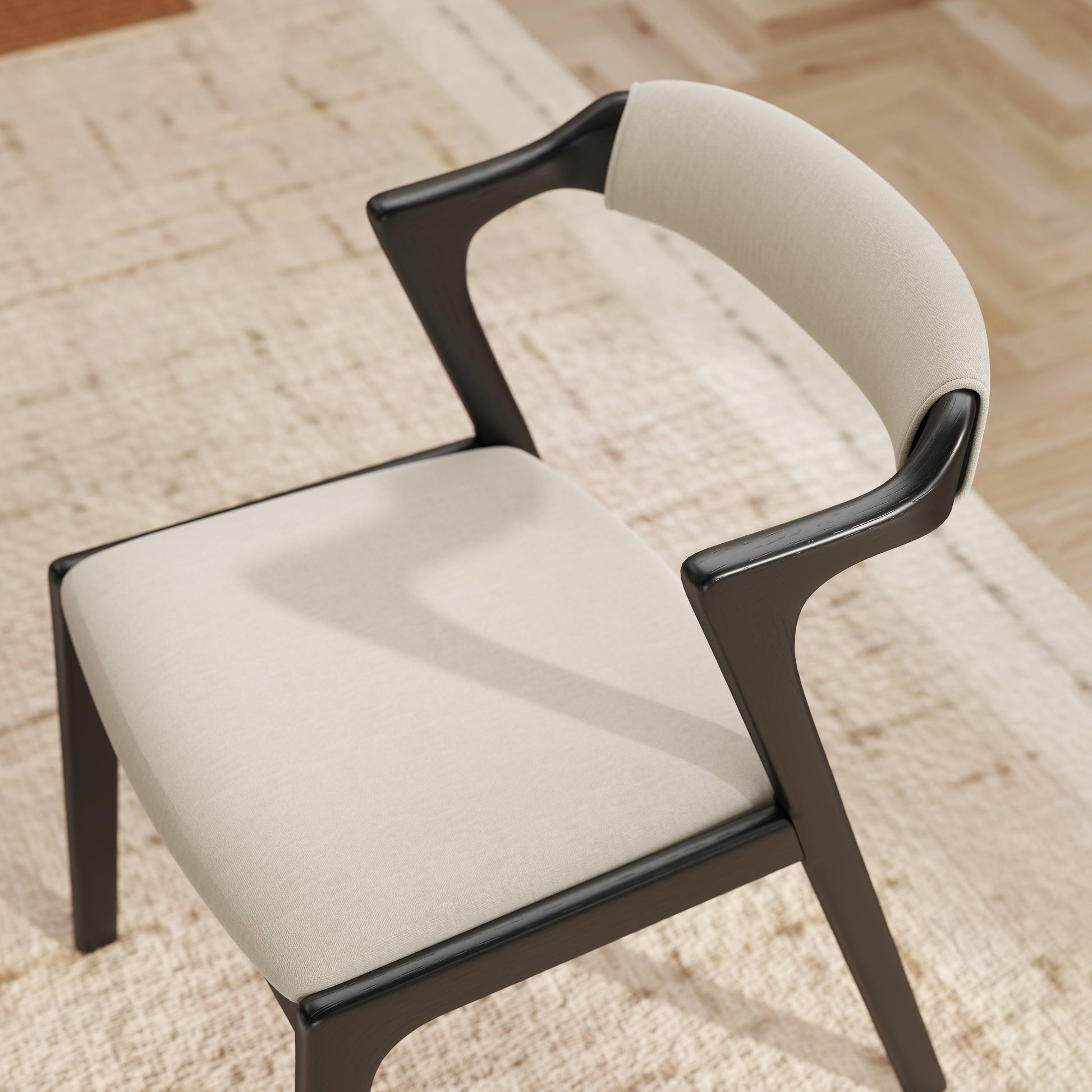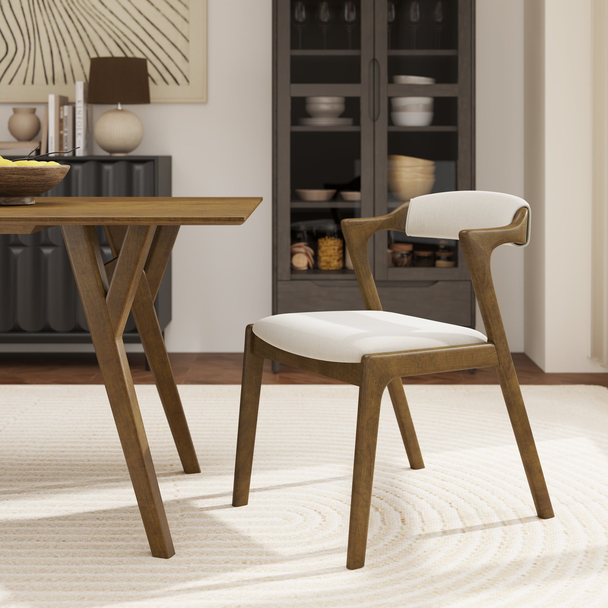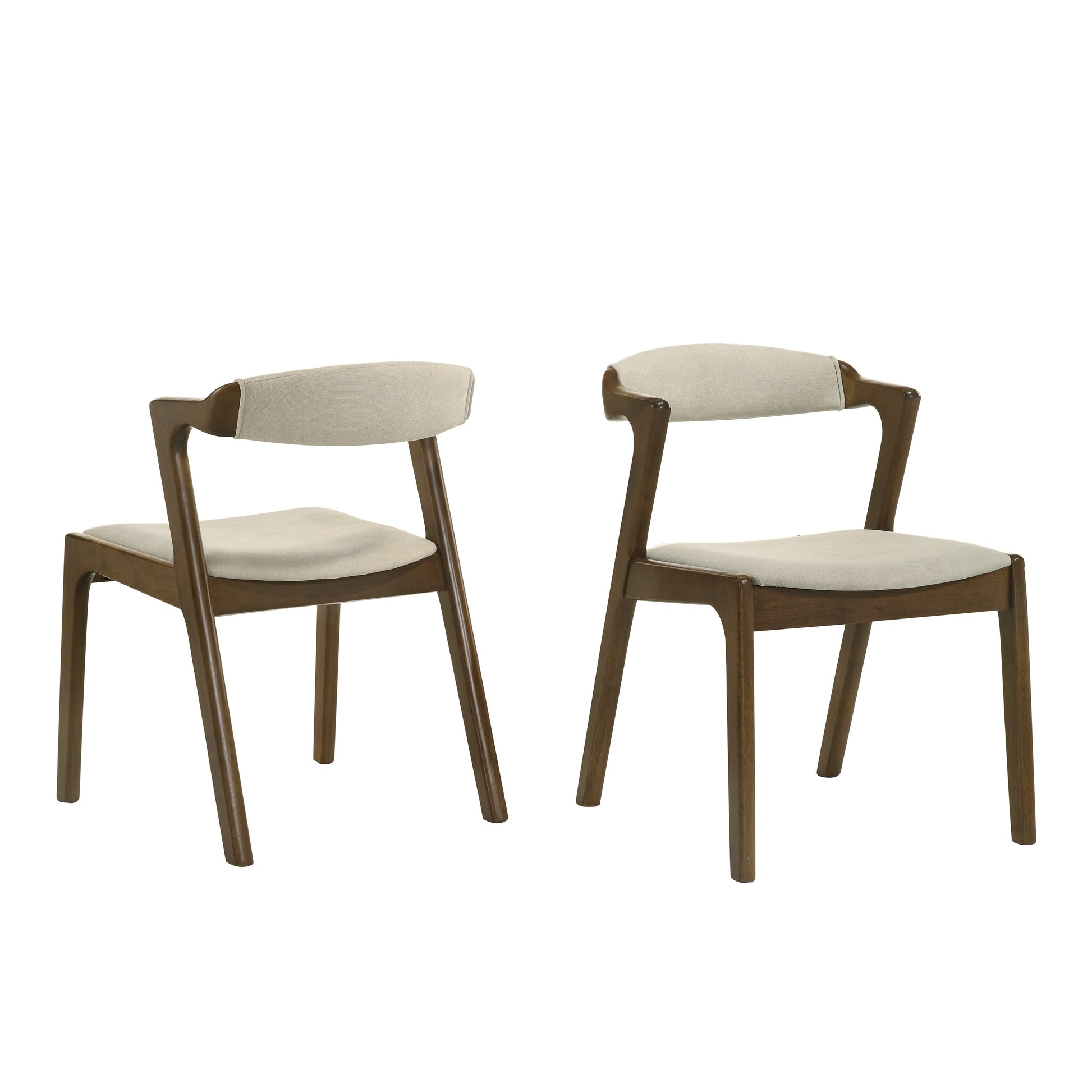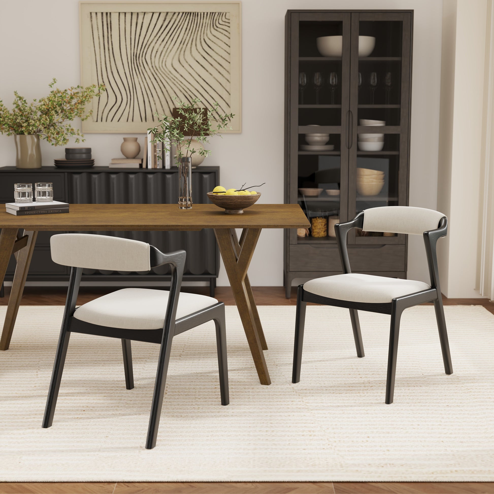 Bring timeless style and comfort to your dining space with the Lavinn Dining Chairs. Designed with a contemporary silhouette, these chairs feature solid rubberwood frames finished in your choice of rich walnut and black, perfectly complementing the soft, neutral-toned upholstered seat and backrest. The ergonomic design offers both support and relaxed comfort, making them ideal for long meals and gatherings. Sold as a set of two, these chairs blend seamlessly into a variety of interiors, from modern to mid-century inspired spaces.