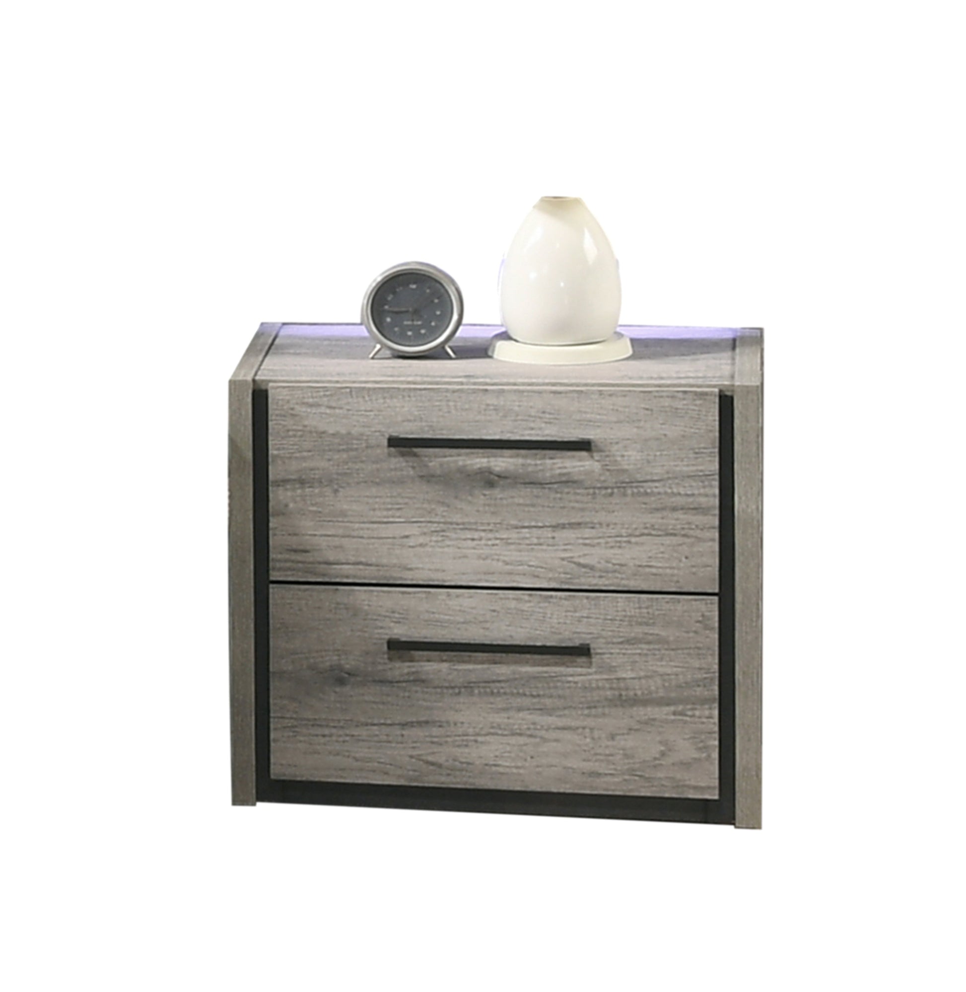 Enhance the functionality and aesthetic appeal of your bedside with the Lenca Nightstand. Part of the Lenca collection, this nightstand effortlessly marries modern design with everyday convenience. It features a weathered gray finish that adds a touch of rustic charm to your bedroom. The sleek black-finished metal drawer handles are not only stylish but also provide easy access to the two spacious drawers. Crafted from engineered wood with MDF construction, this nightstand ensures durability and longevity. The metal drawer glides allow for smooth and quiet operation, while the ample storage space provides a tidy solution for keeping your nighttime essentials close at hand. Complete your bedroom ensemble with this elegant and functional nightstand.