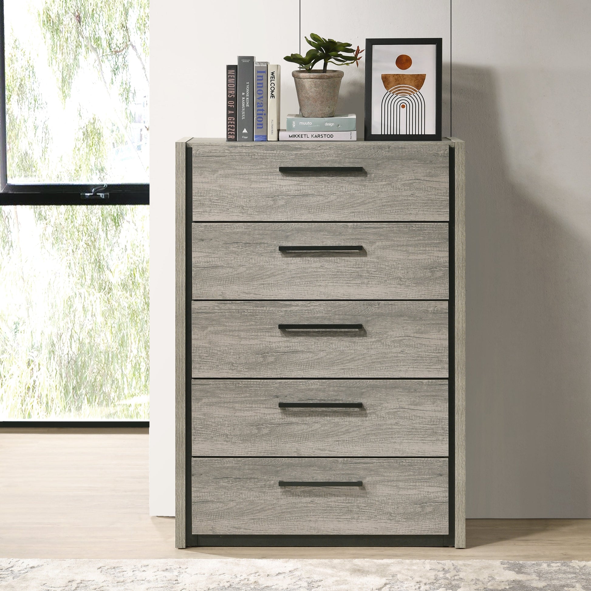 Experience the perfect blend of style and functionality with the Lenca 5-Drawer Chest, a standout piece from the Lenca collection. Crafted to meet your storage needs while adding a touch of modern rustic charm to your space, this chest elevates your bedroom storage. With its weathered gray finish, the Lenca Chest exudes a sense of warmth and character, making it a striking feature in your bedroom. The sleek black finished metal drawer handles provide a striking contrast and add a contemporary touch to the overall design. This chest boasts five spacious drawers, each equipped with metal drawer glides for smooth and effortless operation. Constructed from engineered wood with MDF, this chest is built to last, ensuring long-term durability and reliability. Its timeless design means it will seamlessly blend with a variety of bedroom decor styles.