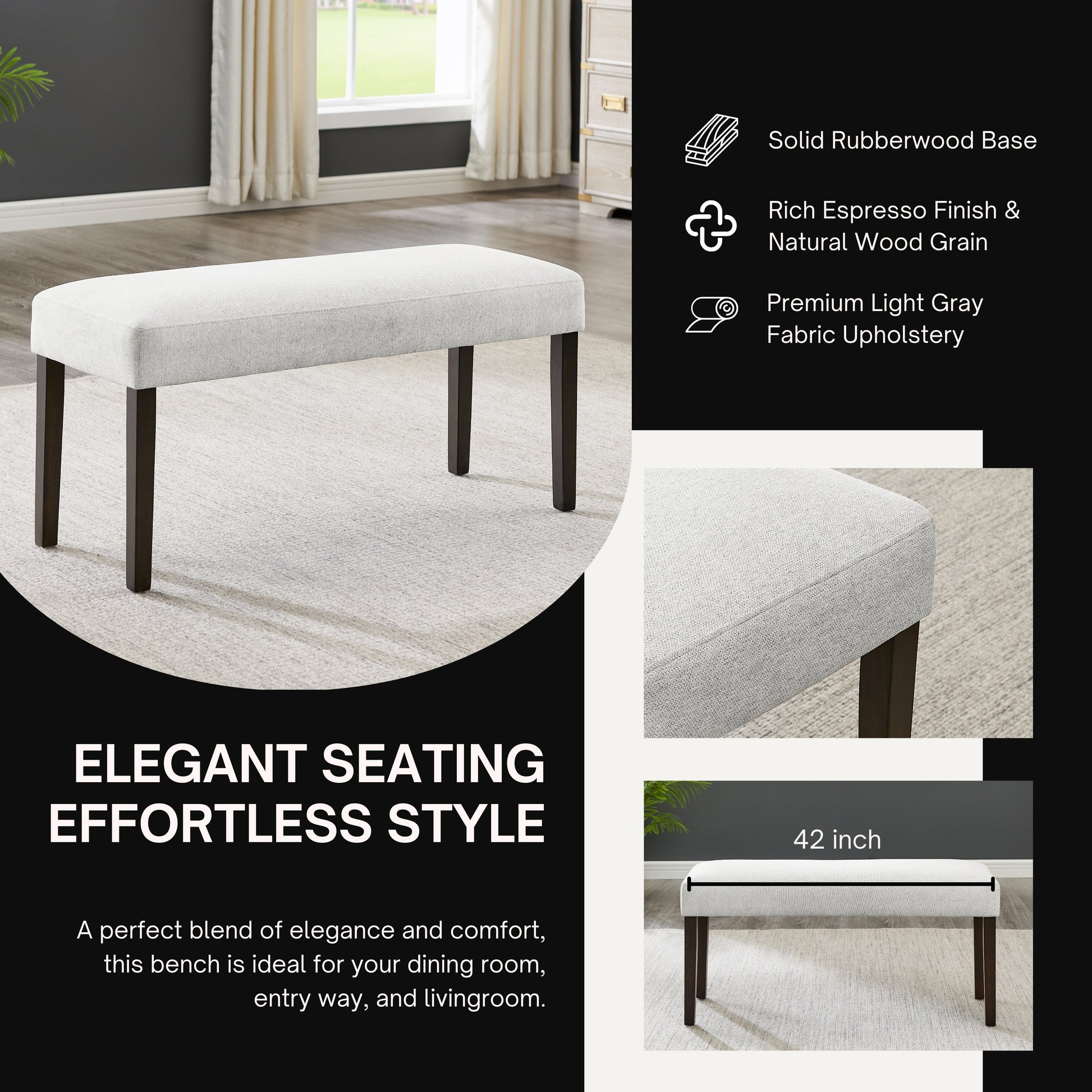 Introducing the Roundhill Furniture Madison Contemporary Upholstered Dining Bench - perfectly blend luxury, comfort, and durability. The bench is a visual treat that adds a striking touch to any space. Wrapped in a light gray fabric, it provides a cozy embrace that fits your shape perfectly. The bench features a breathable fabric for enduring comfort. Rubberwood legs offer uncompromised stability, while built-in floor protectors keep your floors scratch-free.
