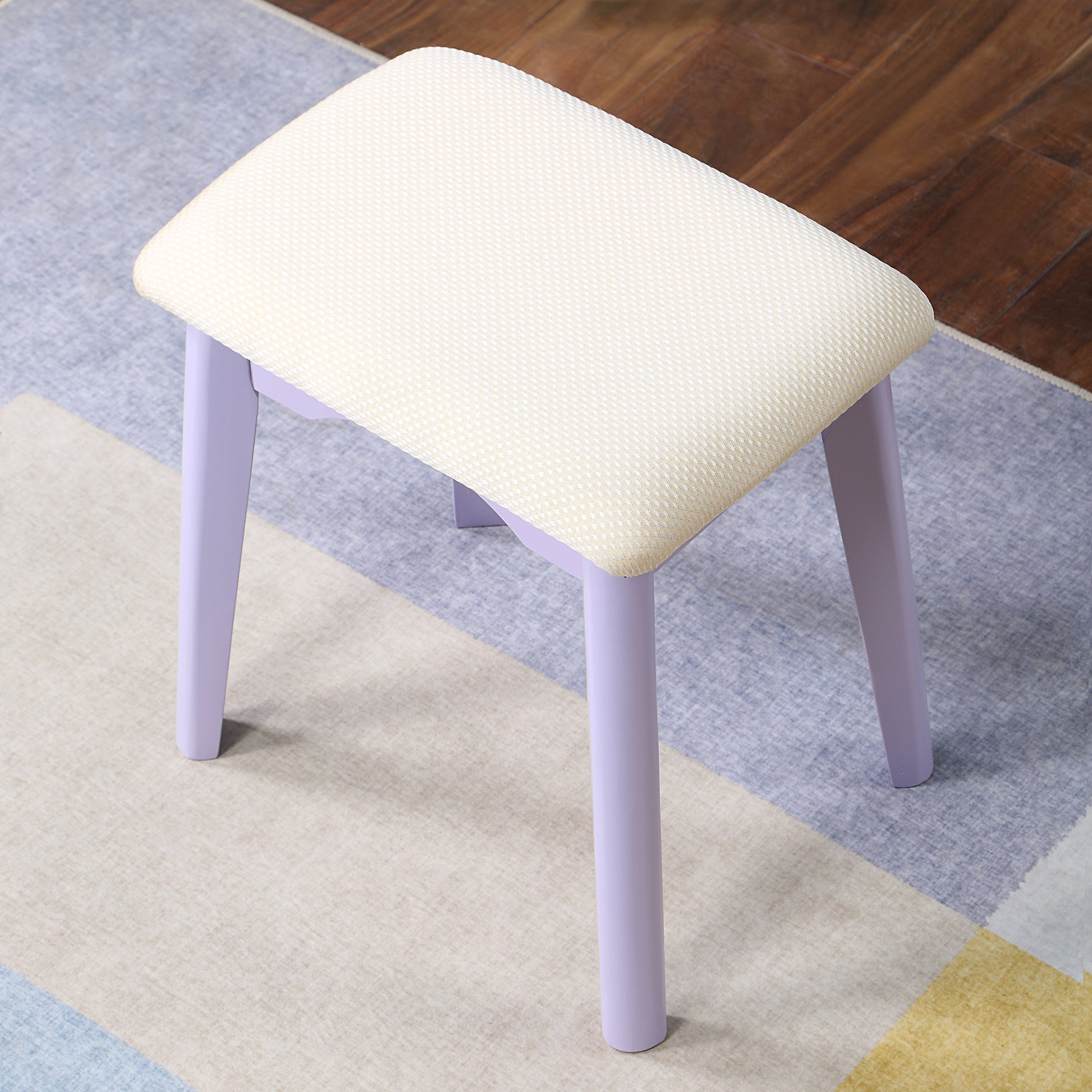 - Set includes a vanity table, round mirror, and matching stool for a complete beauty setup.