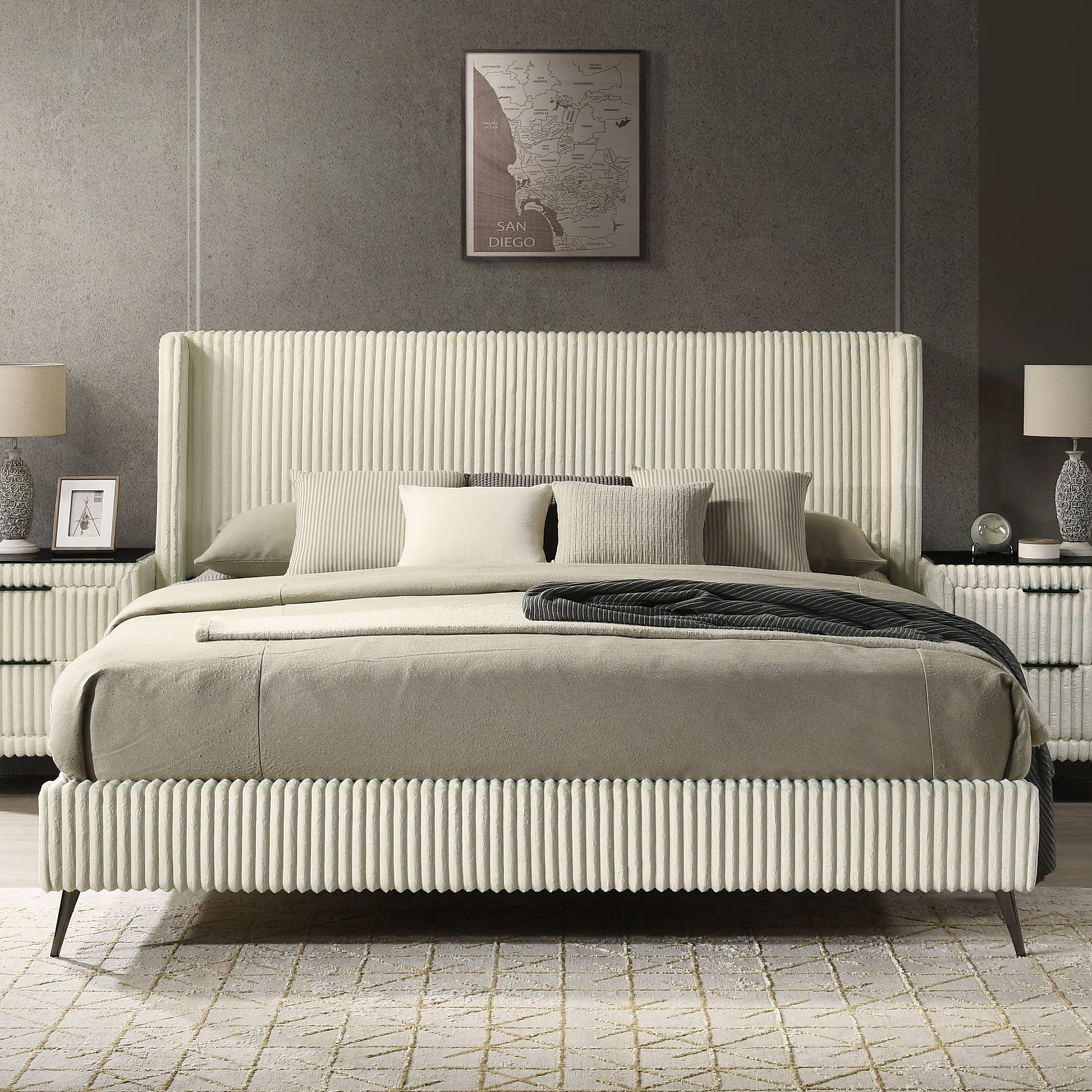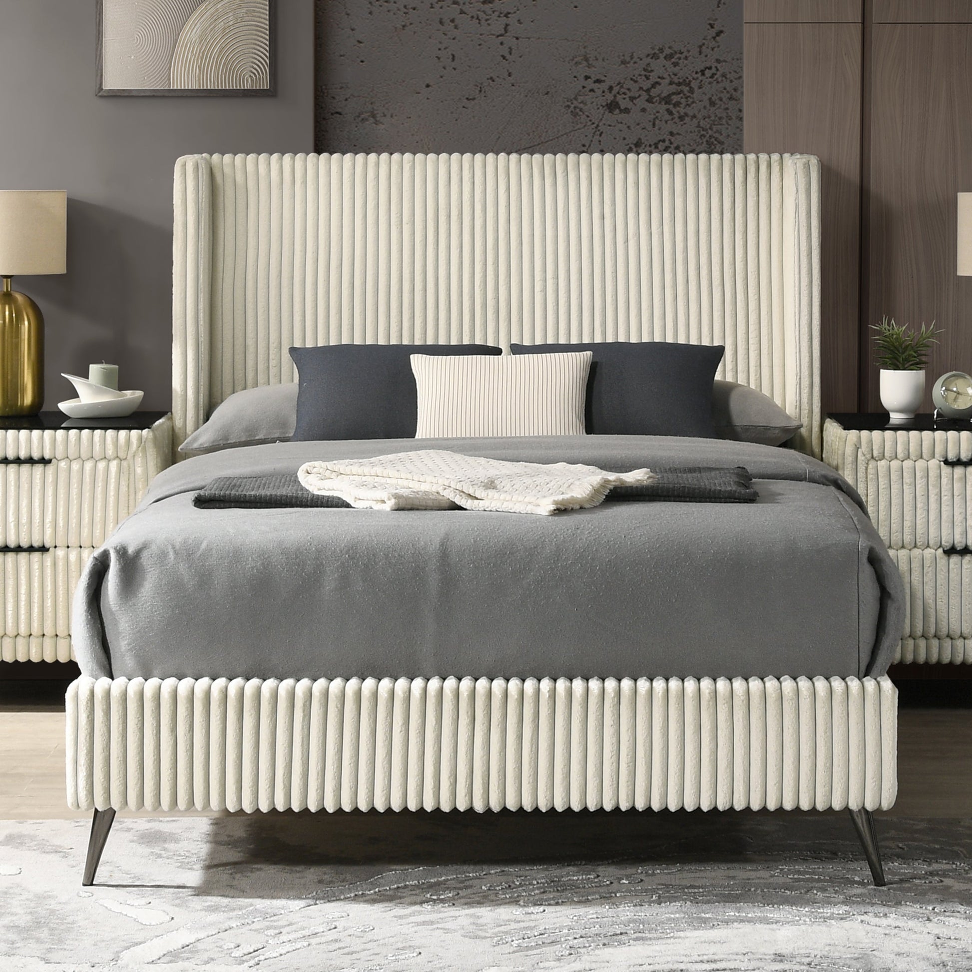 Transform your bedroom into a luxurious haven with the Mavela King/Queen Bed Collection. Available in both king and queen sizes, this stunning panel bed combines modern design with ultimate comfort, making it the perfect centerpiece for any contemporary bedroom decor. Wrapped in soft wide wale corduroy upholstery in a soothing cream color, the Mavela bed offers a luxurious texture that enhances both comfort and aesthetic appeal. The sleek and modern style of the Mavela bed complements contemporary bedroom decor, creating a stylish and inviting atmosphere that you'll love coming home to. The distinctive wing back style headboard not only adds an elegant touch but also provides a comfortable backrest for reading or relaxing in bed.