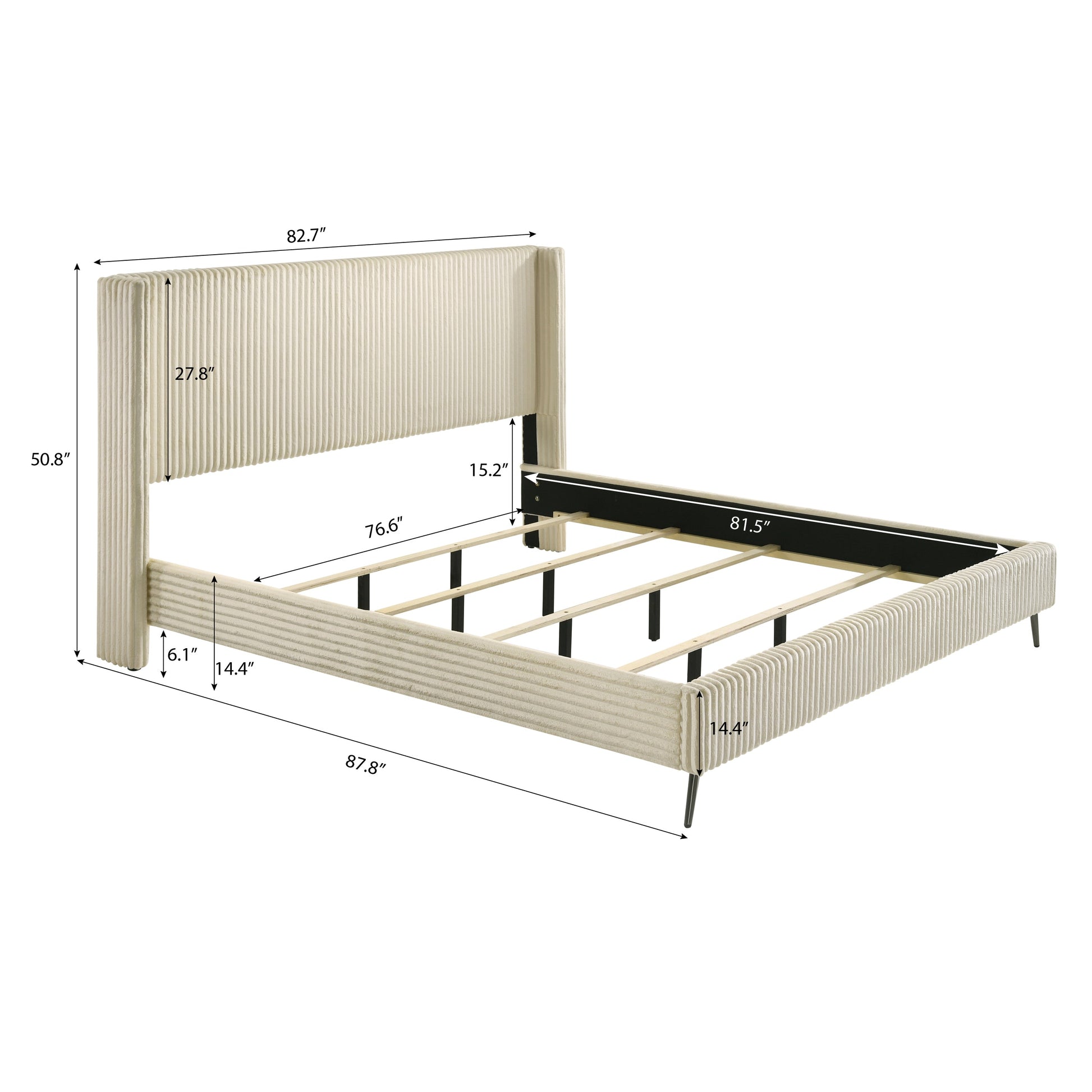 Overall King Bed dimension: 82.7"W x 87.8"D x 50.8"H. Headboard: 82.7"W x 3.5"D x 50.8"H. Footboard: 82.7"W x 2.8"D x 14.4"H. Rail: 85"W x 1"D x 8.3"H. Floor to bottom of the rails: 6.1".